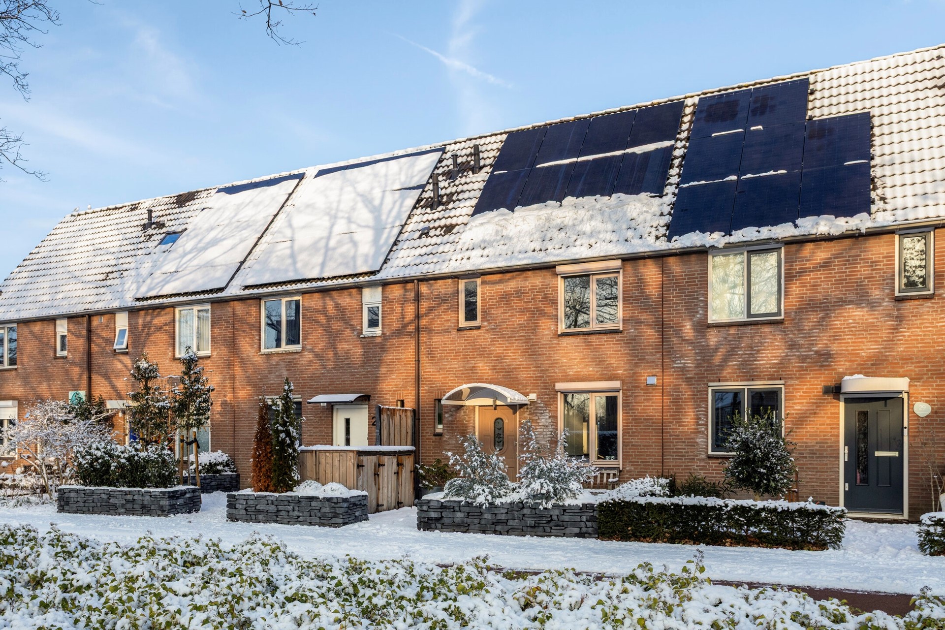 De onderhoudsvriendelijk voortuin (ongeveer 3,5x5,5 meter) is op het zuidwesten georiënteerd. De plantenborders zorgen voor het nodige groen en een gezellig aanzicht van de woning. De handige opslag zorgt dat de vuilnisbakken mooi uit het zicht staan.