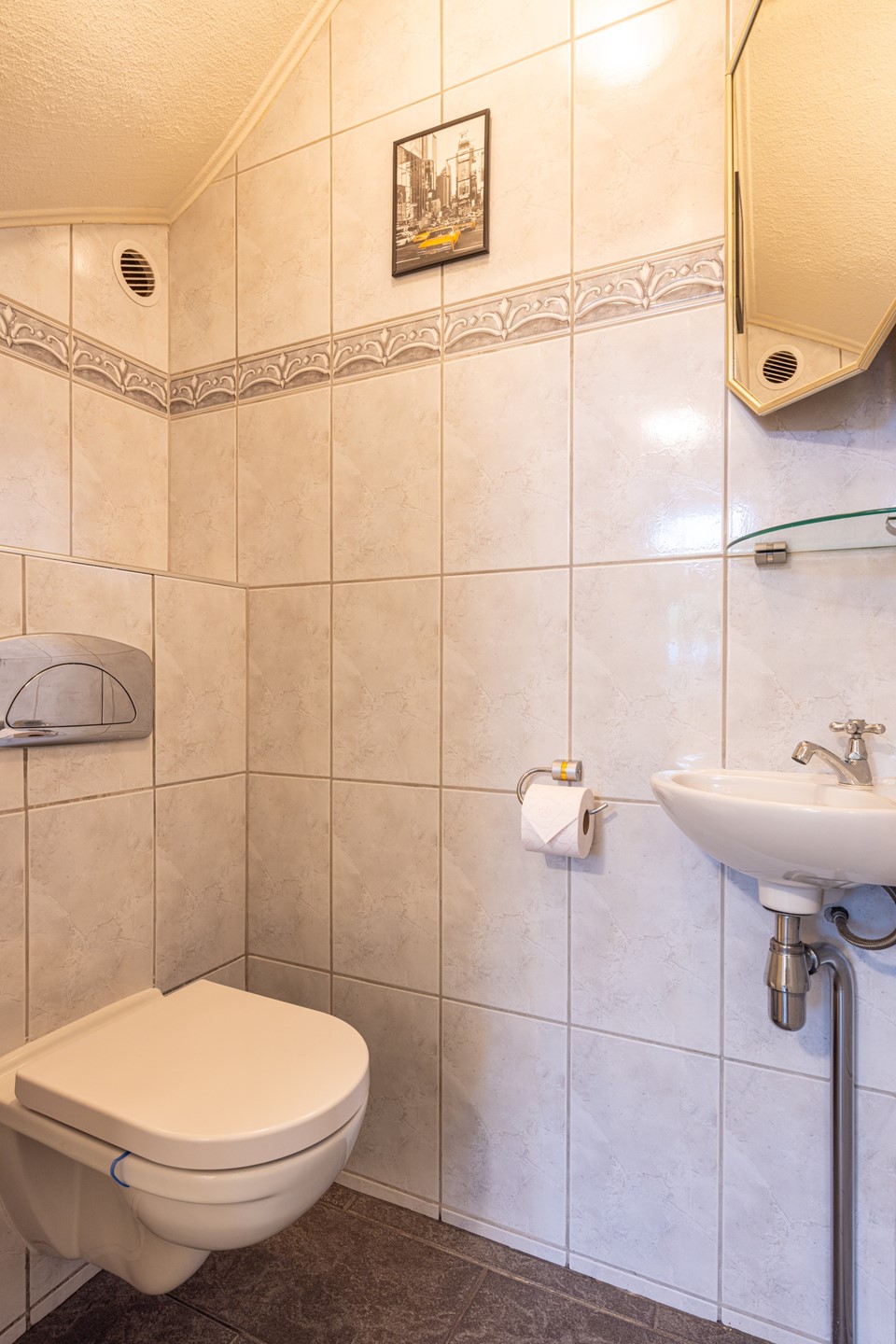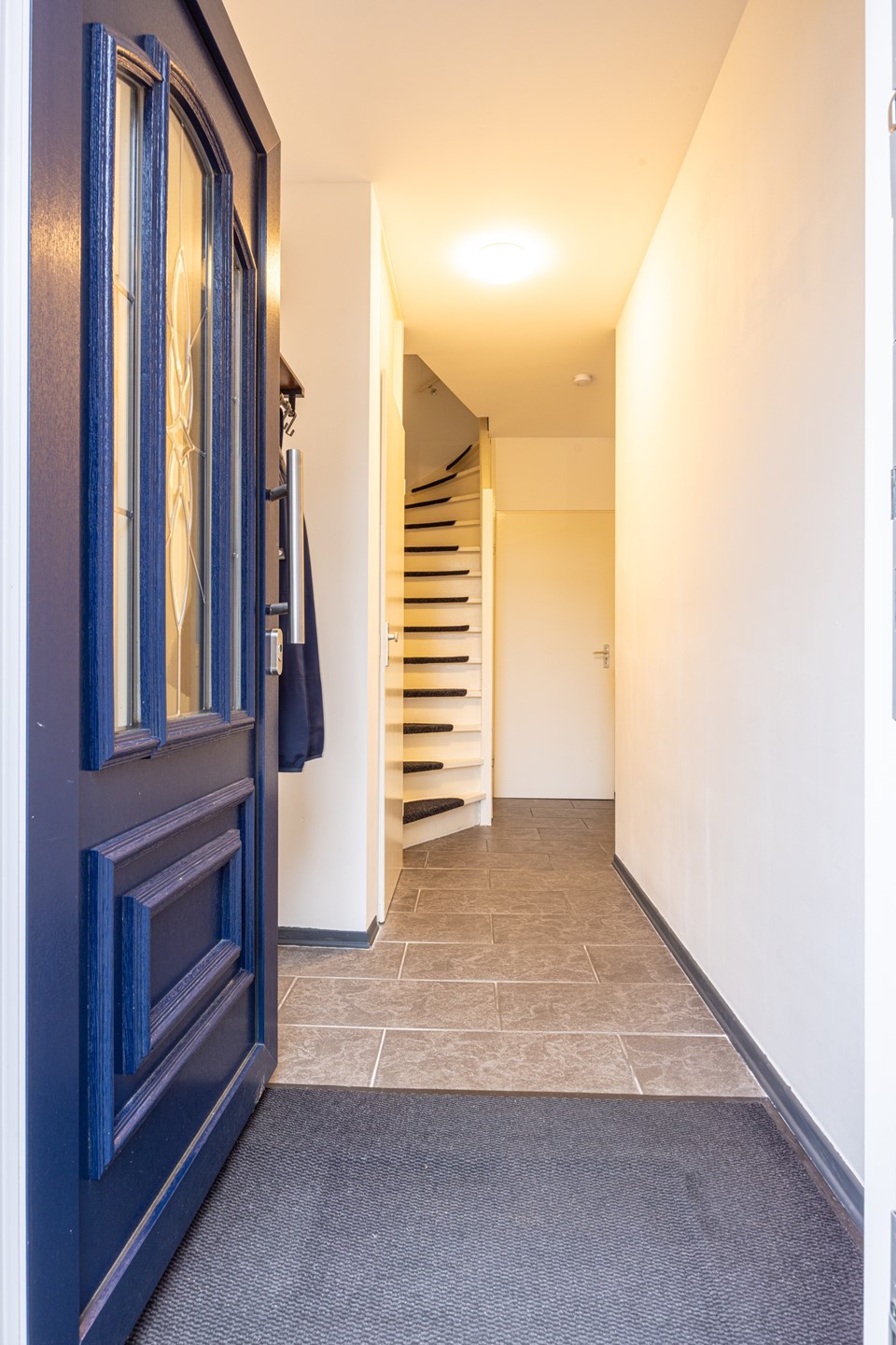 Via de verzorgde voortuin bereikt u de overdekte entree. U komt binnen in de ontvangsthal met tegelvloer, garderoberuimte, meterkast en een modern, zwevend toilet met fonteintje.