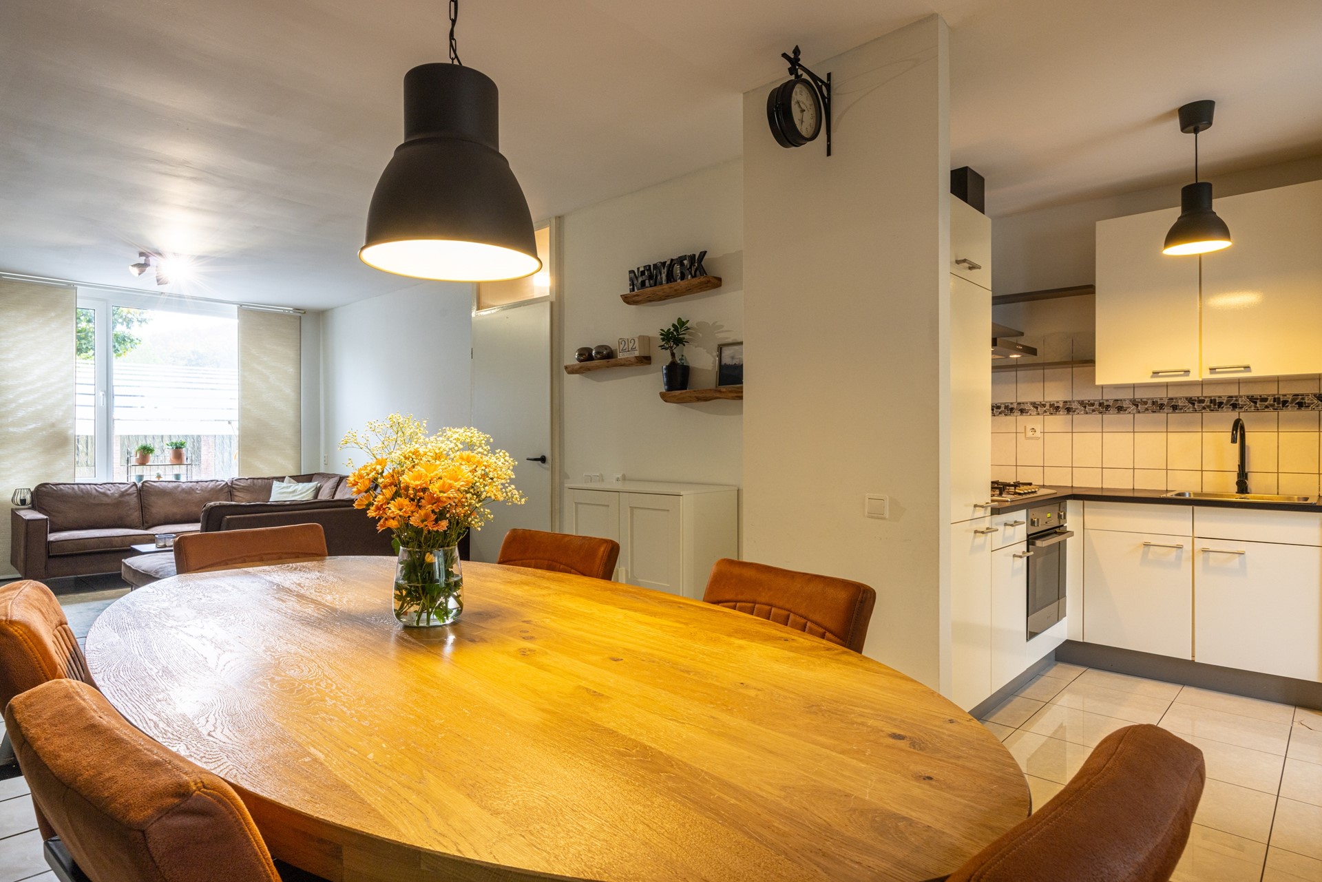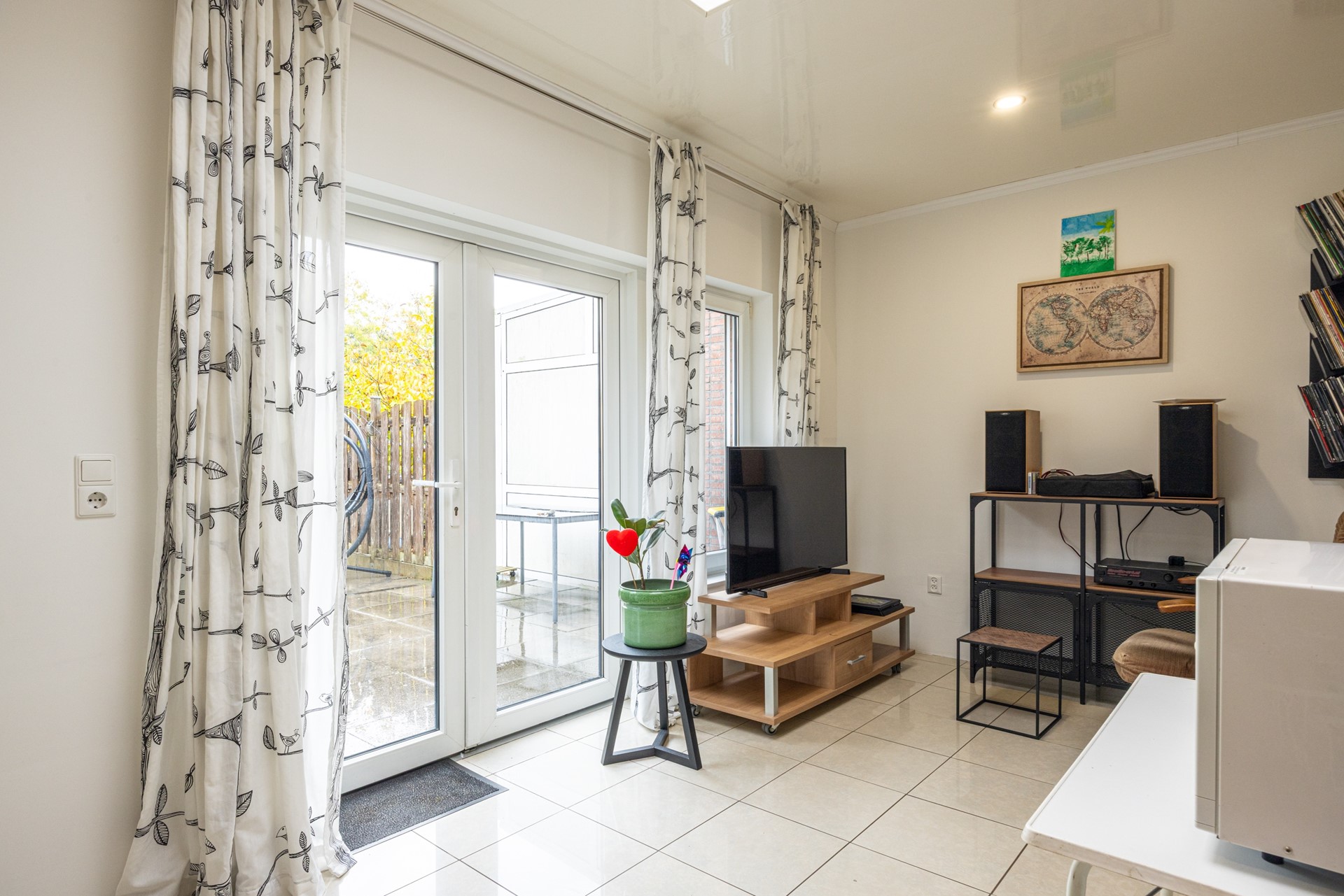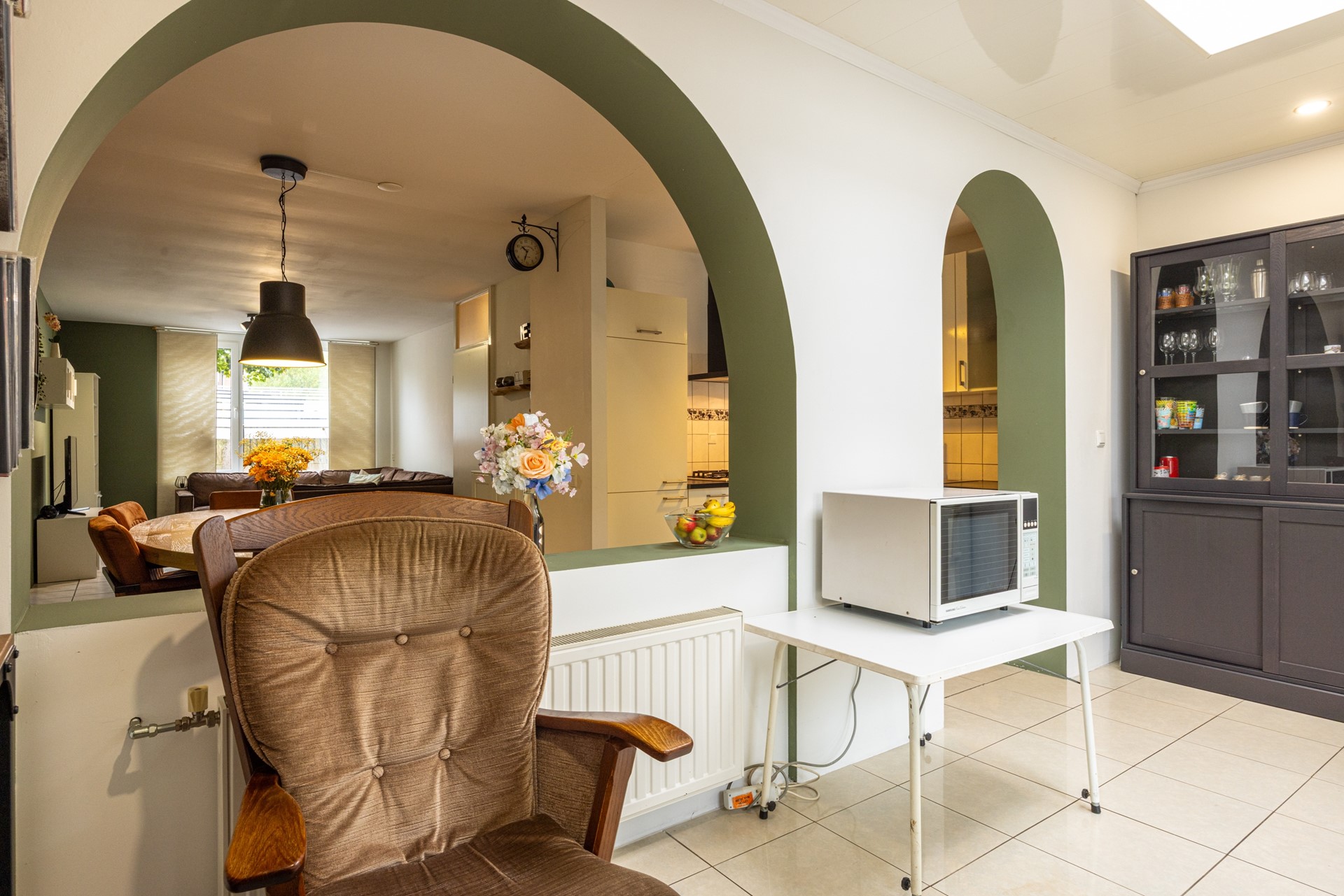 De doorzonwoonkamer is ruim opgezet en geniet van veel daglicht dankzij de grote raampartijen aan voor- en achterzijde. De tegelvloer zorgt voor een frisse en praktische basis, waardoor de ruimte direct prettig aanvoelt. De keuken staat in open verbinding met de woonkamer en beschikt over een hoekopstelling met voldoende kastruimte. Hier kunt u uitstekend uit de voeten met een gasfornuis voorzien van een wokbrander, een afzuigkap, heteluchtoven en een losstaande vaatwasser die achterblijft. Aangrenzend aan de keuken bevindt zich de aanbouw, die door de open verbinding met de woonkamer een volwaardige uitbreiding van de leefruimte is. De kamer is ideaal als eetkamer, thuiswerkplek of speelkamer. Dankzij de aanwezige ramen en openslaande deuren is er volop daglicht en directe toegang tot de achtertuin. Rolluiken zorgen voor extra privacy en comfort.