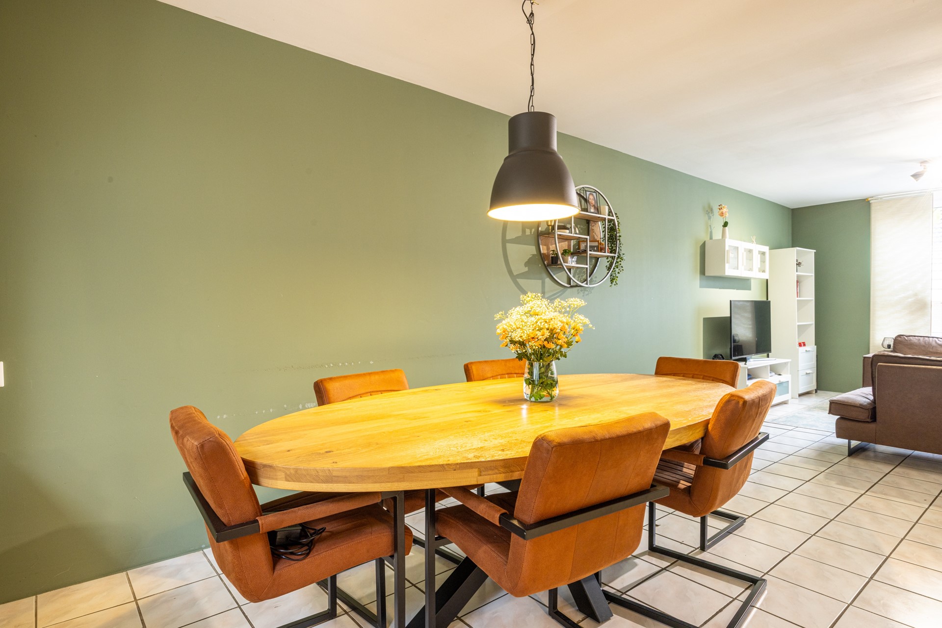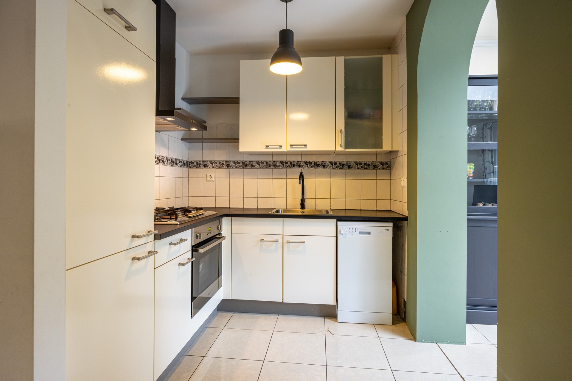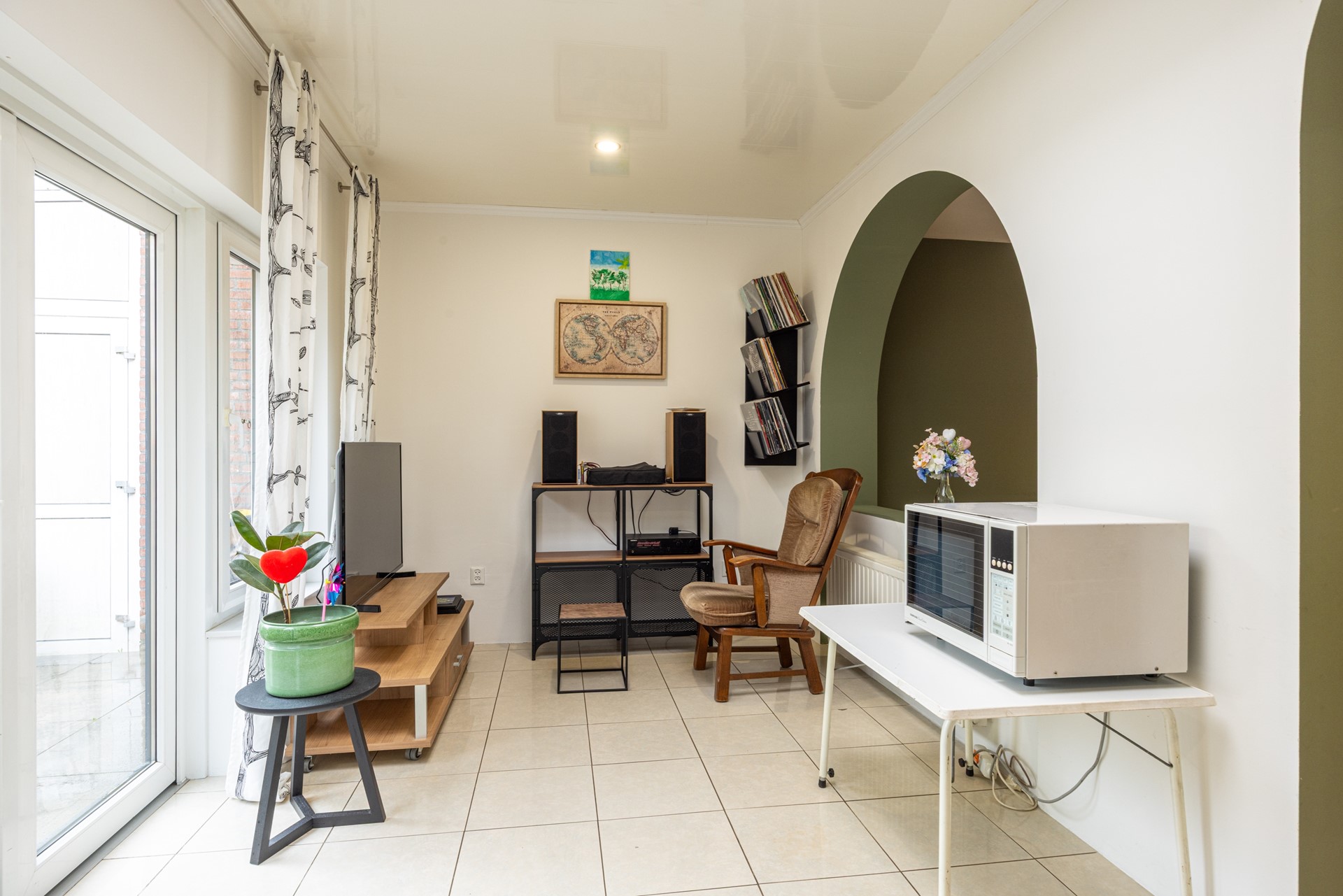 De doorzonwoonkamer is ruim opgezet en geniet van veel daglicht dankzij de grote raampartijen aan voor- en achterzijde. De tegelvloer zorgt voor een frisse en praktische basis, waardoor de ruimte direct prettig aanvoelt. De keuken staat in open verbinding met de woonkamer en beschikt over een hoekopstelling met voldoende kastruimte. Hier kunt u uitstekend uit de voeten met een gasfornuis voorzien van een wokbrander, een afzuigkap, heteluchtoven en een losstaande vaatwasser die achterblijft. Aangrenzend aan de keuken bevindt zich de aanbouw, die door de open verbinding met de woonkamer een volwaardige uitbreiding van de leefruimte is. De kamer is ideaal als eetkamer, thuiswerkplek of speelkamer. Dankzij de aanwezige ramen en openslaande deuren is er volop daglicht en directe toegang tot de achtertuin. Rolluiken zorgen voor extra privacy en comfort.