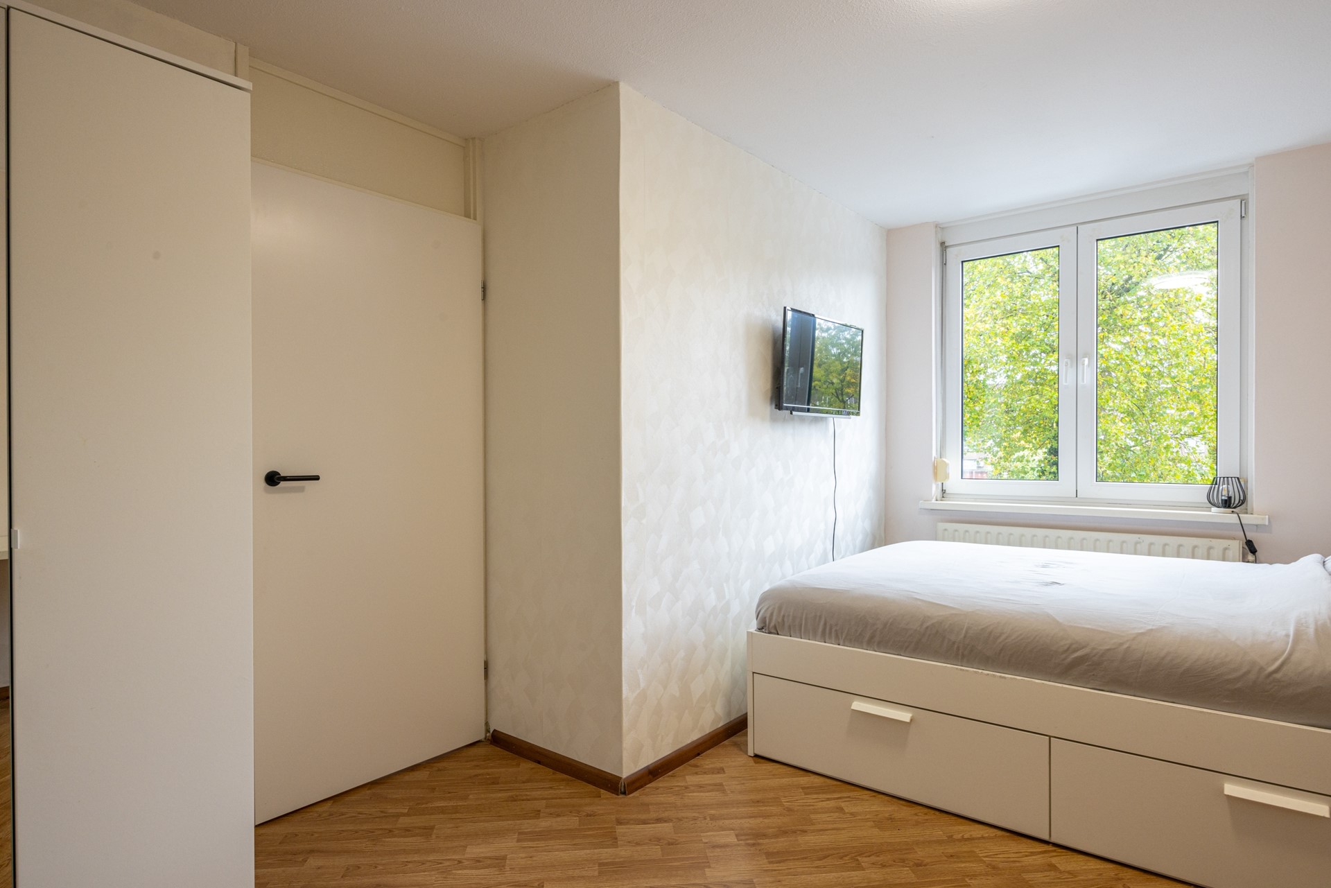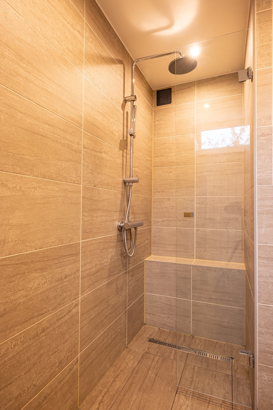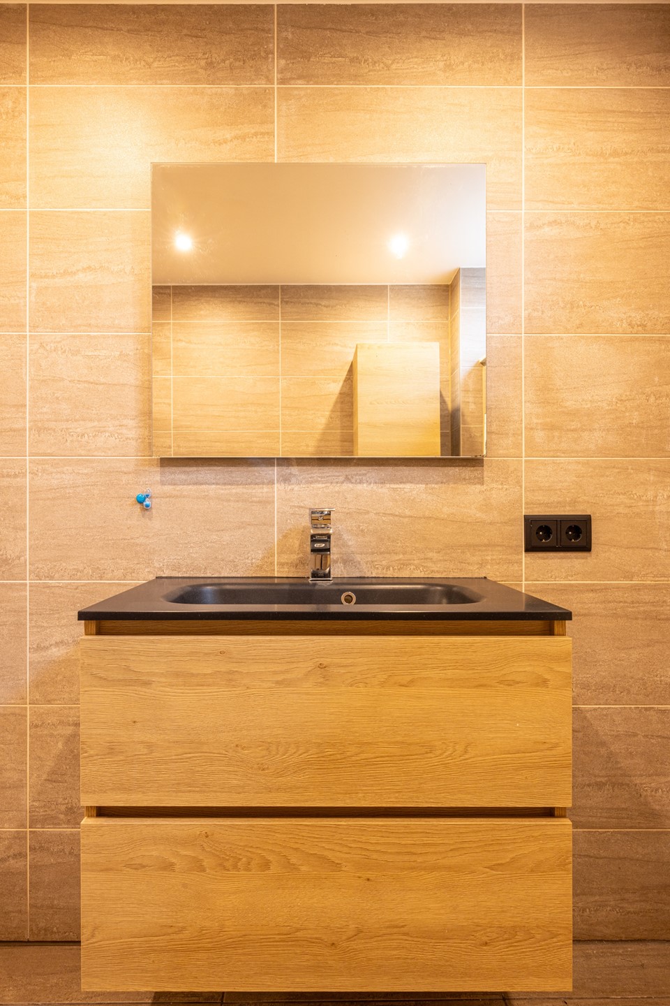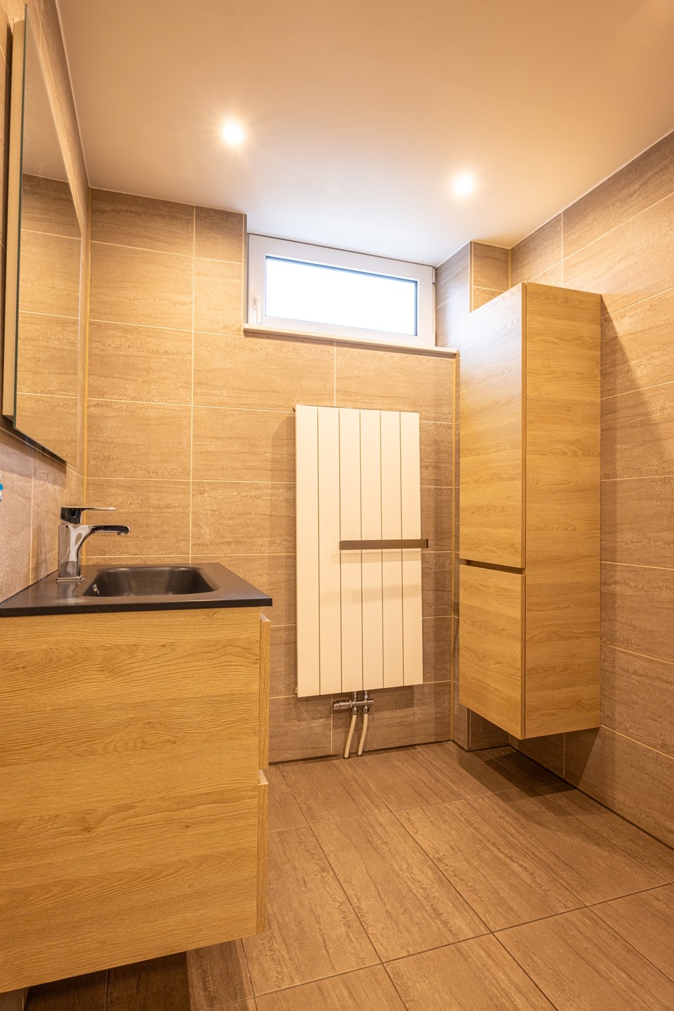 De badkamer is keurig afgewerkt en volledig betegeld in een tijdloze stijl. U beschikt hier over een comfortabele inloopdouche, een modern badkamermeubel met lades, een brede wastafel en een bijpassende spiegel. De designradiator zorgt voor een aangename warmte en maakt de ruimte compleet. Een fijne plek om de dag fris te beginnen én ontspannen af te sluiten.