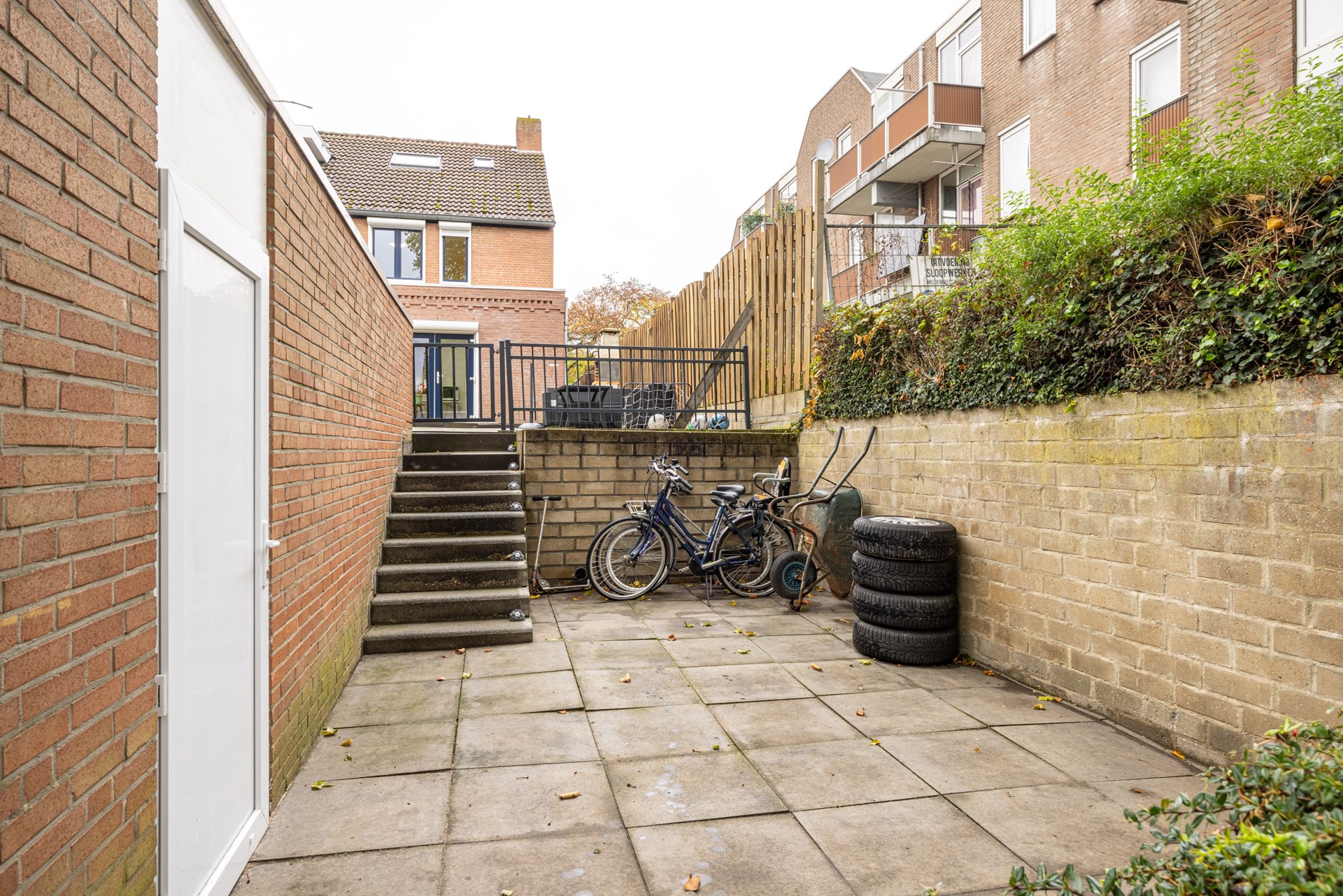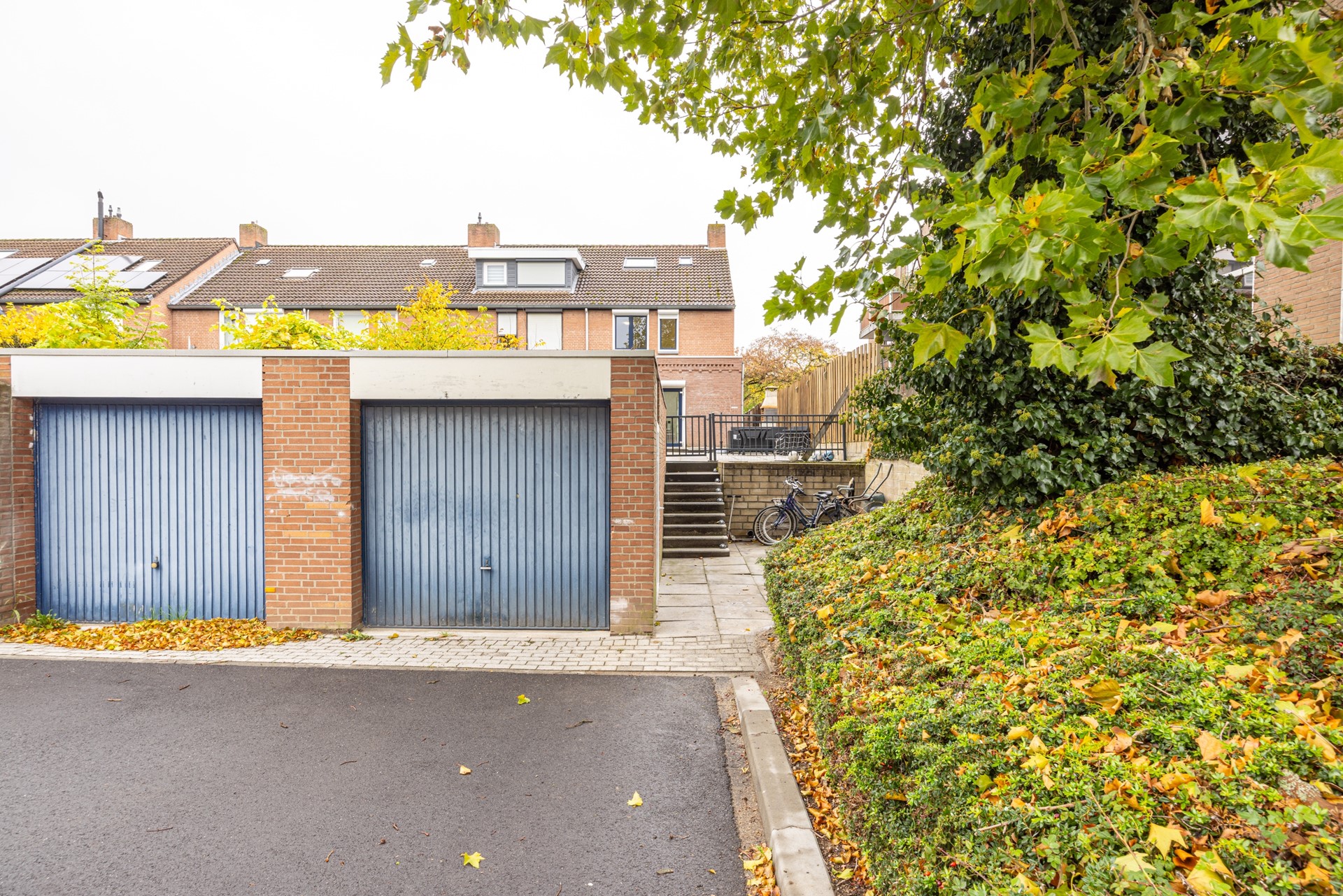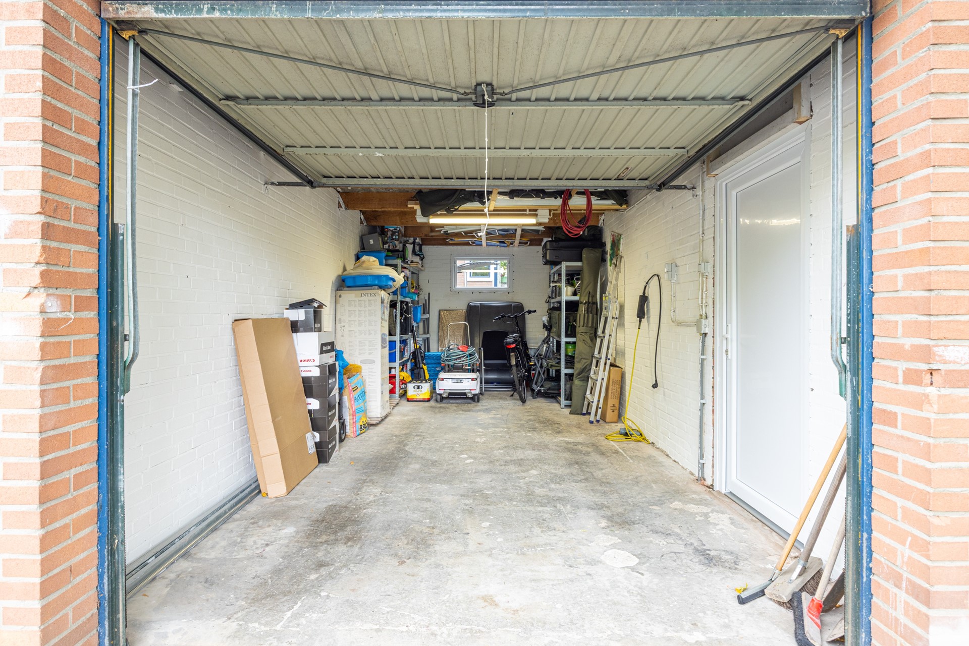 Aan de achterzijde ligt de garage, iets lager ten opzichte van het perceel en bereikbaar via een trap. De garage is voorzien van elektra en een kantelpoort — ideaal voor het stallen van een auto, (elektrische) fietsen of het opbergen van gereedschap en hobbymateriaal.