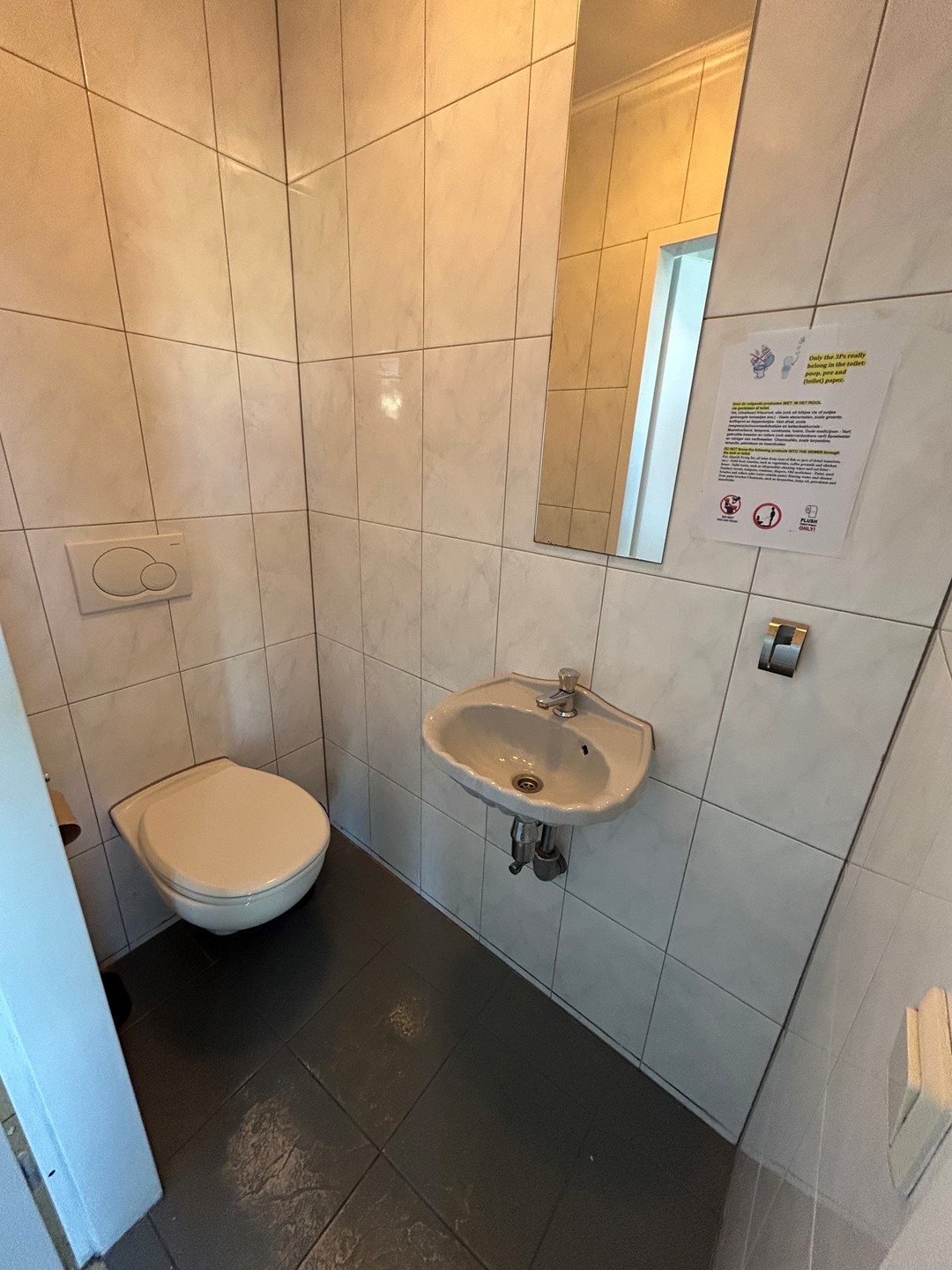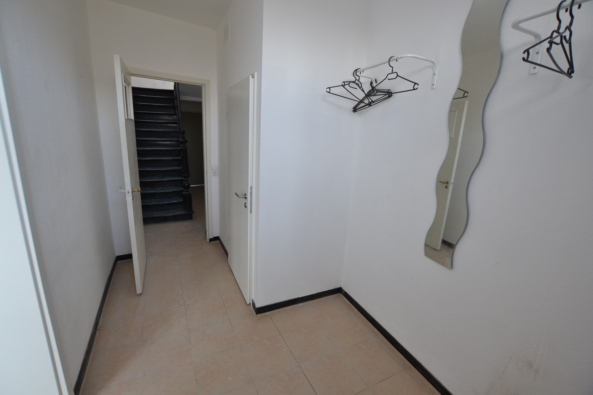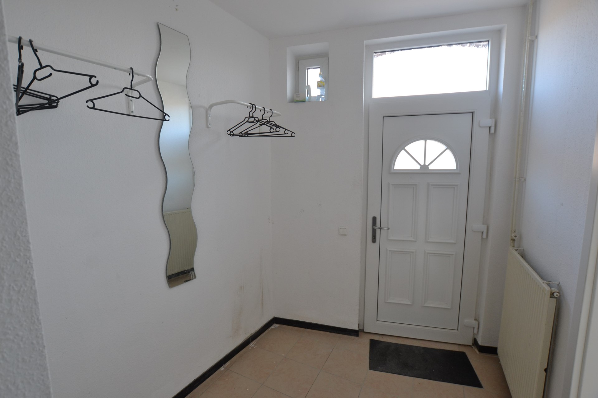 Entree/gang met plavuizenvloer, garderobehoek, gastentoilet met hangtoilet en fonteintje, twee deuren naar woonkamer, deur naar kelder en achtertuin en trap naar verdieping.