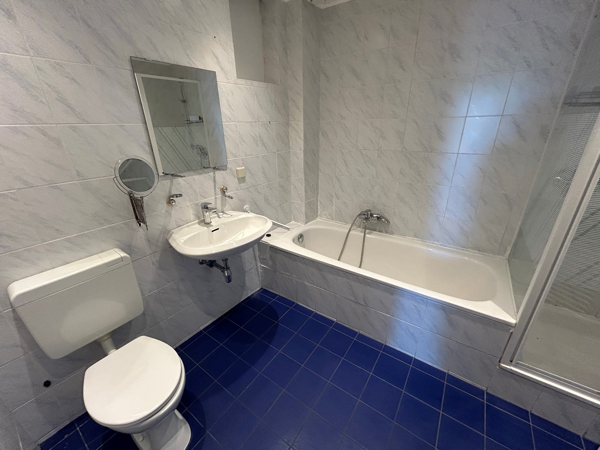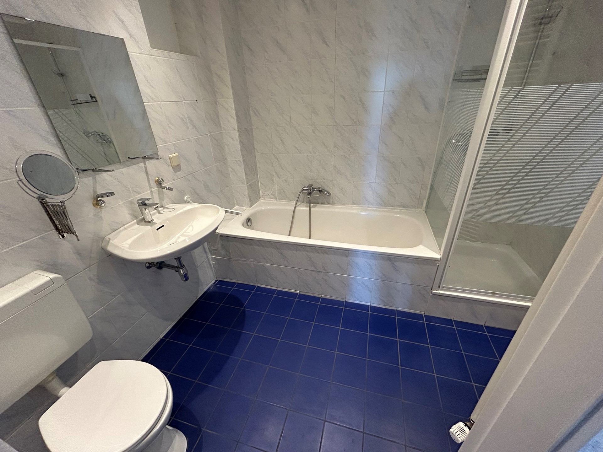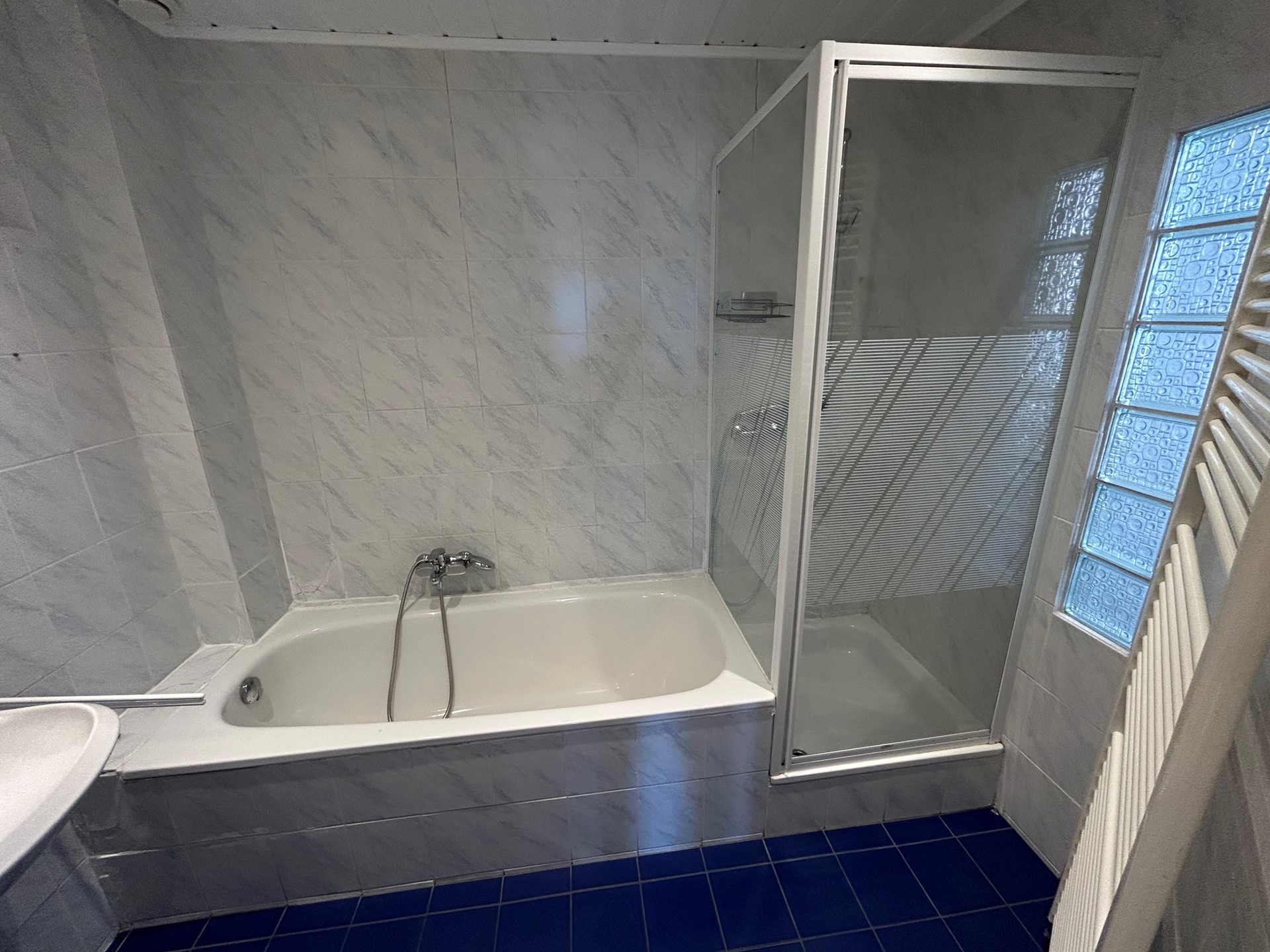 Badkamer 2,65 x 2,45/1,10 met plavuizenvloer, inbouwspots, ligbad, douche met cabine, duoblok, wastafel en design radiator.