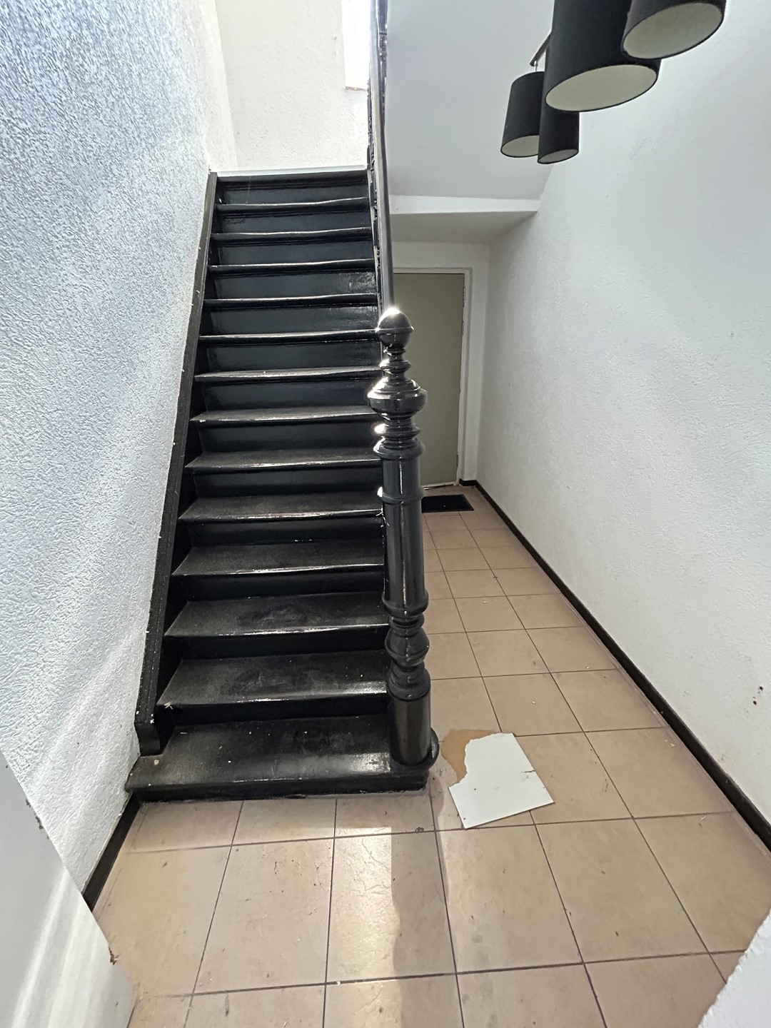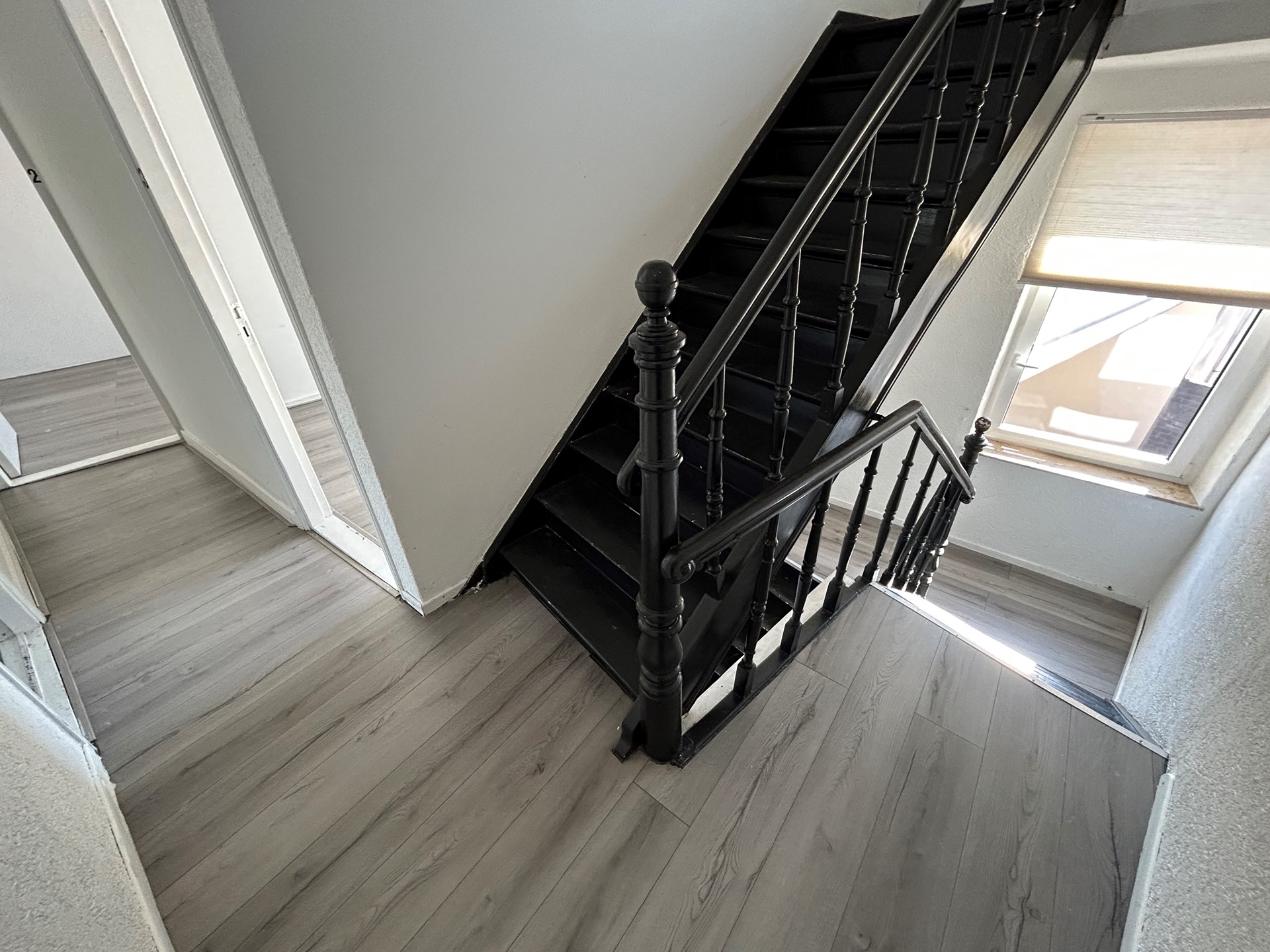 Overloop met plankenvloer en vaste trap naar tweede verdieping.