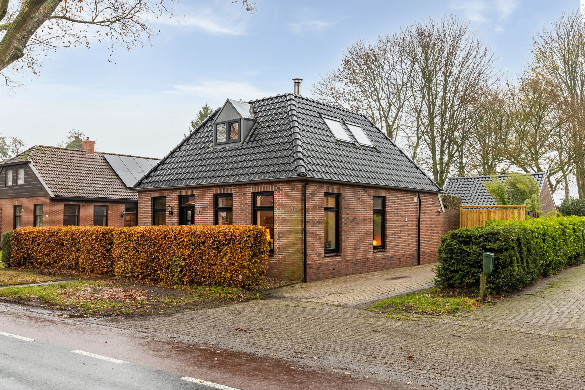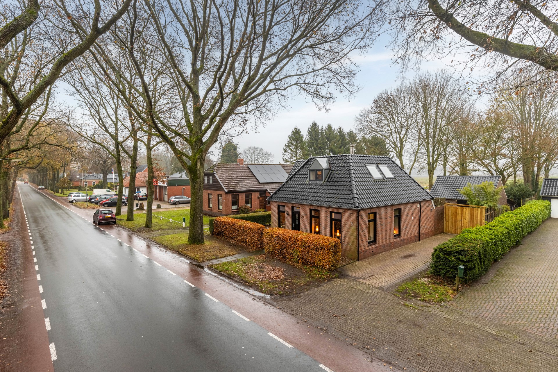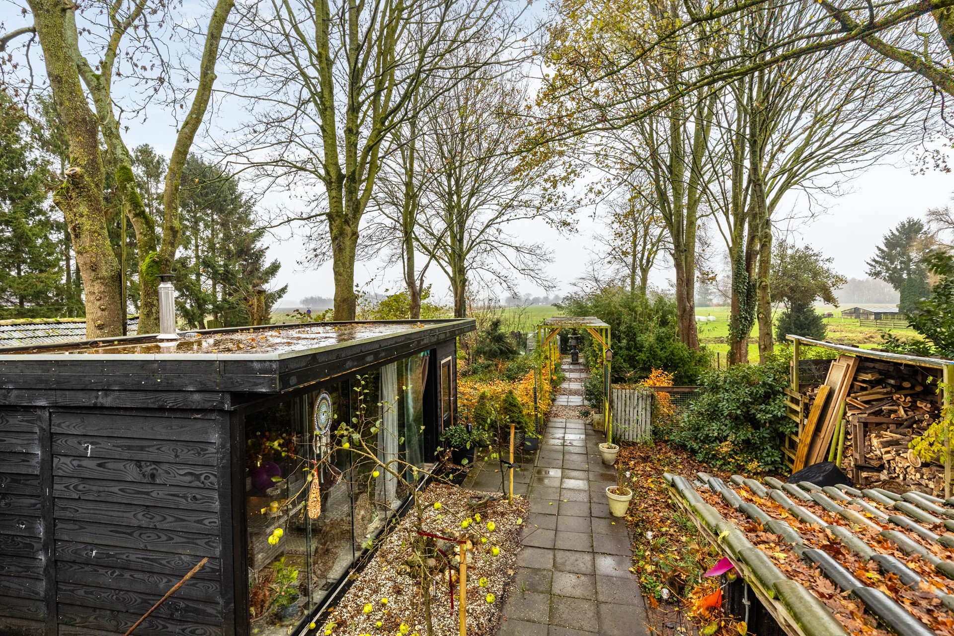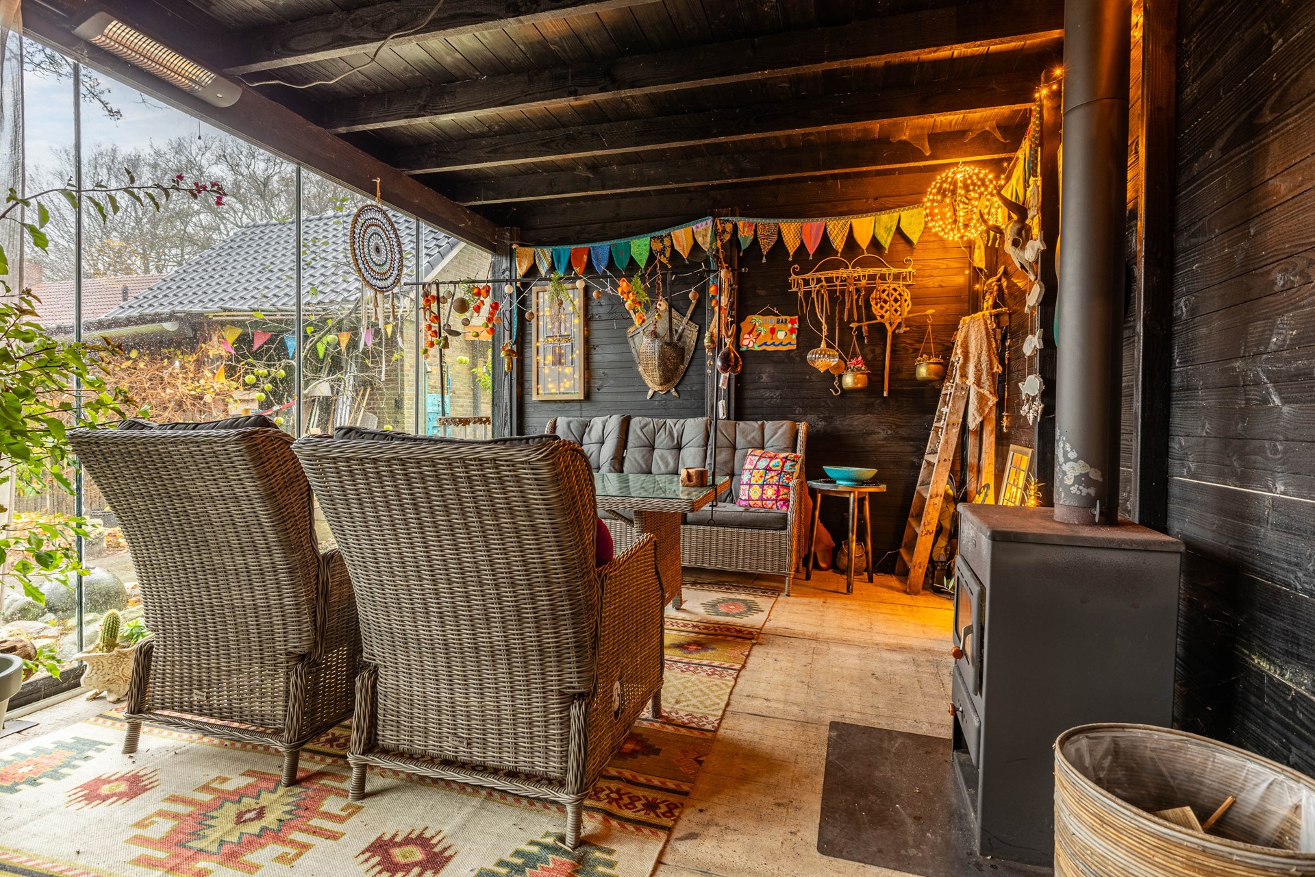 Aan de voorzijde ligt een fraai aangelegde voortuin met oprit. De achterzijde van de woning verrast met een diepe, grotendeels omheinde achtertuin die veel privacy en mogelijkheden biedt. Hier vind je een garage met zolderverdieping, een separate berging, een overkapping met open zijkanten en een luxe tuinkamer met glazen wanden, houtkachel en stroomvoorziening.