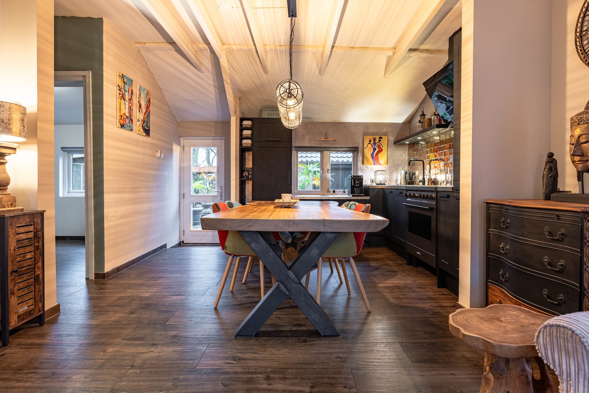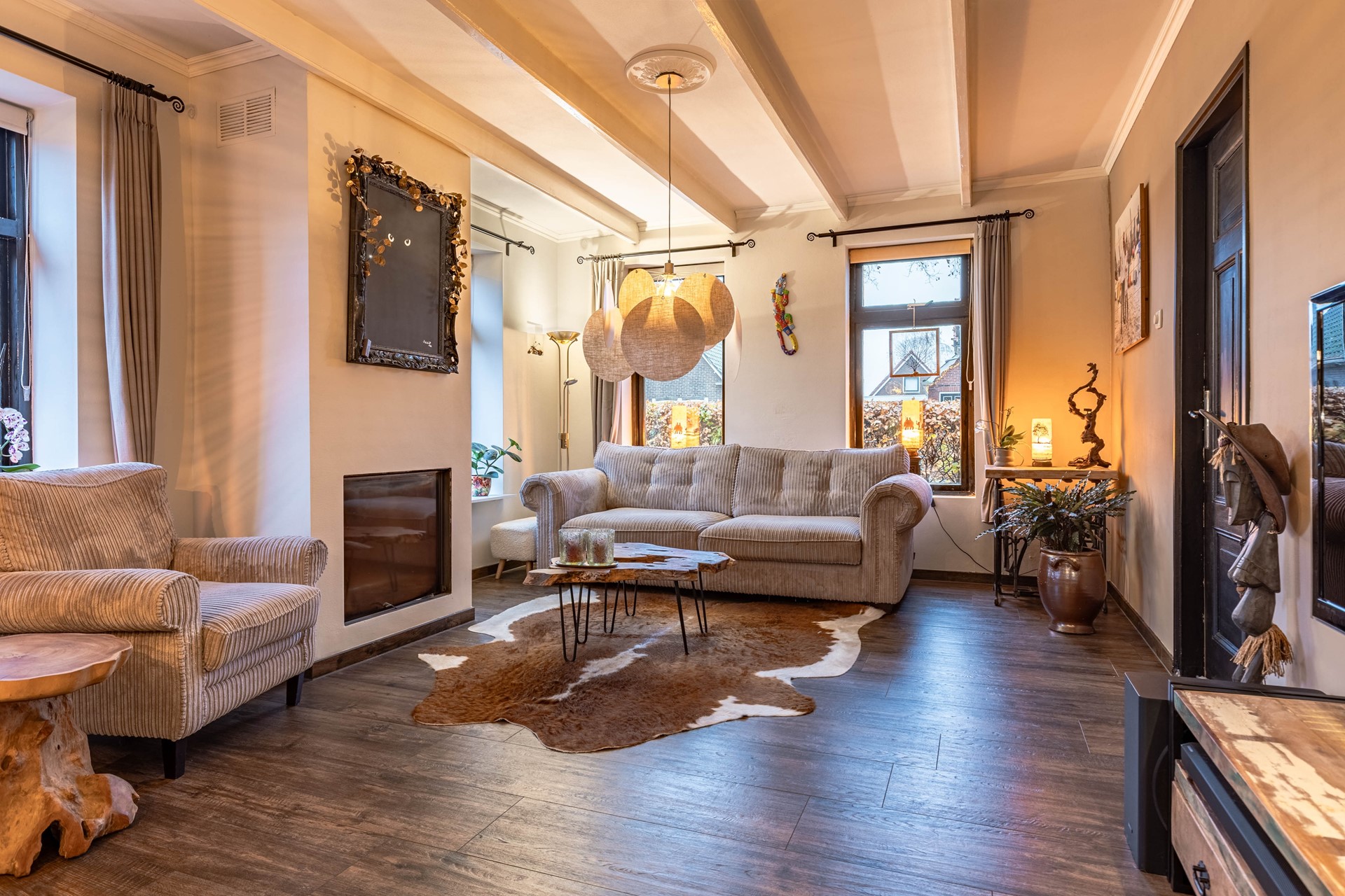 De ruime woonkamer met vloerverwarming en ingebouwde open haard vormt het hart van de benedenverdieping en sluit naadloos aan op de open keuken, die is uitgerust met een kookplaat, koelkast en oven.