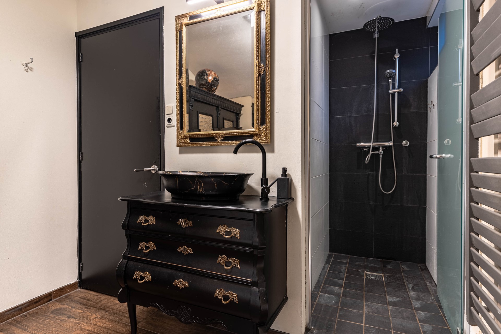 Daarnaast bevindt zich op de begane grond een moderne badkamer met inloopdouche en stijlvol wastafelmeubel, evenals een separaat toilet.