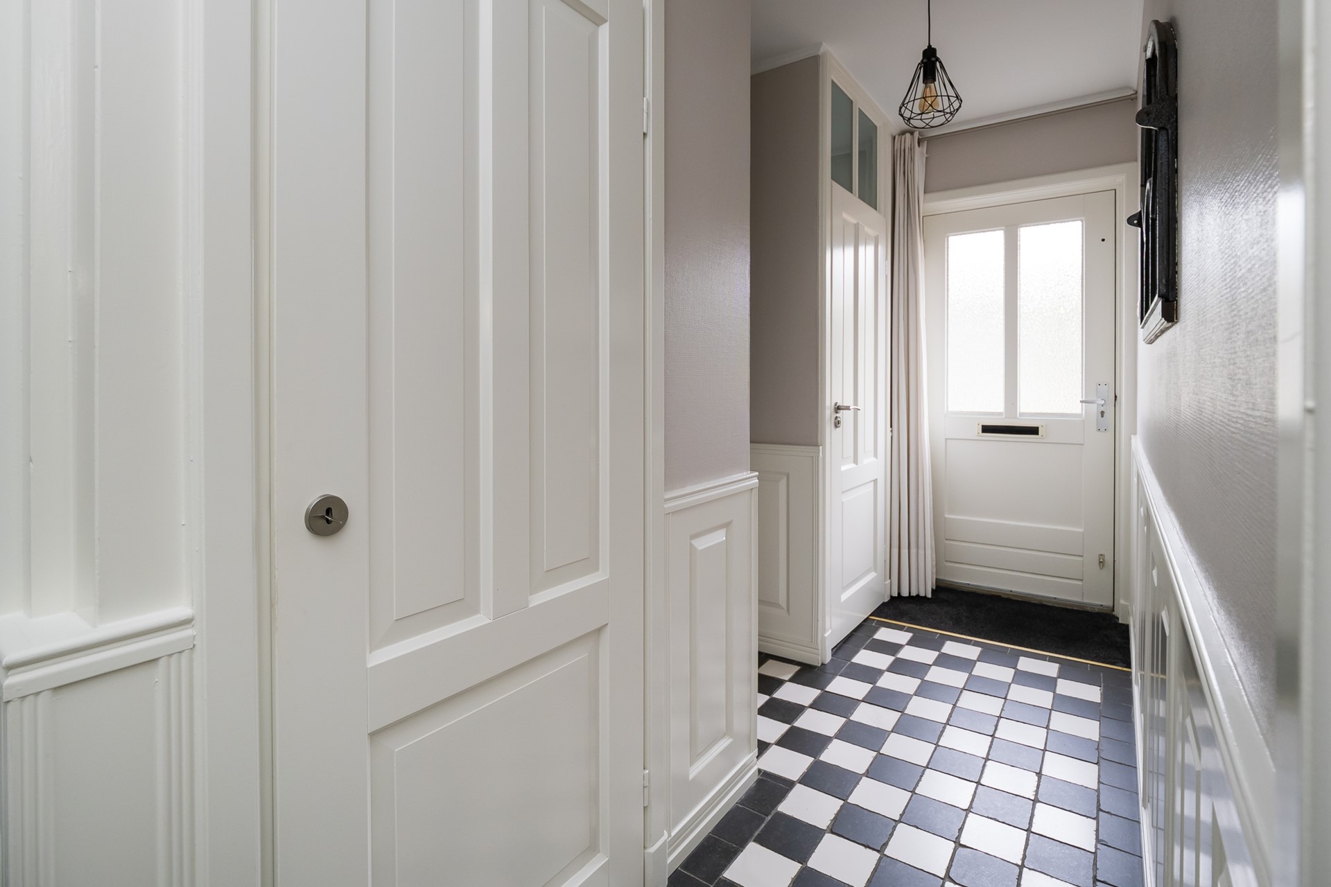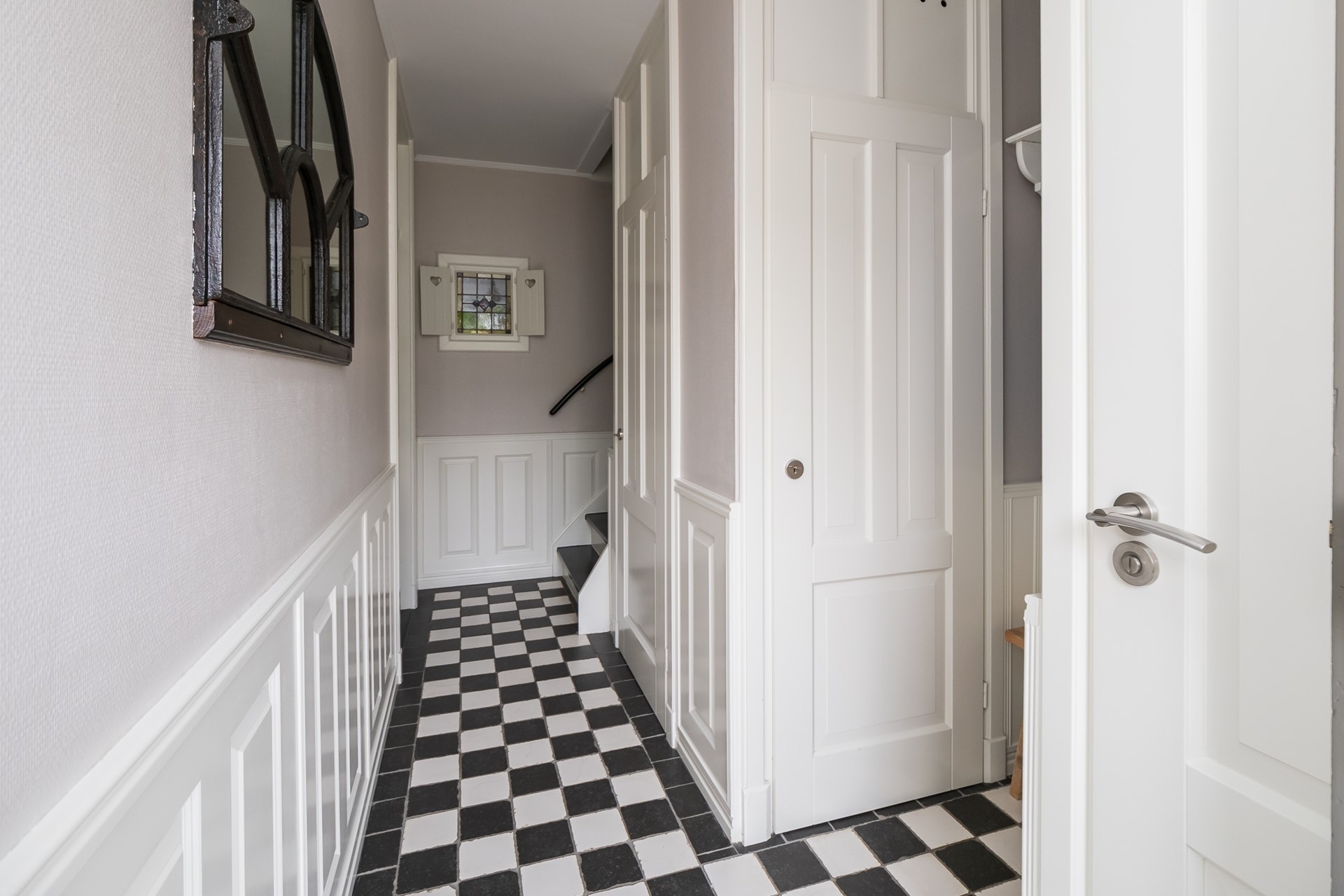 Via de overdekte entree stap je binnen in de stijlvolle ontvangsthal. De hoogwaardige afwerking springt direct in het oog; tegels in blokmotief, strakke finish van wanden en plafond, lambrisering en luxe paneeldeuren vormen een harmonieus geheel. Leuk element is het glas-in-lood venstertje in de scheidingswand met de living. Je vindt in deze hal de toiletruimte, garderobenis, meterkast (2014), trapopgang en de trapkast. De toiletruimte is uitgevoerd met een staand toilet, fontein en een ontluchtingsraam. De klassieke kastenwand strekt zich uit over de