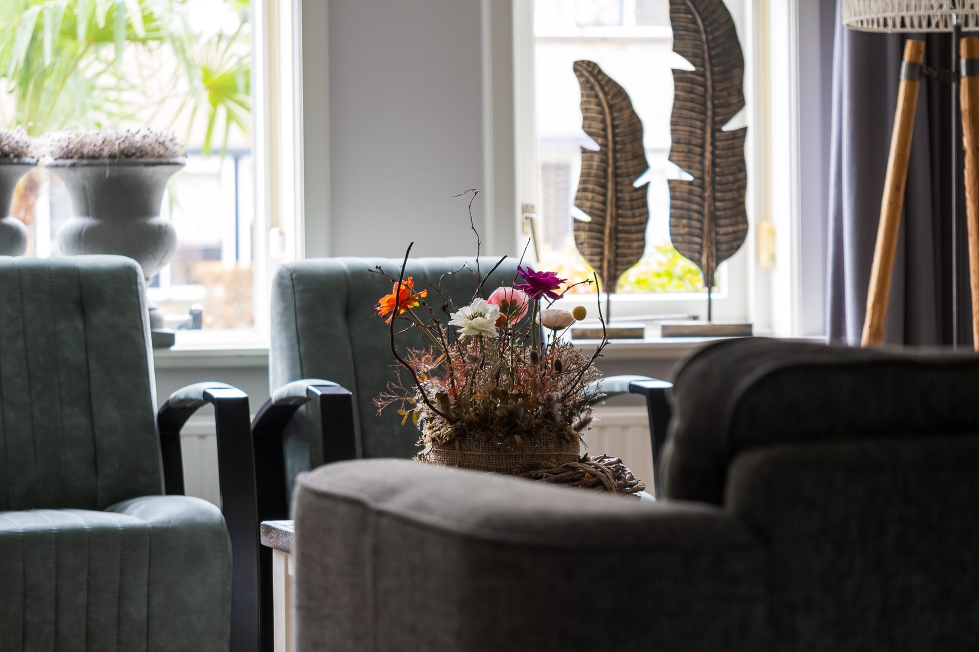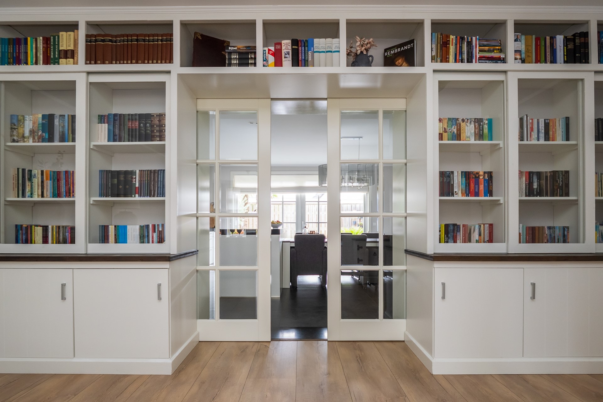 De ruime L-vormige living voelt sfeervol en uitnodigend aan. Brede eikenlook laminaatdelen, glad gestucte wanden en plafond en een klassieke kastenwand geven de ruimte karakter. De ramen in de voorgevel zijn uitgevoerd met vouwgordijnen en elektrisch screens. Je geniet hier van een fijn uitzicht op de charmant aangelegde voortuin.