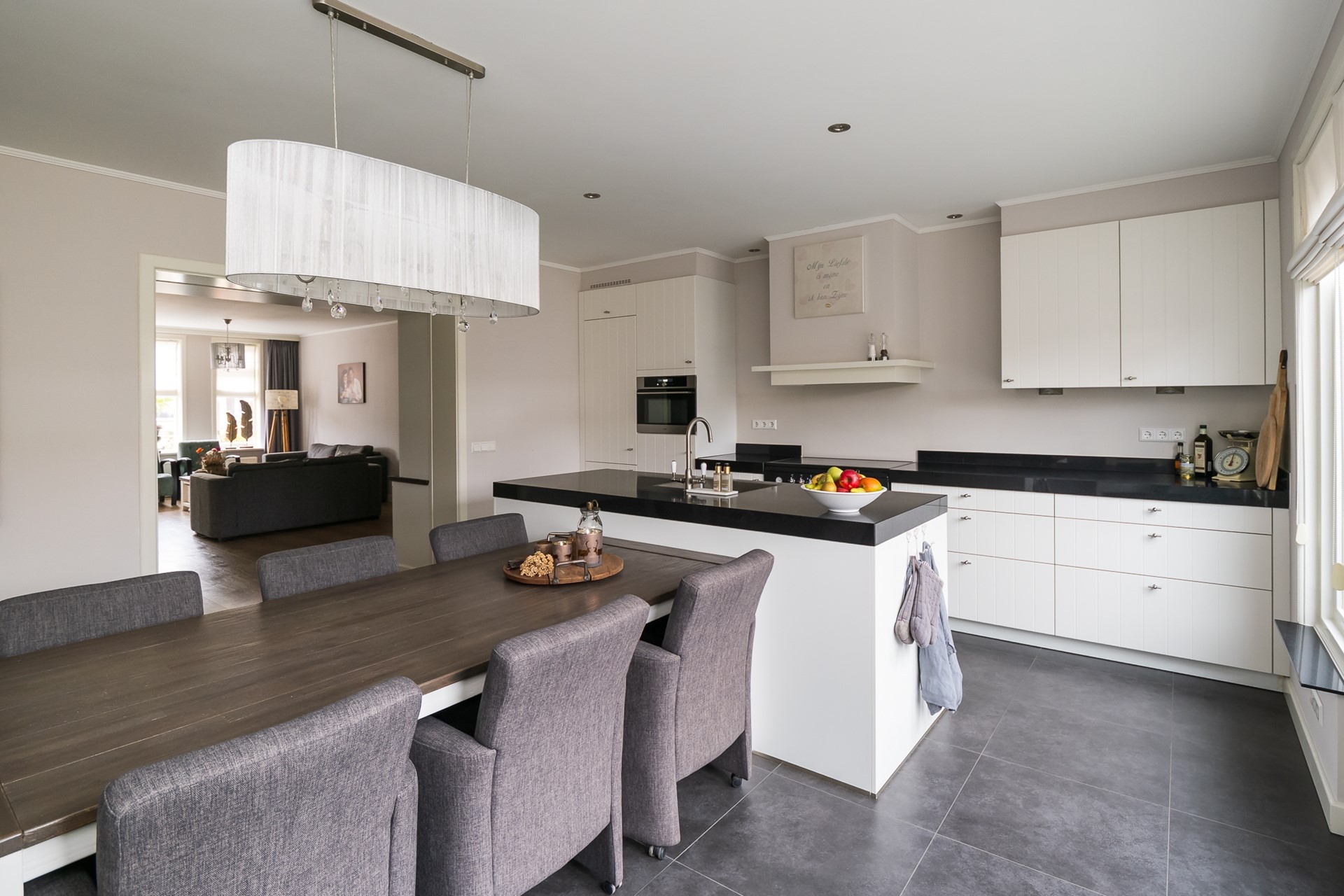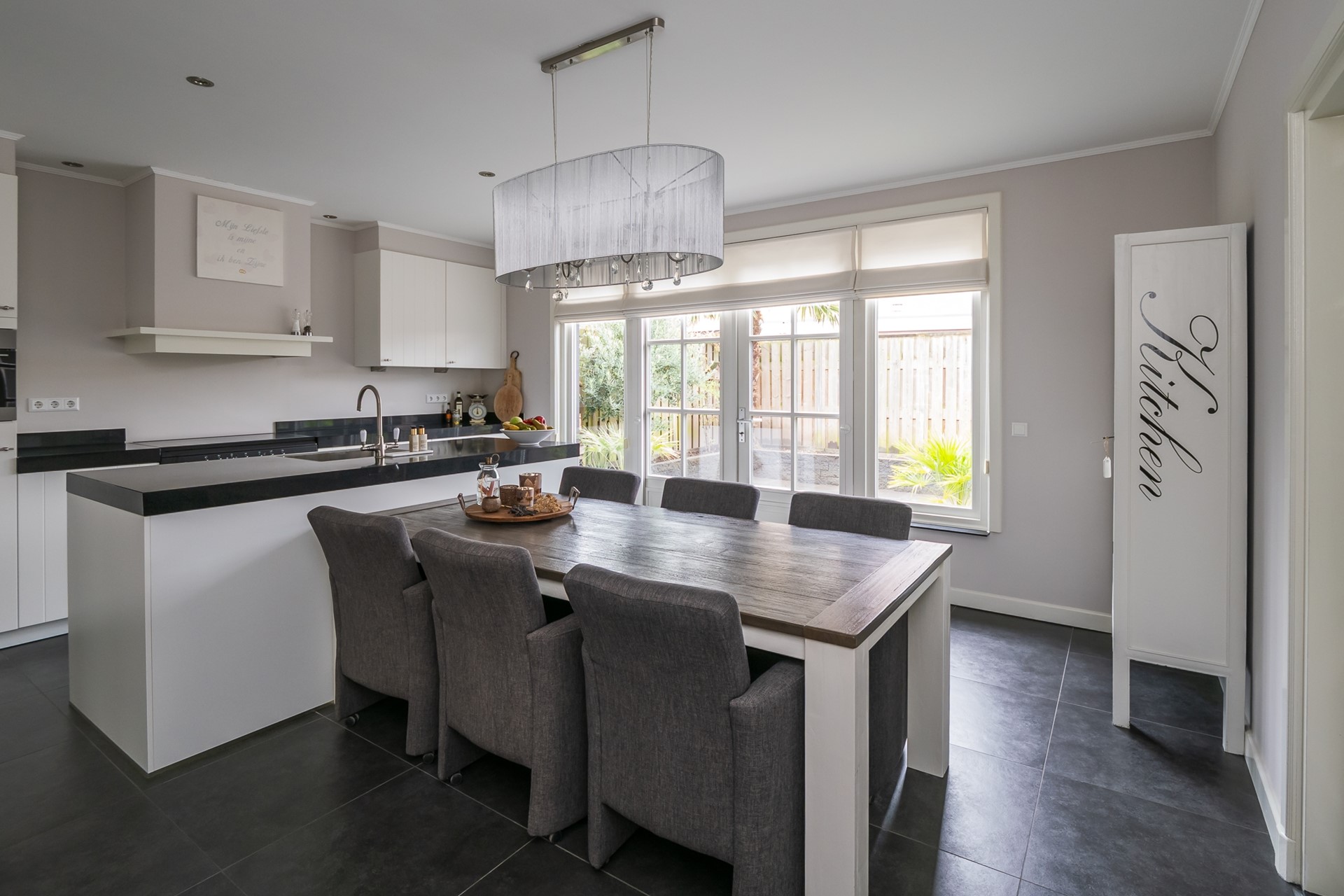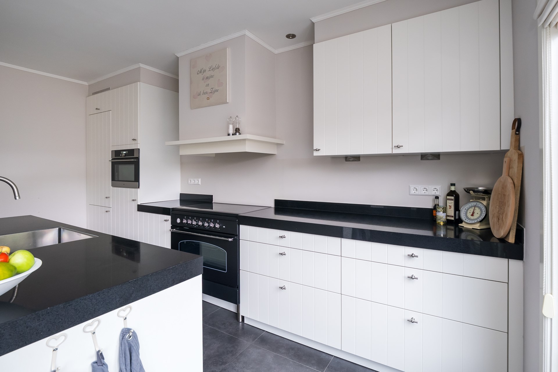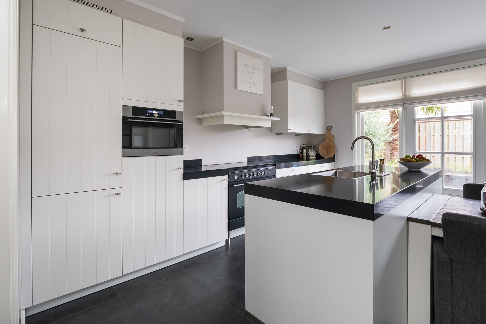Via dubbele schuifdeuren met glasverdeling loop je door naar de woonkeuken – een plek waar leven, koken en samenzijn moeiteloos in elkaar overvloeien. Deze royale aangebouwde ruimte, gerealiseerd in 2015, profiteert dankzij de brede glaspui met openslaande deuren van een heldere lichtinval en een dynamische verbondenheid met de tuin. De vouwgordijnen zijn inclusief. Op de vloer liggen groot formaat keramiek plavuizen en de wanden en het plafond zijn glad gestuct. De keukenopstelling bestaat uit een wandopstelling en een spoeleiland. De kastenfronten met verticale v-groef en T-bar greep zorgen in combinatie met de composiet werkbladen voor een landelijk-moderne look. Je beschikt over een “Etna” fornuis met 5 gaspitten (inclusief wokbrander), brede oven, afzuigschouw, combimagnetron (2024), koel-/vriescombinatie en een vaatwasmachine (2023). Ook aan opbergruimte ontbreekt het je niet; diverse korfladen, bestekladen en overige kastruimten maken dit een keuken waarin je alles kwijt kunt.