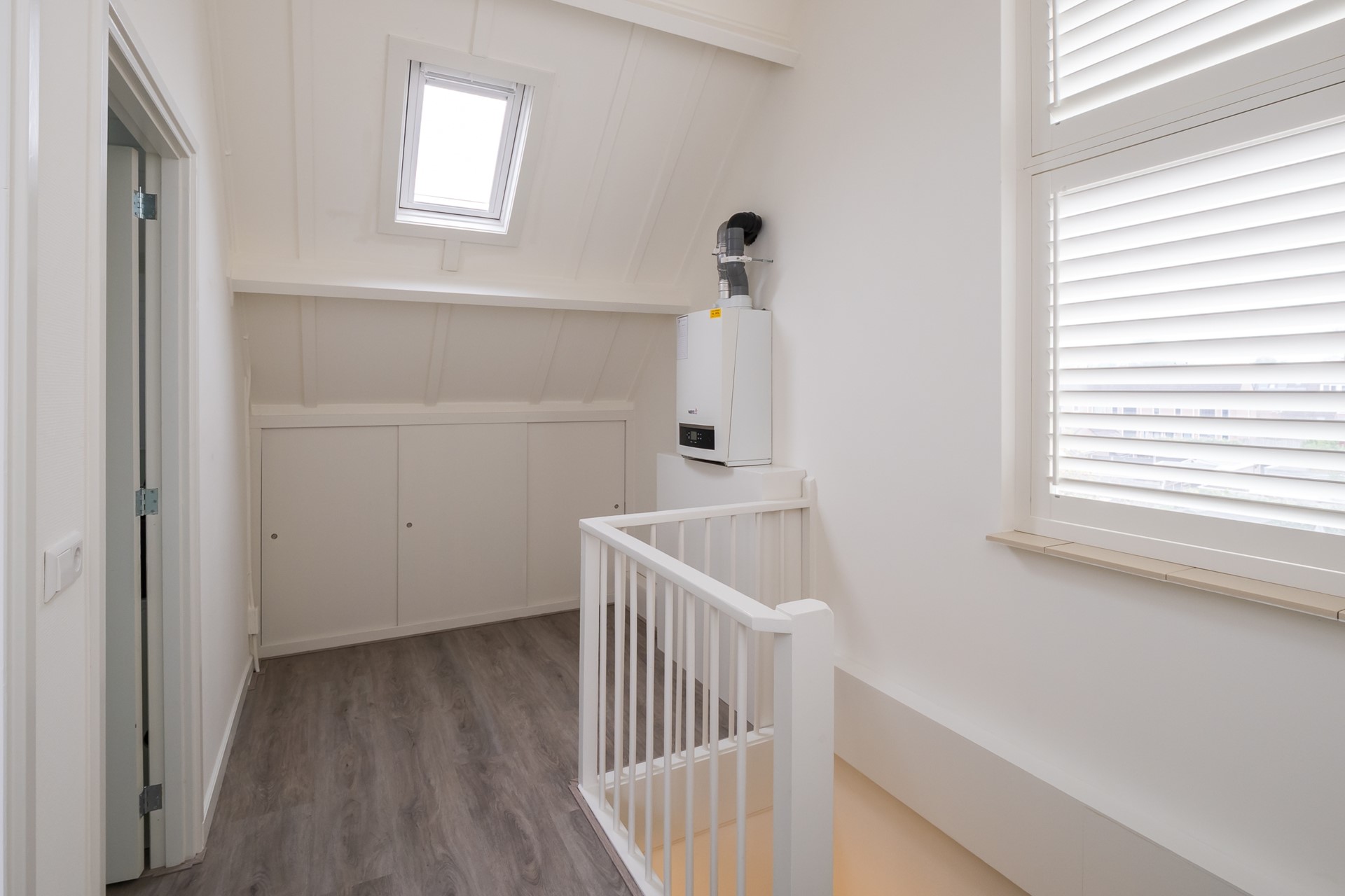 De overloop is heerlijk licht. Het raam in de zijgevel is uitgevoerd met zonwerend glas en stijlvolle shutters, beide van 2024. Enerzijds vind je een manshoge kastenwand met een surplus aan opbergruimte en anderzijds vind je bergruimte achter het knieschot, beide bereikbaar via schuifdeuren. Naast de trapopgang hangt de “Nefit” CV-installatie en de koolmonoxidemelder. Tot slot is vanaf hier een handige bergzolder bereikbaar.