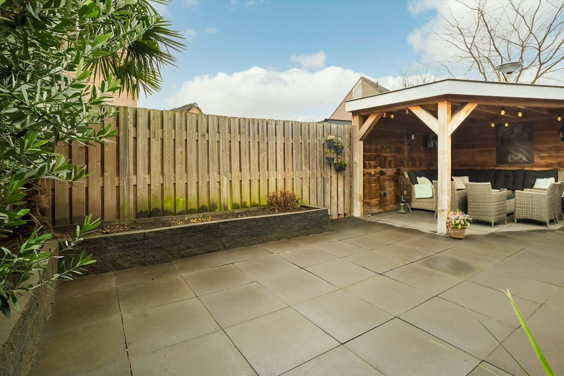 De achtertuin (2018) kan getypeerd worden als een heerlijke loungetuin op de zongunstige westzijde. Grote tegels maken de tuin onderhoudsvriendelijk, terwijl de verhoogde border met palm, olijfboom en Annabelle hortensia’s zorgt voor een groene touch. De veranda van Douglashout is georiënteerd op de zonnige zuidzijde en biedt een sfeervolle plek om tot in de late uurtjes van te genieten. De dubbele stopcontacten maken het eenvoudig om verlichting of een terrasheater aan te sluiten. De achtergevel van de woning is voorzien van potdekselwerk, wat het landelijke karakter nogmaals versterkt.