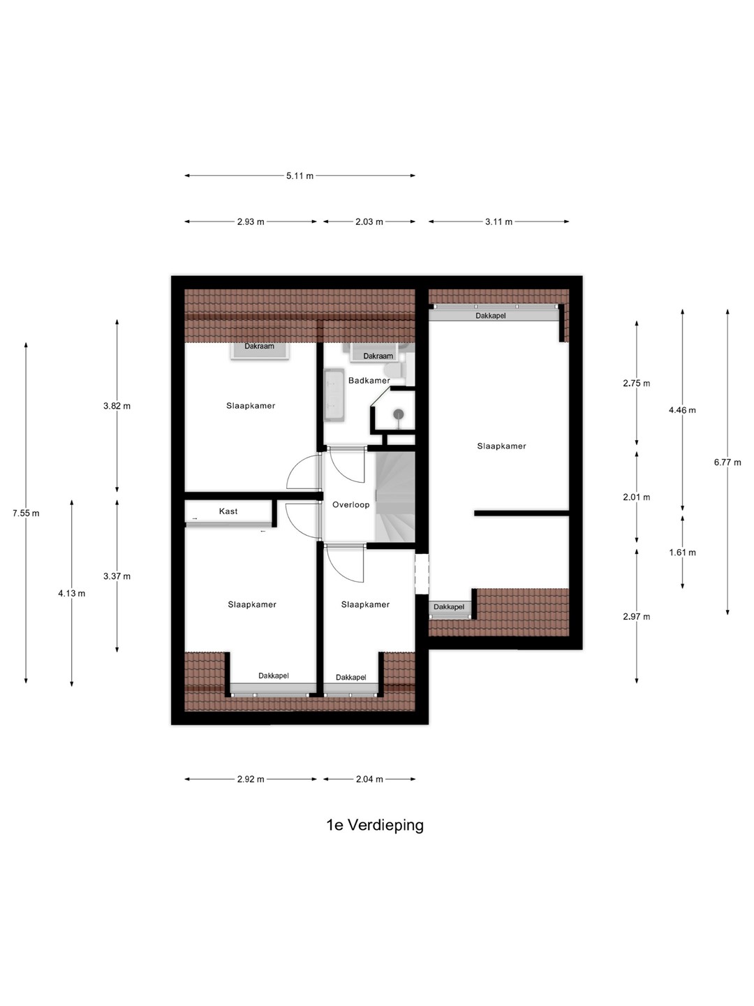 Op de eerste verdieping bevinden zich drie goed bemeten slaapkamers en een complete badkamer.