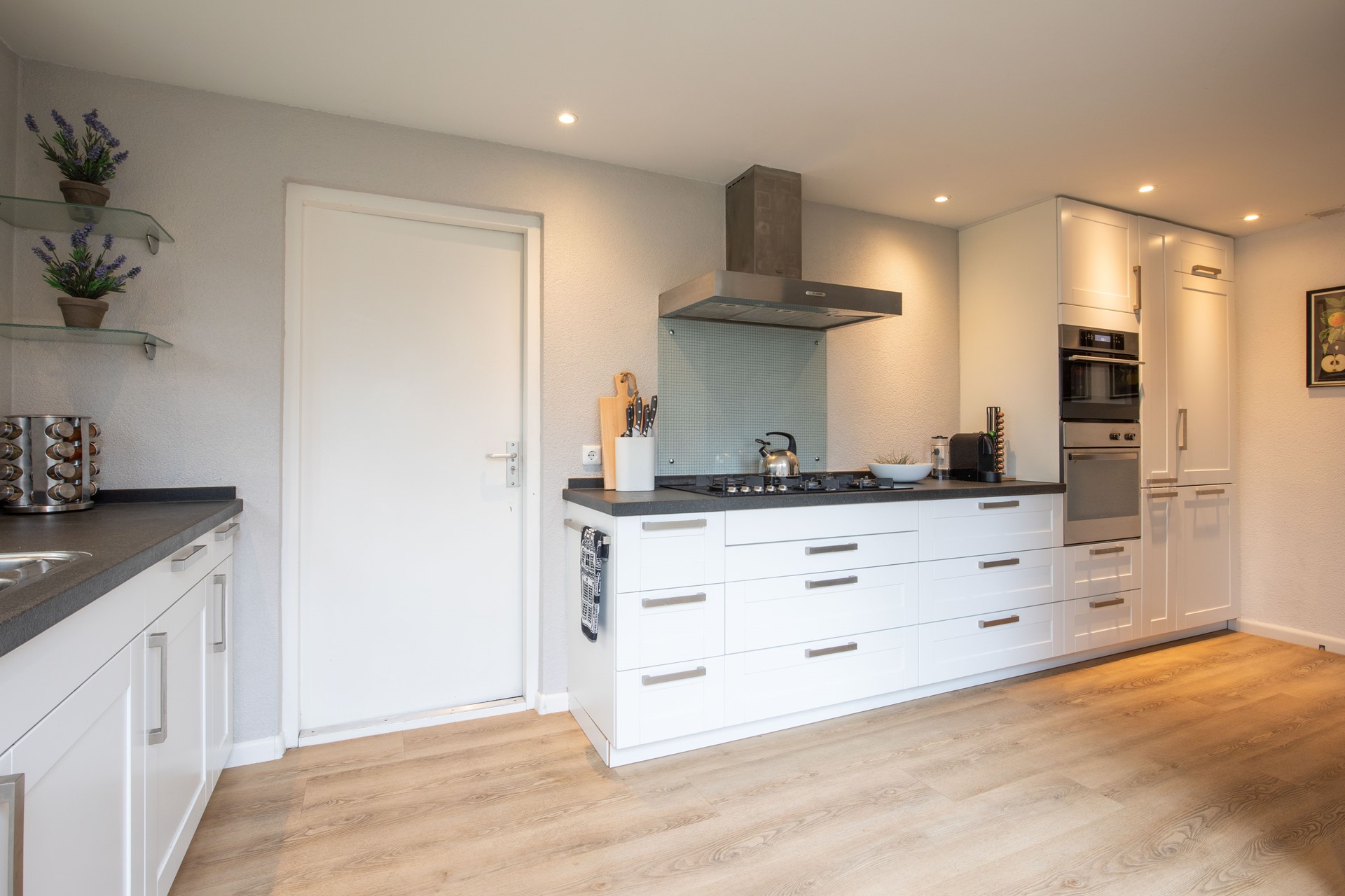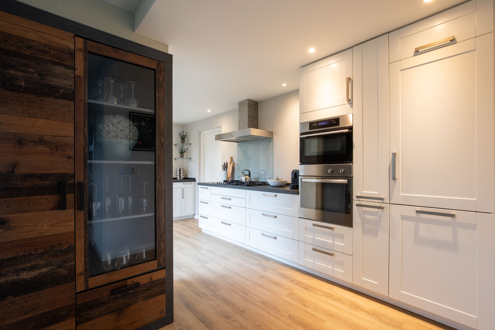 Aan de achterzijde bevindt zich de uitgebouwde keuken. De keuken is modern uitgevoerd in lichte tinten met een donker werkblad en voorzien van: