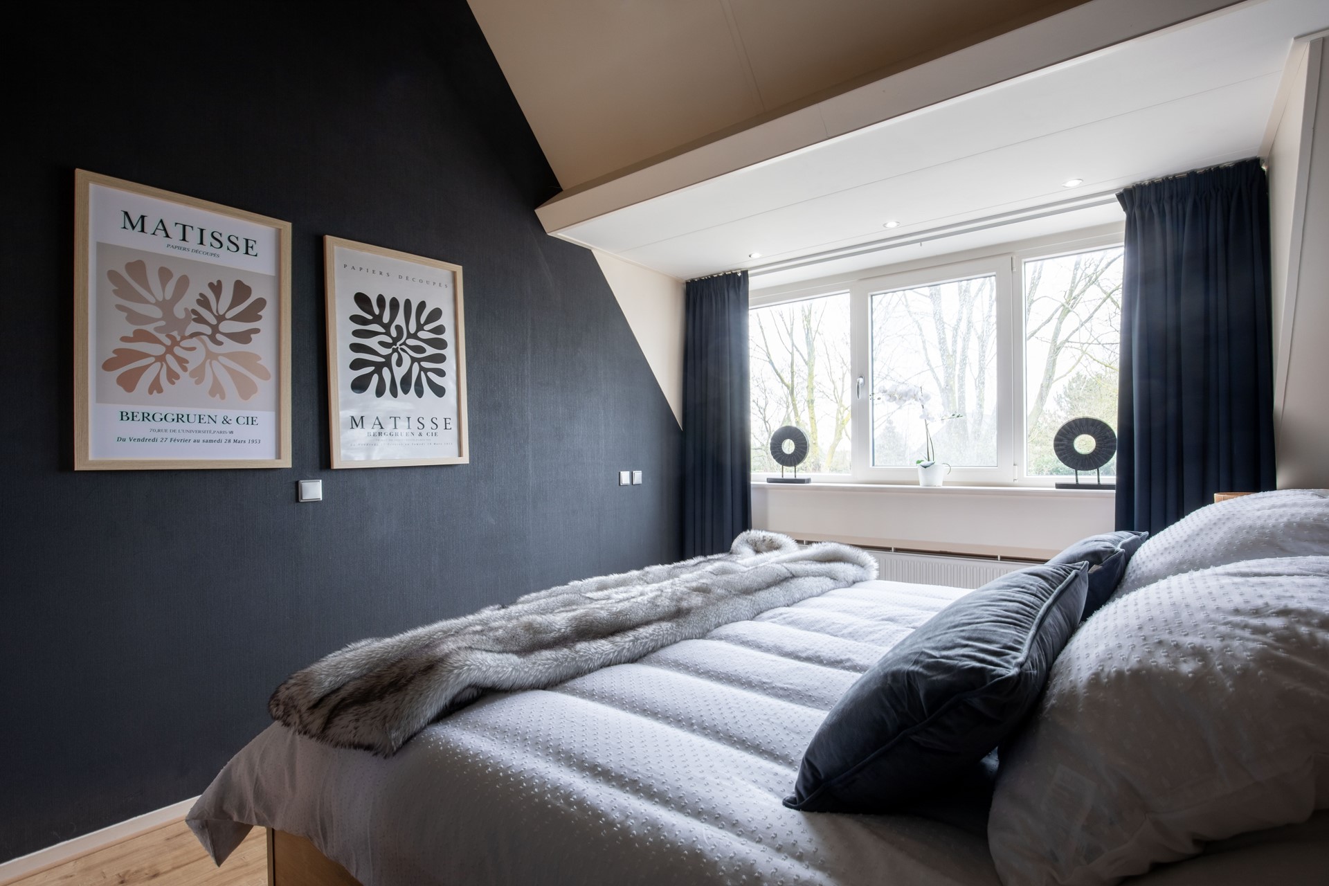 De royale hoofdslaapkamer kenmerkt zich door de hoge kapconstructie en schuine daklijn, wat zorgt voor karakter en ruimtelijkheid. Airconditioning garandeert comfort in elk seizoen.