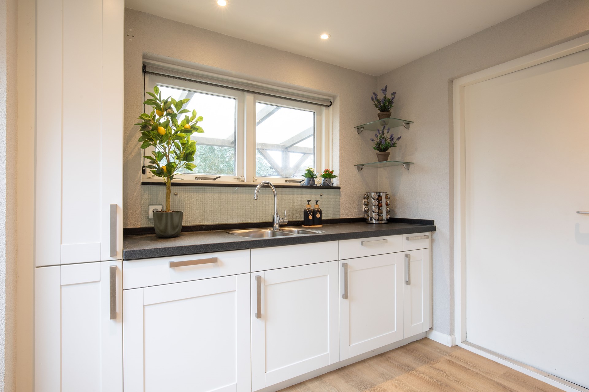 Aansluitend aan de keuken bevindt zich de praktische bijkeuken met aansluitingen voor wasmachine en droger (WD/WM). Hier is tevens extra opbergruimte aanwezig, ideaal voor het organiseren van het huishouden.