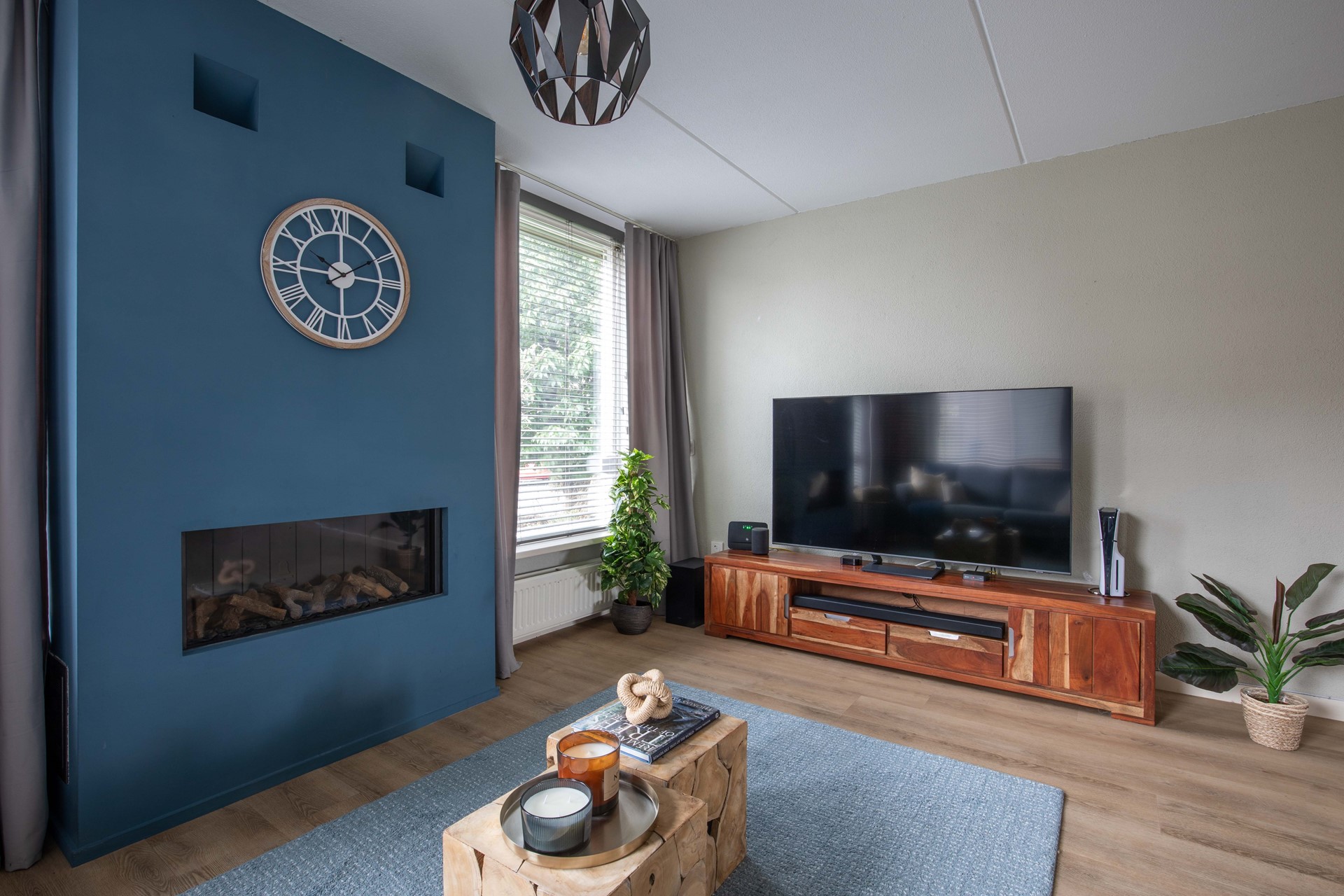De ruime woonkamer (ca. 5.10 meter breed) ligt aan de voorzijde en is dankzij de grote raampartijen heerlijk licht. De sfeervolle gashaard vormt het warme middelpunt van de ruimte. Er is volop plaats voor een royale zithoek en extra kastruimte.