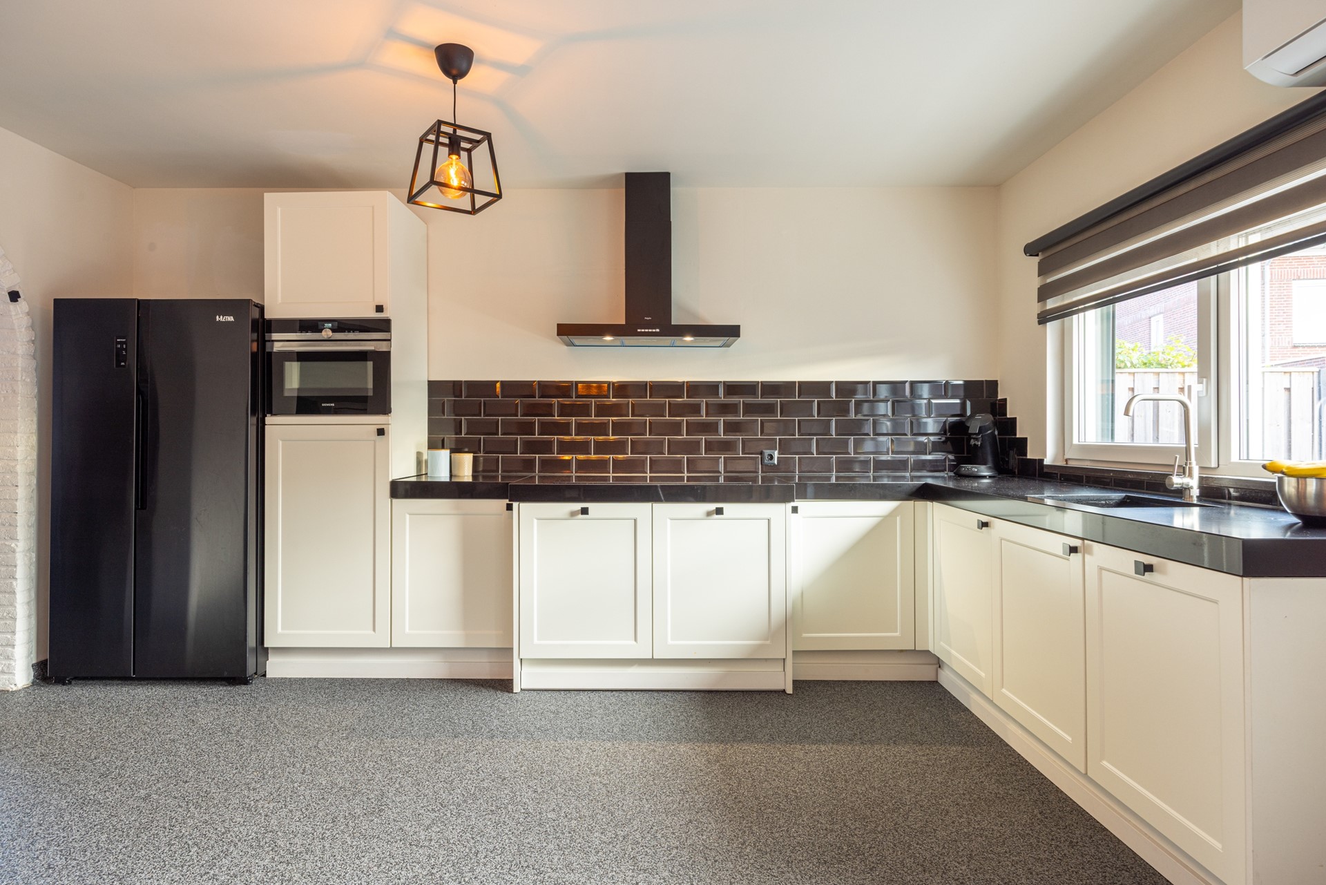 De open leefkeuken aan de achterzijde vormt het hart van de woning. De hoekopstelling biedt volop werk- en bergruimte en is uitgerust met alle wenselijke inbouwapparatuur, waaronder een inductiekookplaat met vijf zones, een combi-heteluchtoven, een Amerikaanse koelkast met vriezer en een vaatwasser. Ook hier is een airco aanwezig die kan verwarmen en koelen. Via de dubbele openslaande deuren stroomt het daglicht binnen en is er direct toegang tot de achtertuin met verwarmd zwembad.