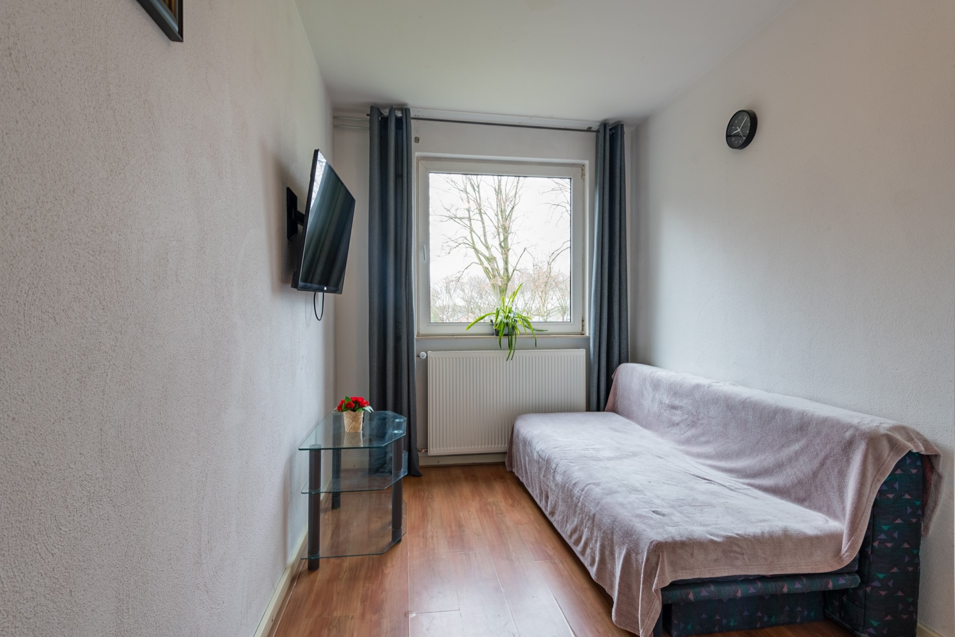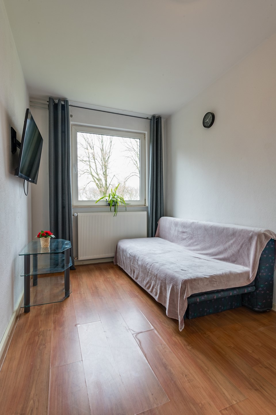 De woonkamer is licht en prettig van formaat, met grote raampartijen die zorgen voor veel daglicht. De ruimte is afgewerkt met een laminaatvloer en biedt voldoende plek voor een comfortabele zithoek én een eethoek. Vanuit de woonkamer heb je toegang tot het balkon aan de voorzijde, waar ook een kleine berging aanwezig is, handig voor extra spullen. Daarnaast biedt de woonkamer toegang tot twee van de vier slaapkamers.