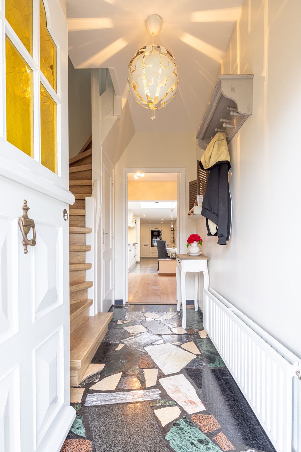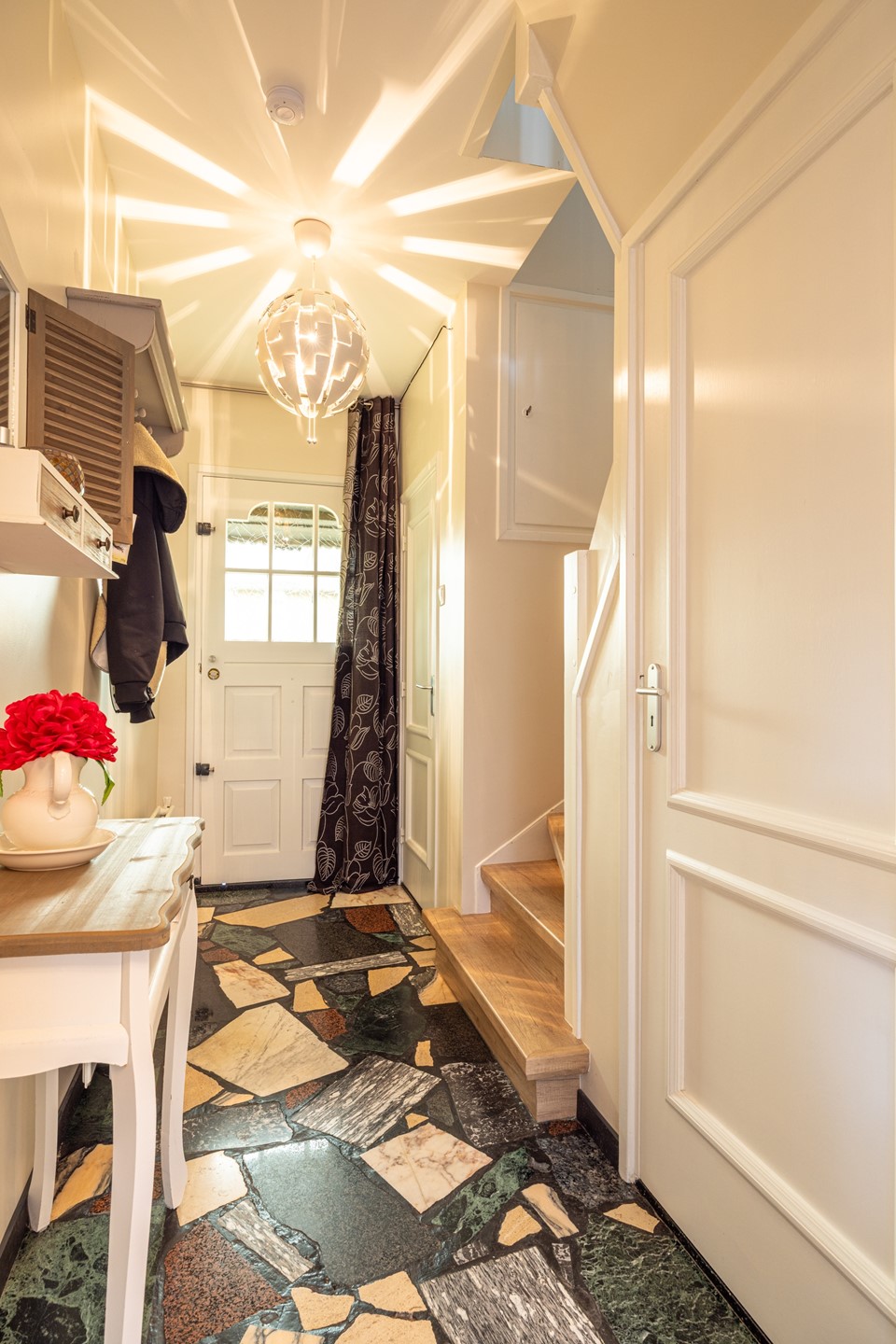Bij aankomst zie je eerst de verzorgde voortuin, die de woning een nette uitstraling geeft. Je komt binnen in de hal met een mooie vloer bestaande uit verschillende natuurstenen. Hier bevinden zich de garderobe, de meterkast, het moderne zwevende toilet en de toegang tot de provisiekelder waar ook de witgoedaansluitingen zijn geplaatst.