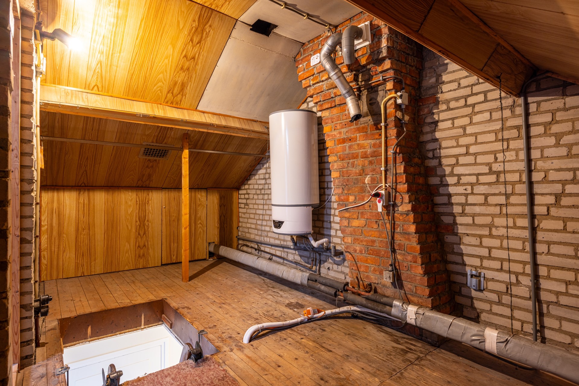 Via de vlizotrap bereik je de ruime tweede verdieping. Hier staat de elektrische boiler van honderd liter. Deze verdieping kan, na aanpassingen, worden ingericht als extra slaapkamer of werkruimte.
