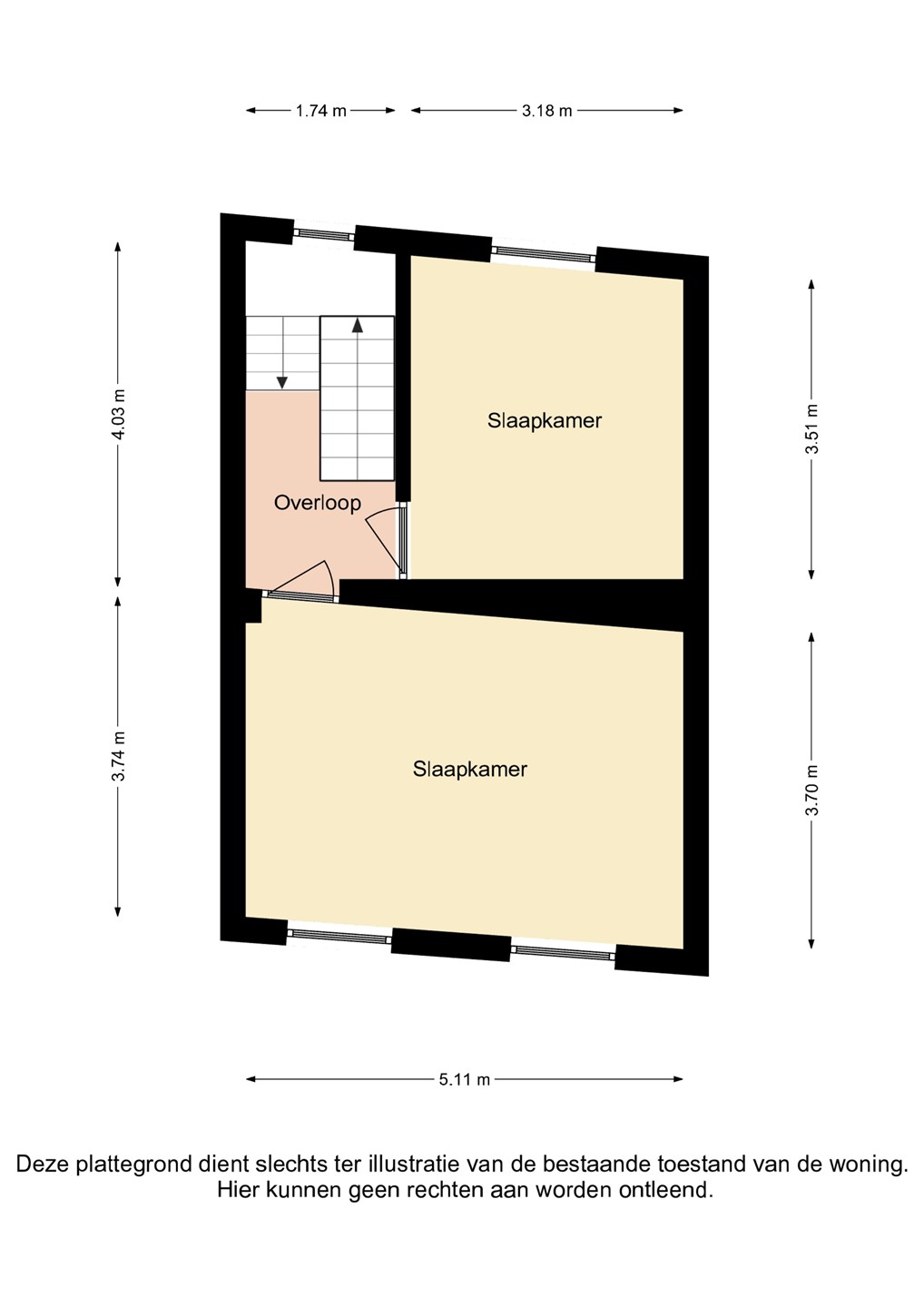 Op de eerste verdieping bevinden zich twee slaapkamers. Eén van deze kamers is voorzien van een eigen wastafel en toilet. De overloop biedt toegang tot de trap naar de tweede verdieping.
