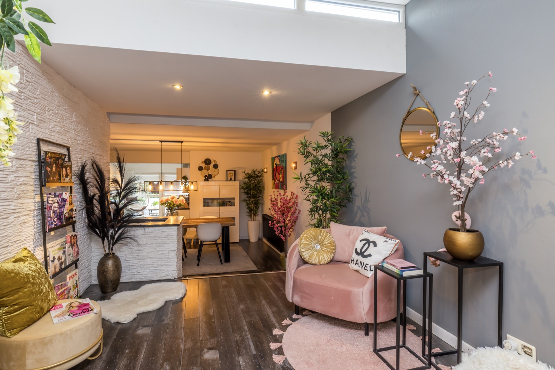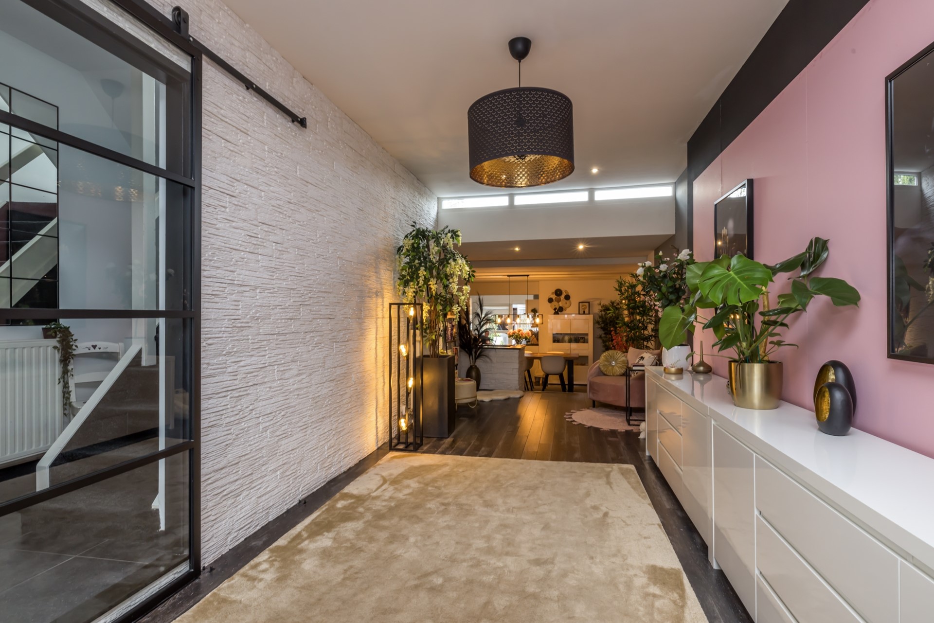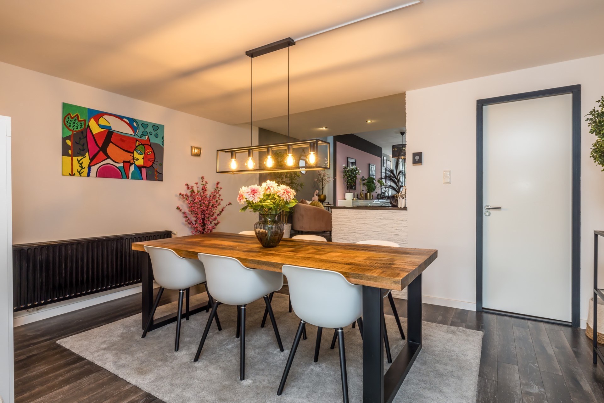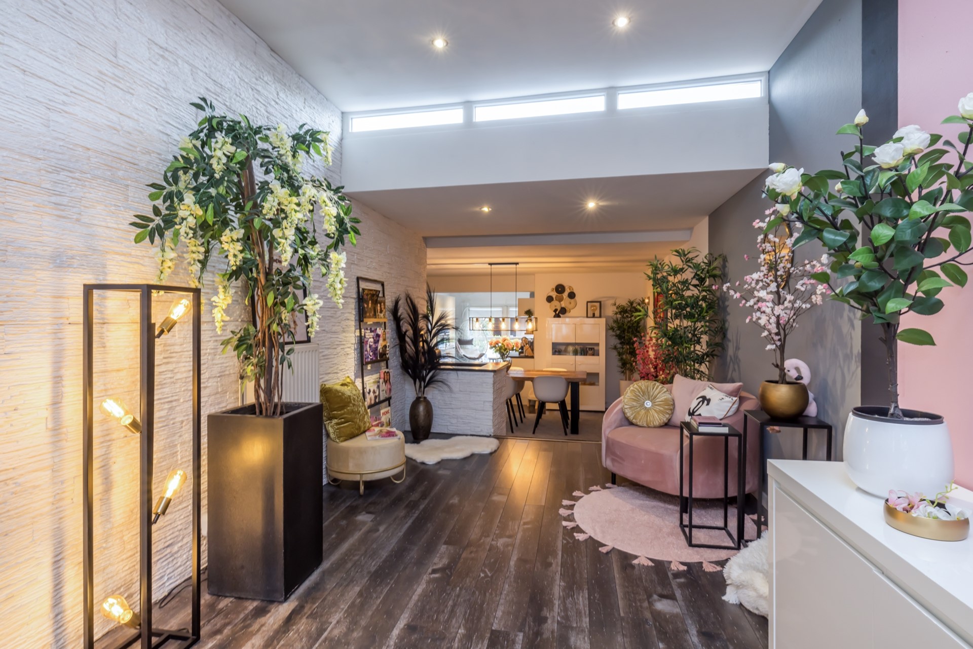 Bij binnenkomst valt direct de verzorgde afwerking op, met oog voor detail en stijl. De ruime woonkamer staat in open verbinding met de eetkamer, waarbij het hoogteverschil zorgt voor een speels split-level effect.