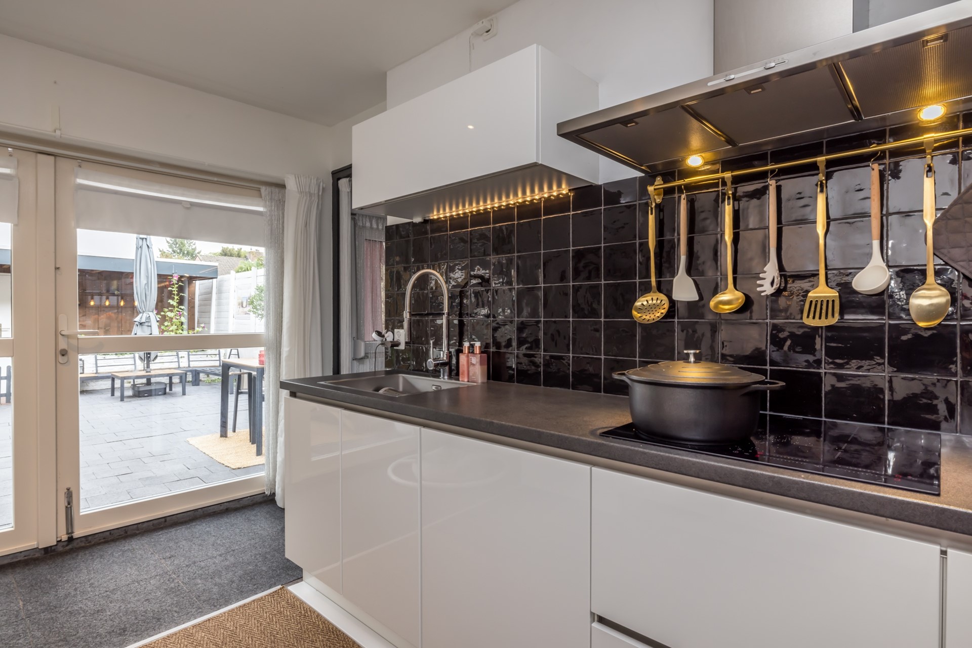 Aan de achterzijde ligt de moderne, halfopen keuken met een strakke afwerking, een royaal werkblad en diverse inbouwapparatuur. Via openslaande deuren is er toegang tot de tuin. Aansluitend bevindt zich de bijkeuken, waar ook de cv-installatie is geplaatst.