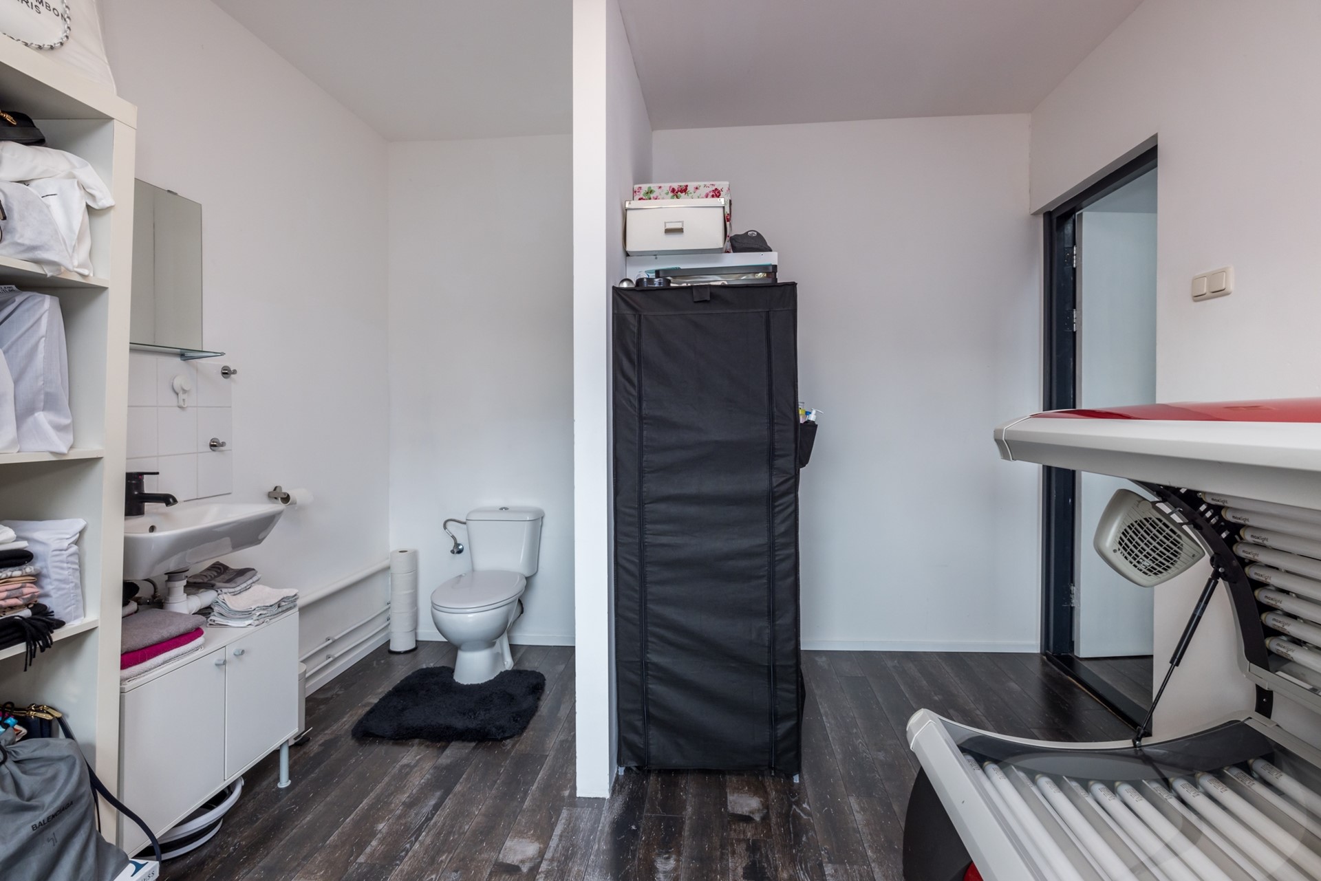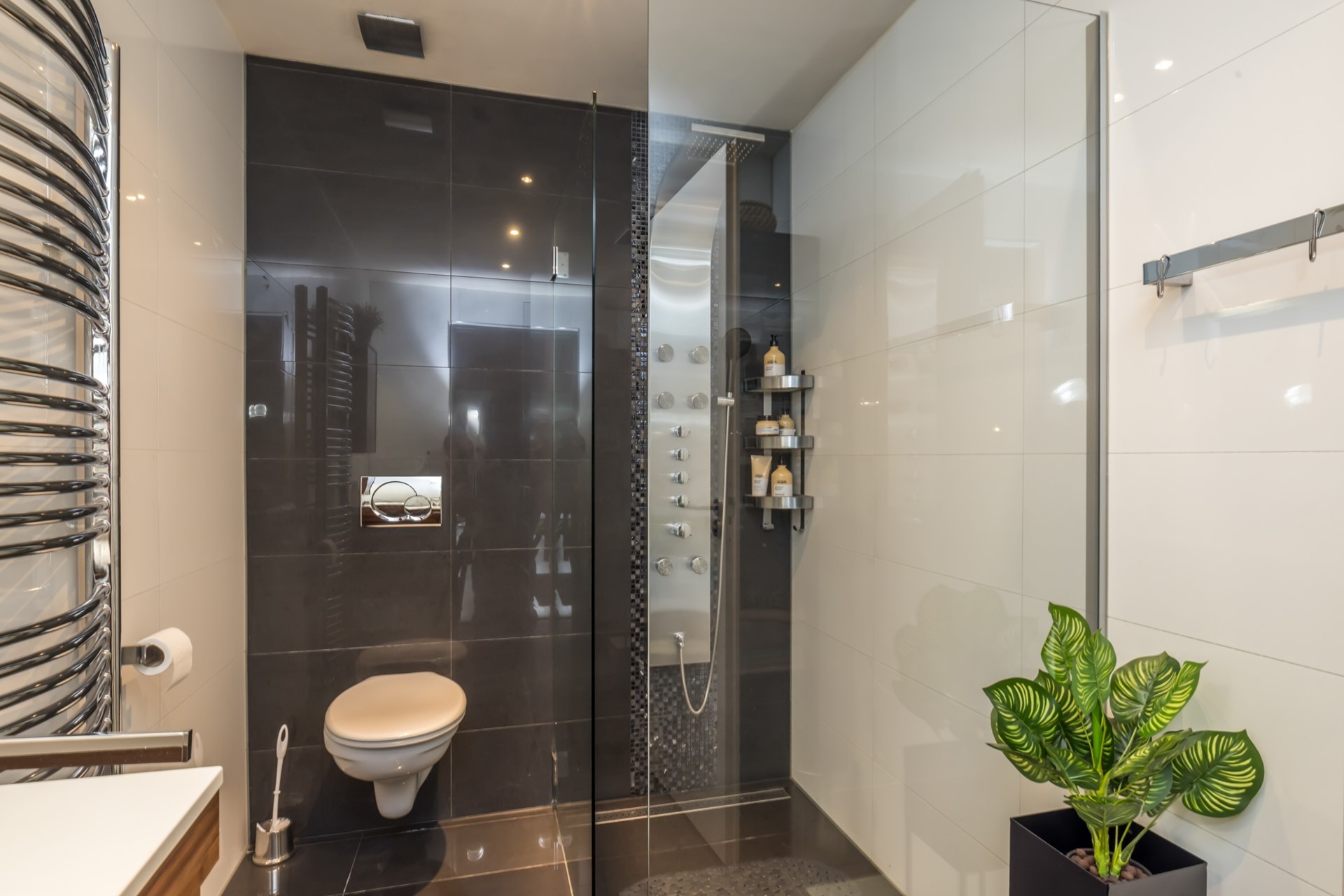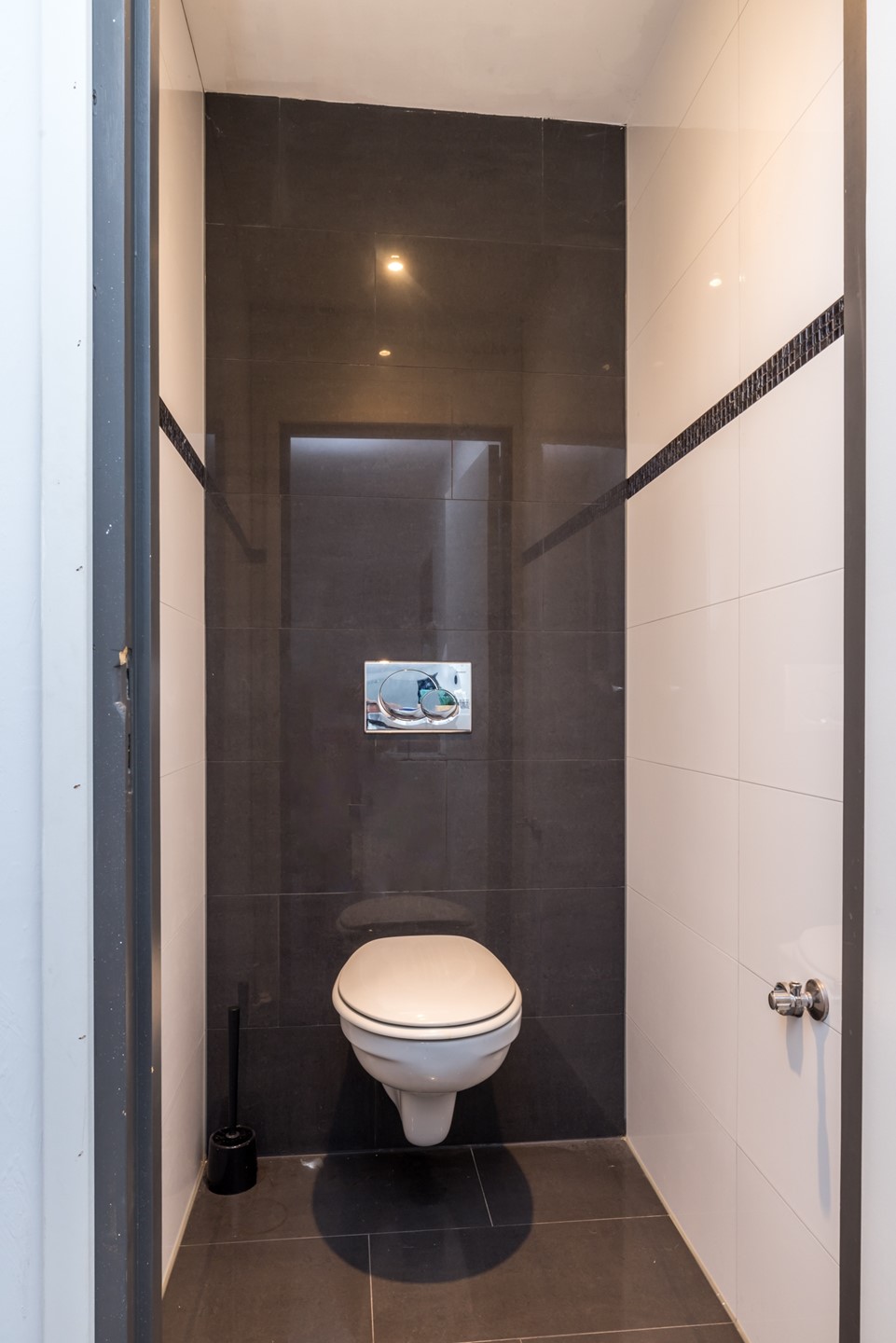 Op de begane grond is bovendien een moderne badkamer aanwezig. Deze is volledig betegeld en uitgerust met een inloopdouche met regendouchekop, een wandcloset, wastafelmeubel en designradiator.