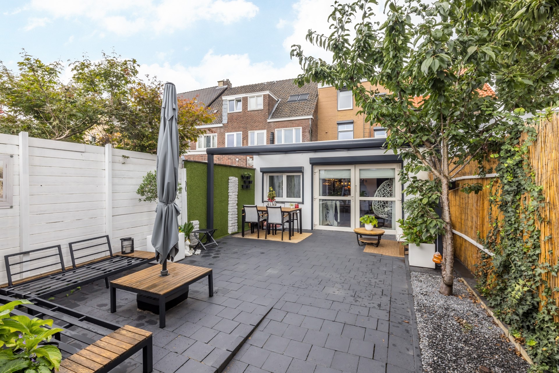 De achtertuin is onderhoudsvriendelijk aangelegd met grote tegels en biedt volop privacy. Achterin staat een houten tuinhuis en via de achterom is de tuin ook bereikbaar vanaf de achterzijde, waar eventueel parkeermogelijkheid is.