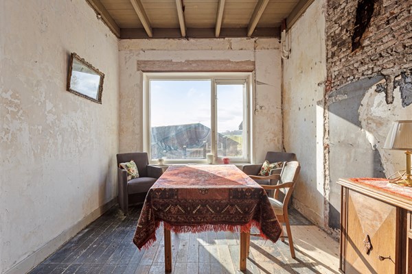 De woonkamer ligt aan de voorzijde van de woning en kijkt uit op het dorp. Er is in de jaren ’80 een open haard aangelegd in de ruimte. Aangrenzend ligt een ruimte die als slaapkamer in gebruik is geweest. Via een doorgang onder de trap is de keuken bereikbaar.