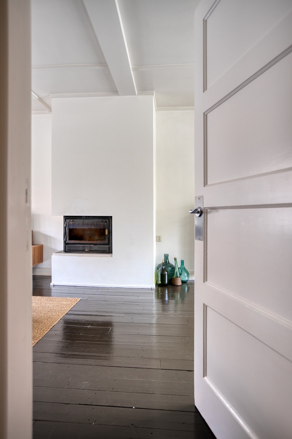 De woonkamer ademt de charme van vroeger. Authentieke plafonds, een sfeervolle erker met glas-in-loodramen en een warm, donker gelakte houten vloer zorgen voor een karaktervolle uitstraling. De open haard maakt het geheel compleet en zorgt voor extra sfeer tijdens de koudere maanden.