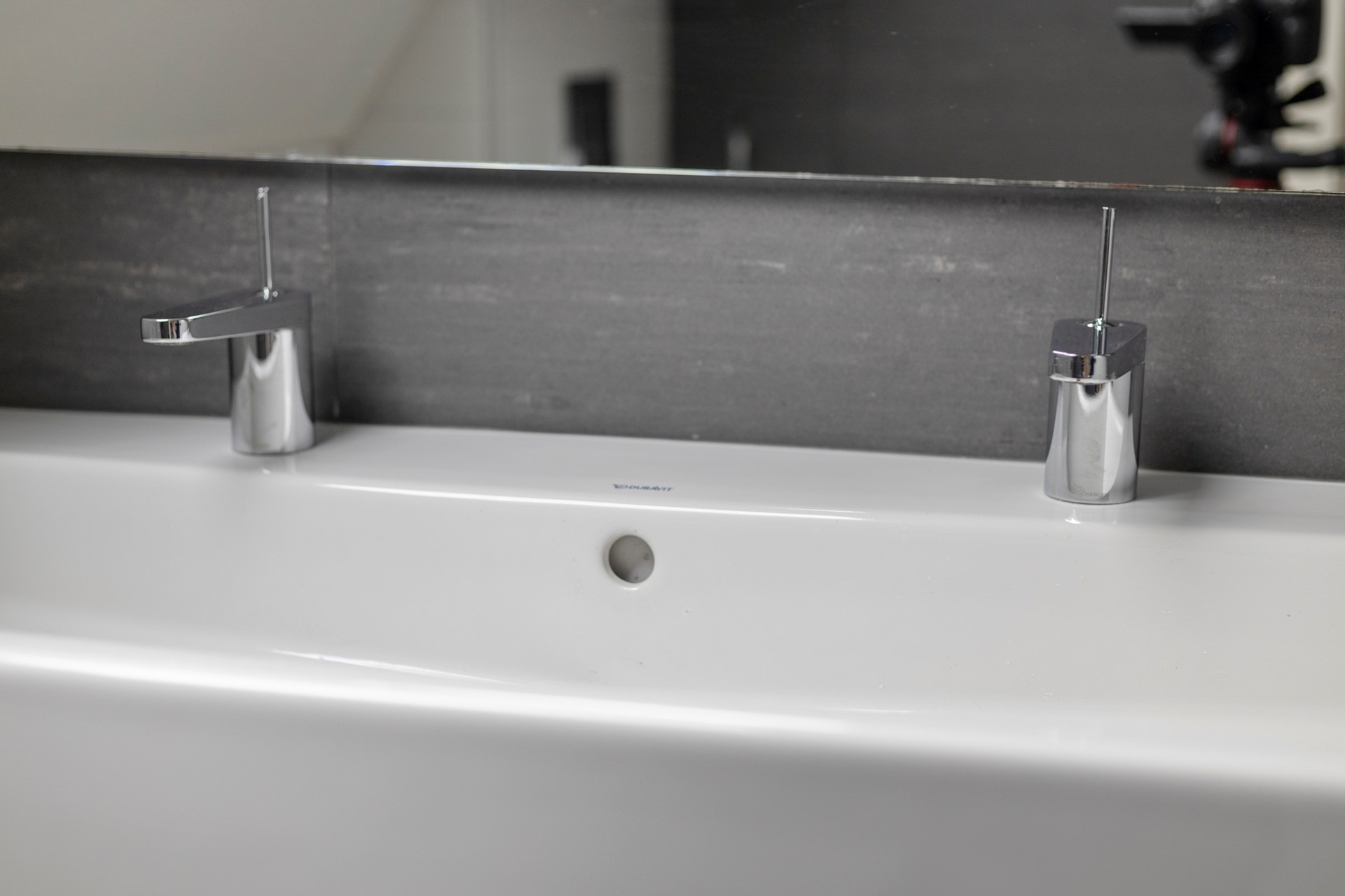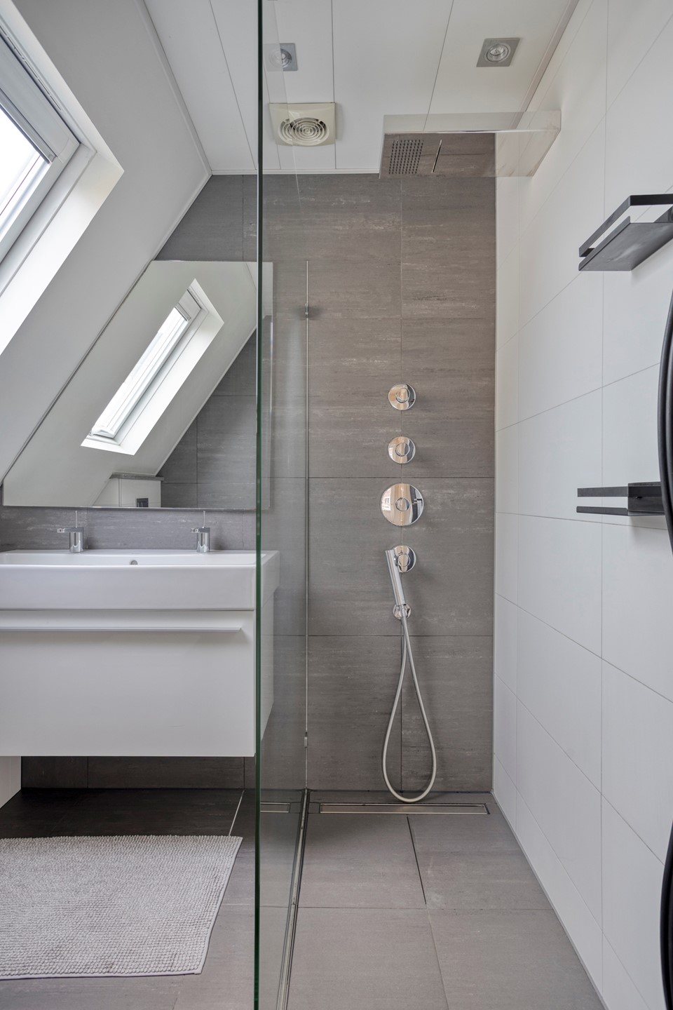 De overloop op de 1e verdieping biedt toegang tot drie slaapkamers en de moderne badkamer. Deze is voorzien van een douche, badkamermeubel en toilet.