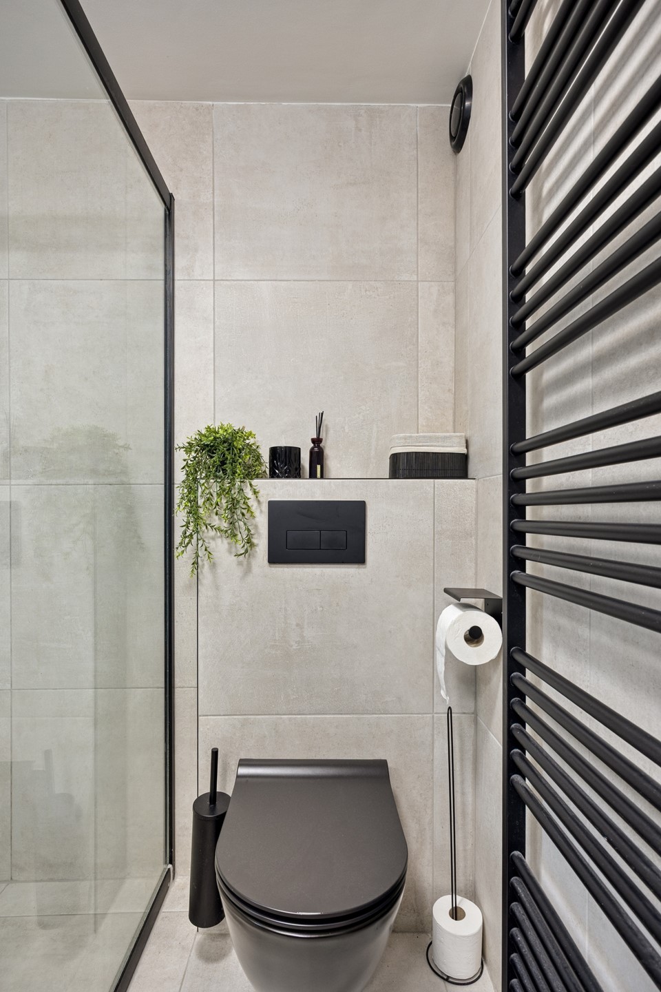 Op de eerste verdieping bevinden zich twee slaapkamers, waarvan één extra royaal (dit waren voorheen twee kamers), die voorzien is van een schuifwandkast. Perfect als master bedroom. De moderne badkamer heeft een inloopdouche, dubbel wastafelmeubel en toilet.
