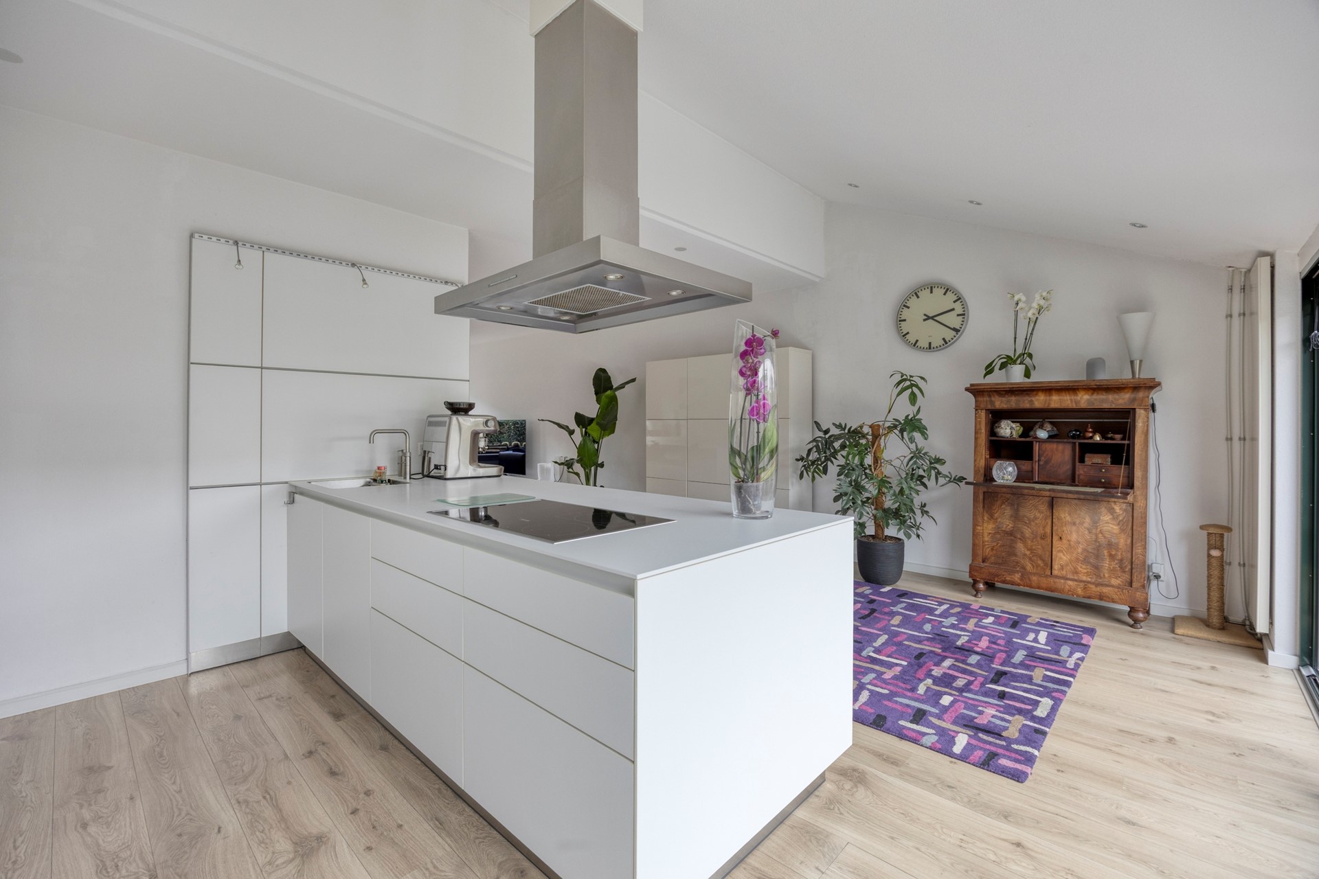 Grote living met zitkamer aan de voorzijde en vrij uitzicht over de voortuin. De open keuken bevindt zich aan achterzijde waar u door de prachtige schuifpui (over de gehele breedte van de woning) zo de achtertuin in loopt.