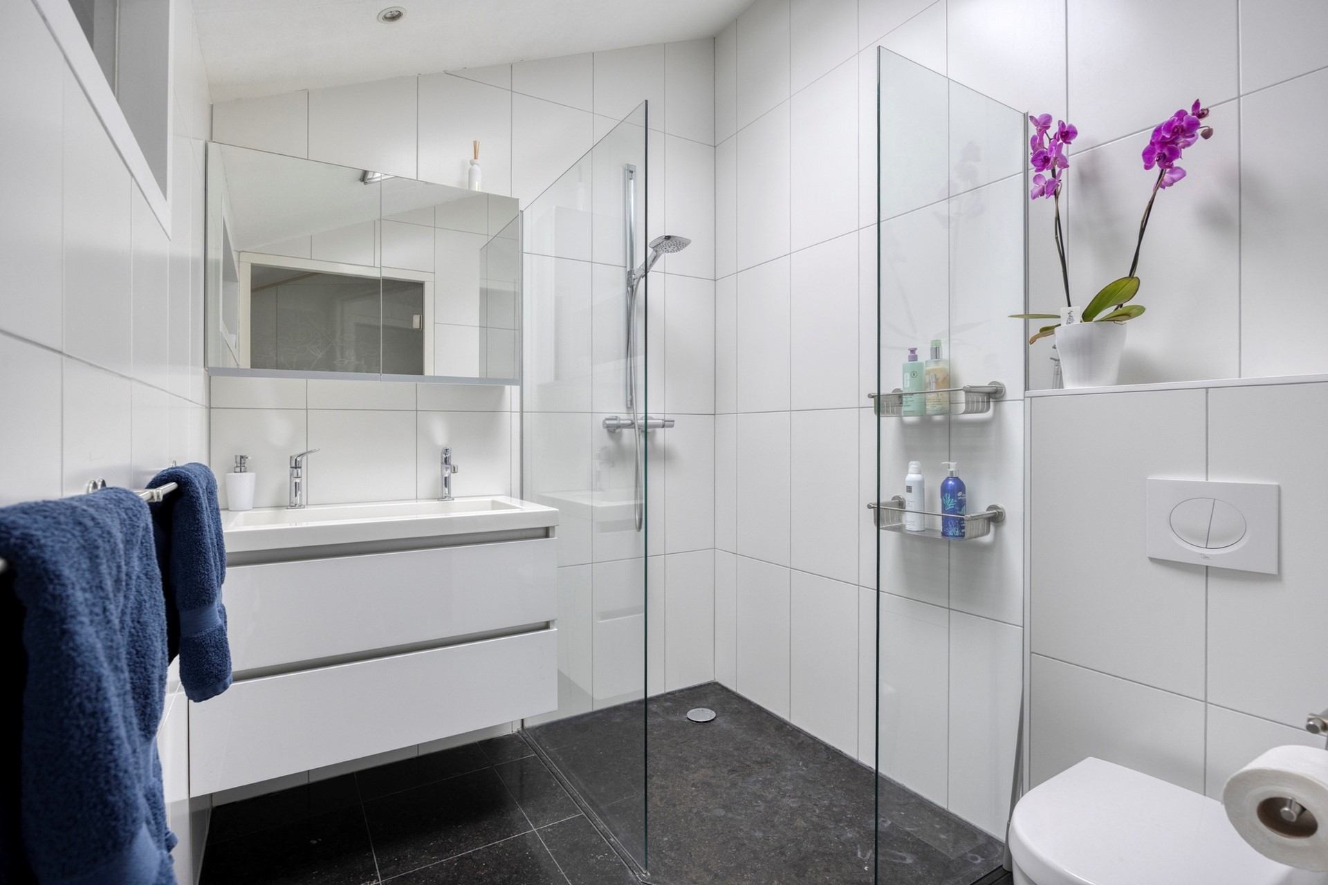 Badkamer v.v. douche/ligbad combinatie, hangend toilet, dubbel wastafelmeubel en handdoekradiator.