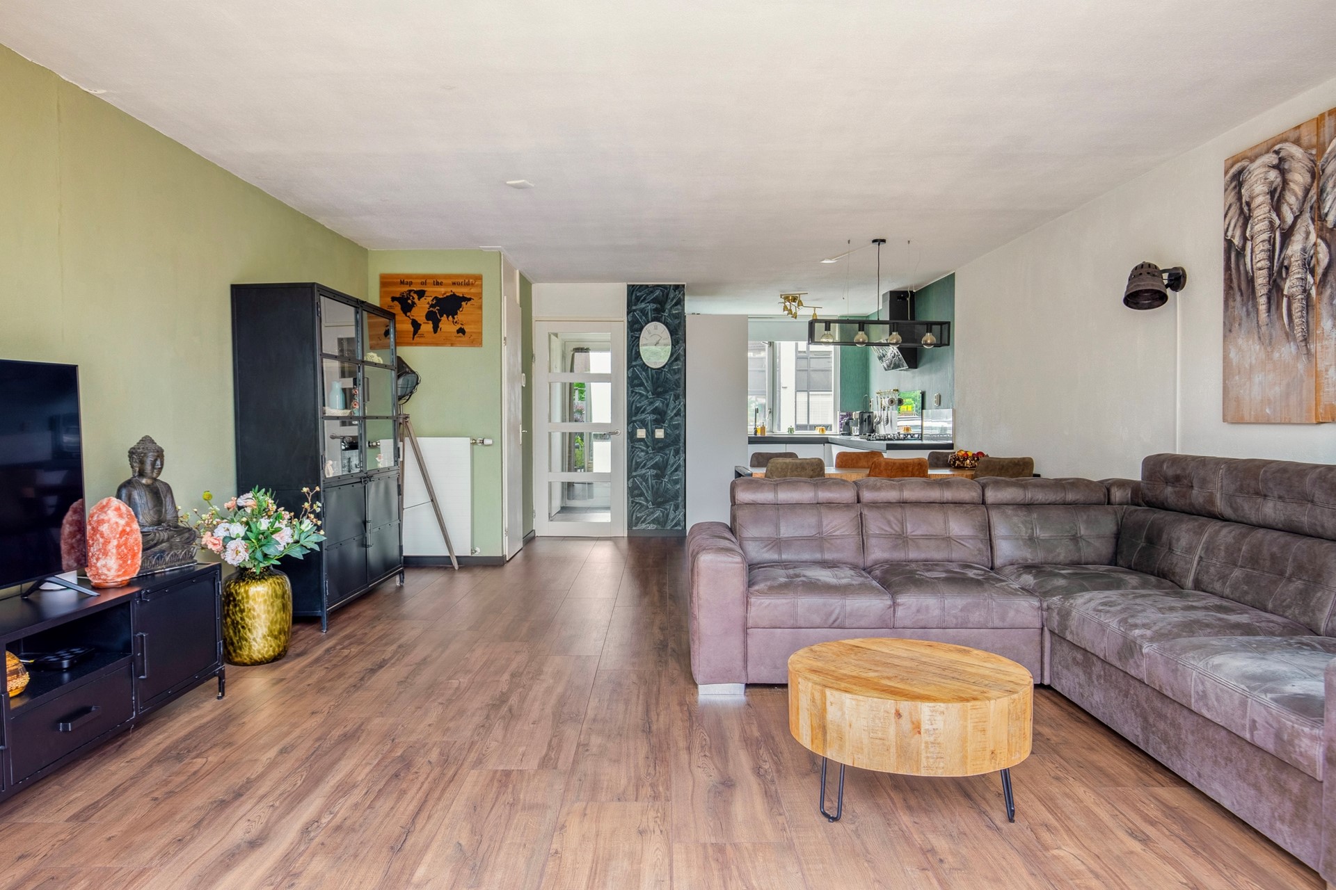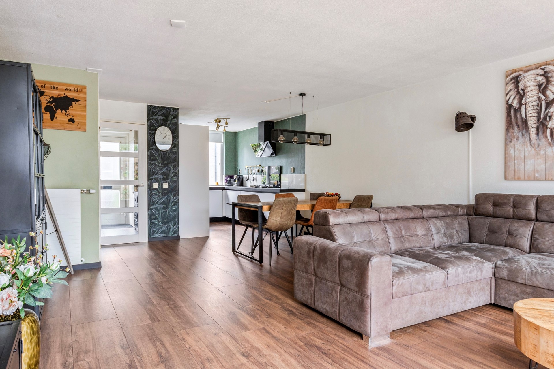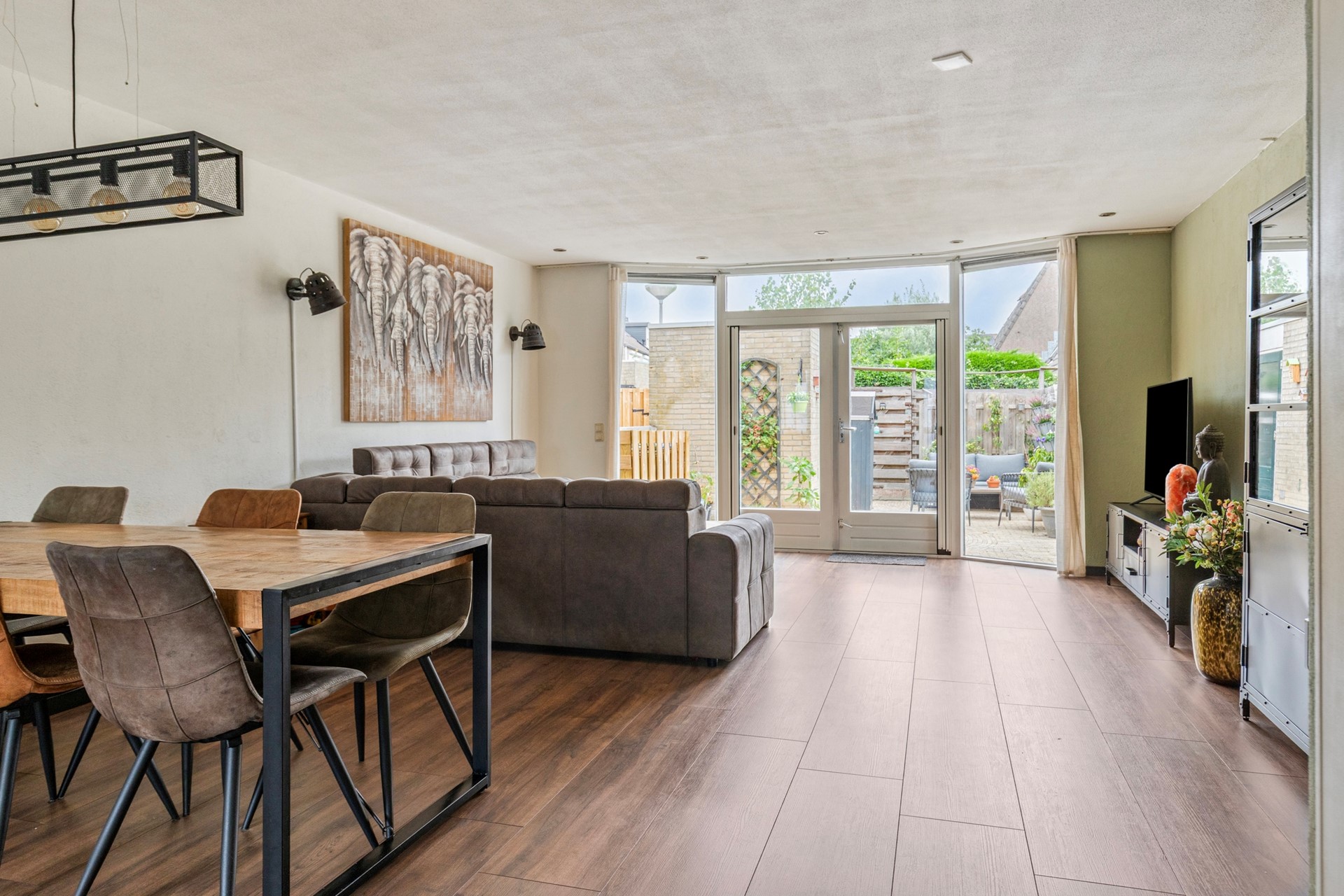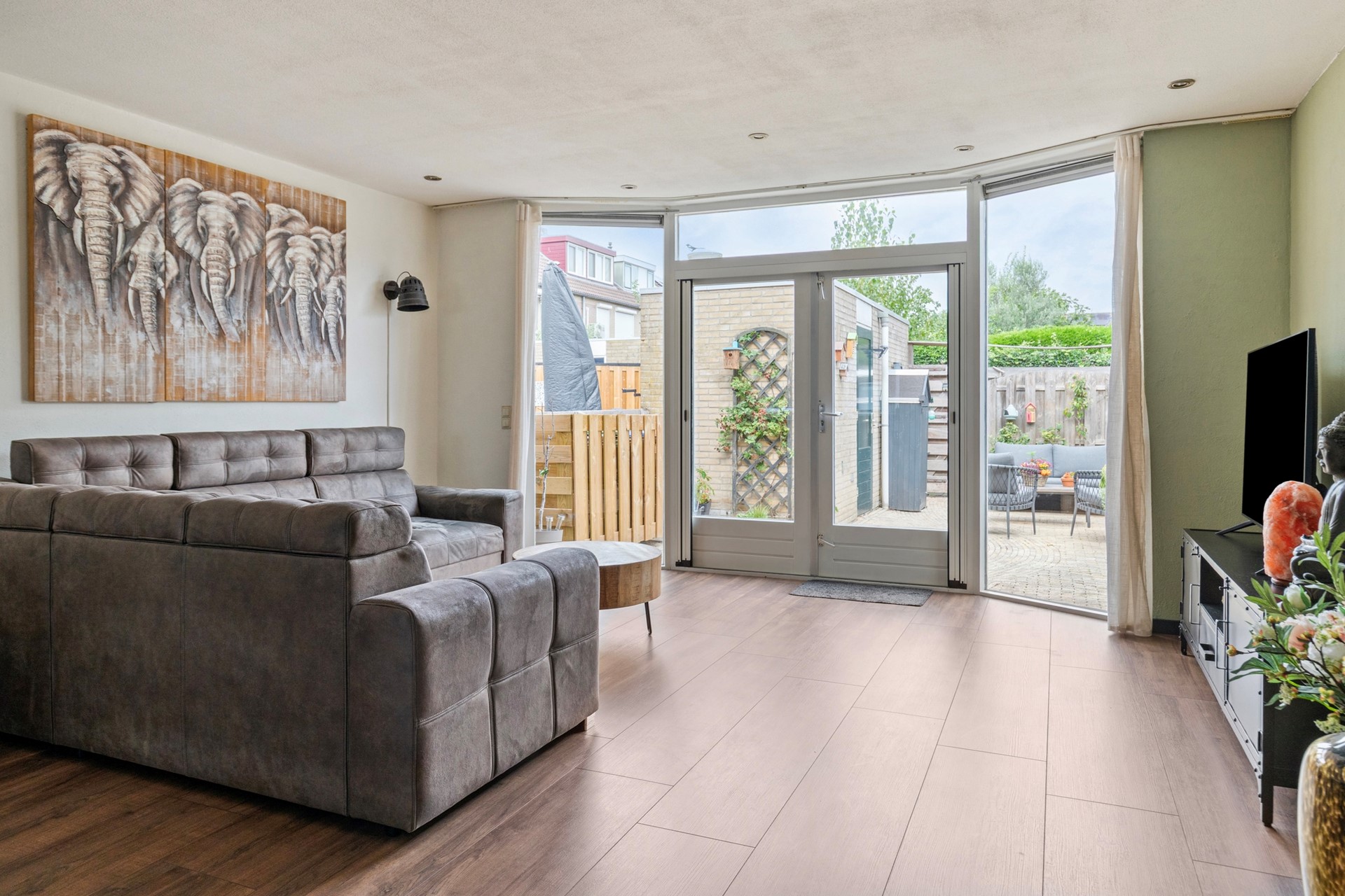 Ruime woonkamer met trapkast, laminaat vloer, wandafwerking en met de openslaande deuren heeft u toegang tot de achtertuin.