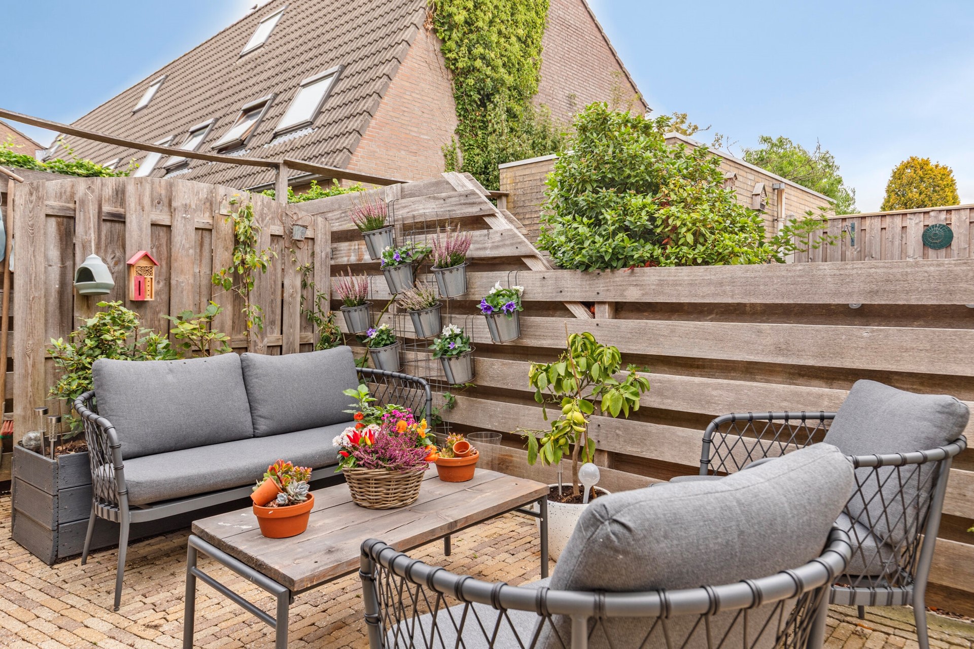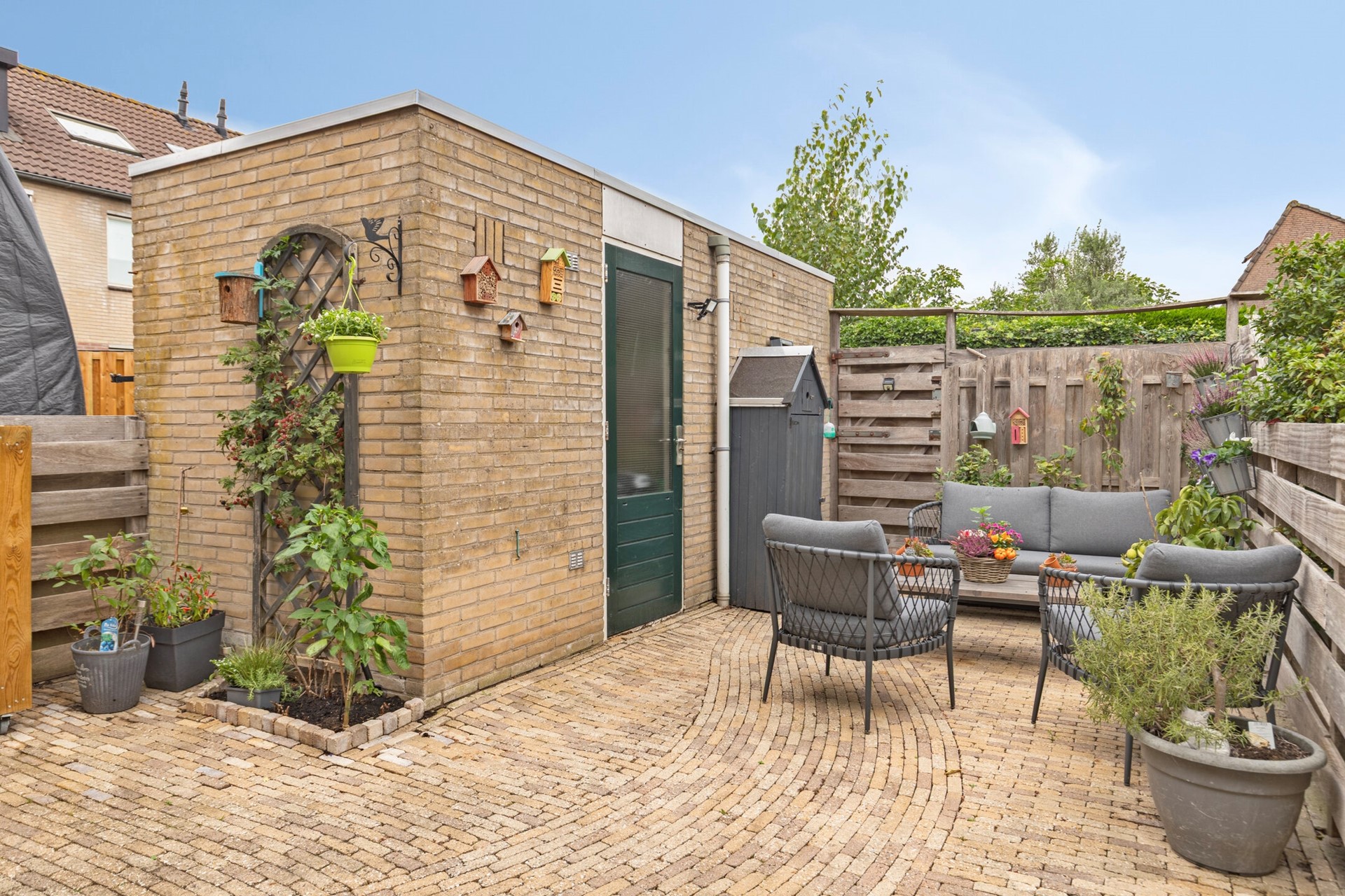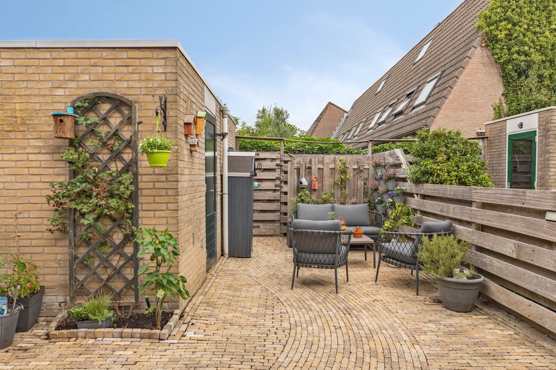 Circa 9 m diepe achtertuin gelegen op het noorden met zonnig terras en stenen berging welke is voorzien van elektriciteit en buitenkraan.