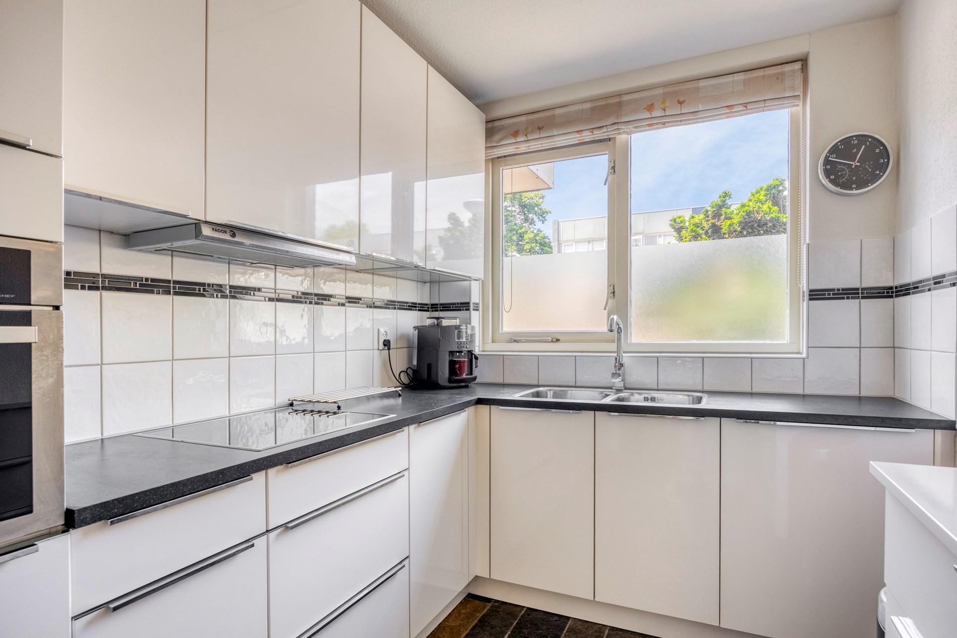 Open keukenruimte aan de voorzijde met inbouw apparatuur zoals dubbele spoelbak, koelkast, vaatwasser, combi magnetron, 4 pits inductie koken en close-in boiler.
