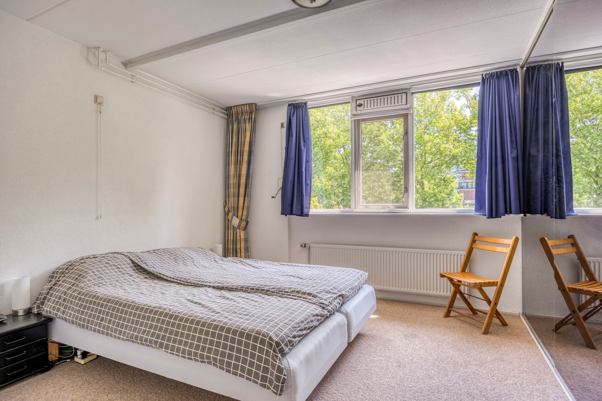 Deze slaapkamer heeft een kastenwand over de hele breedte.