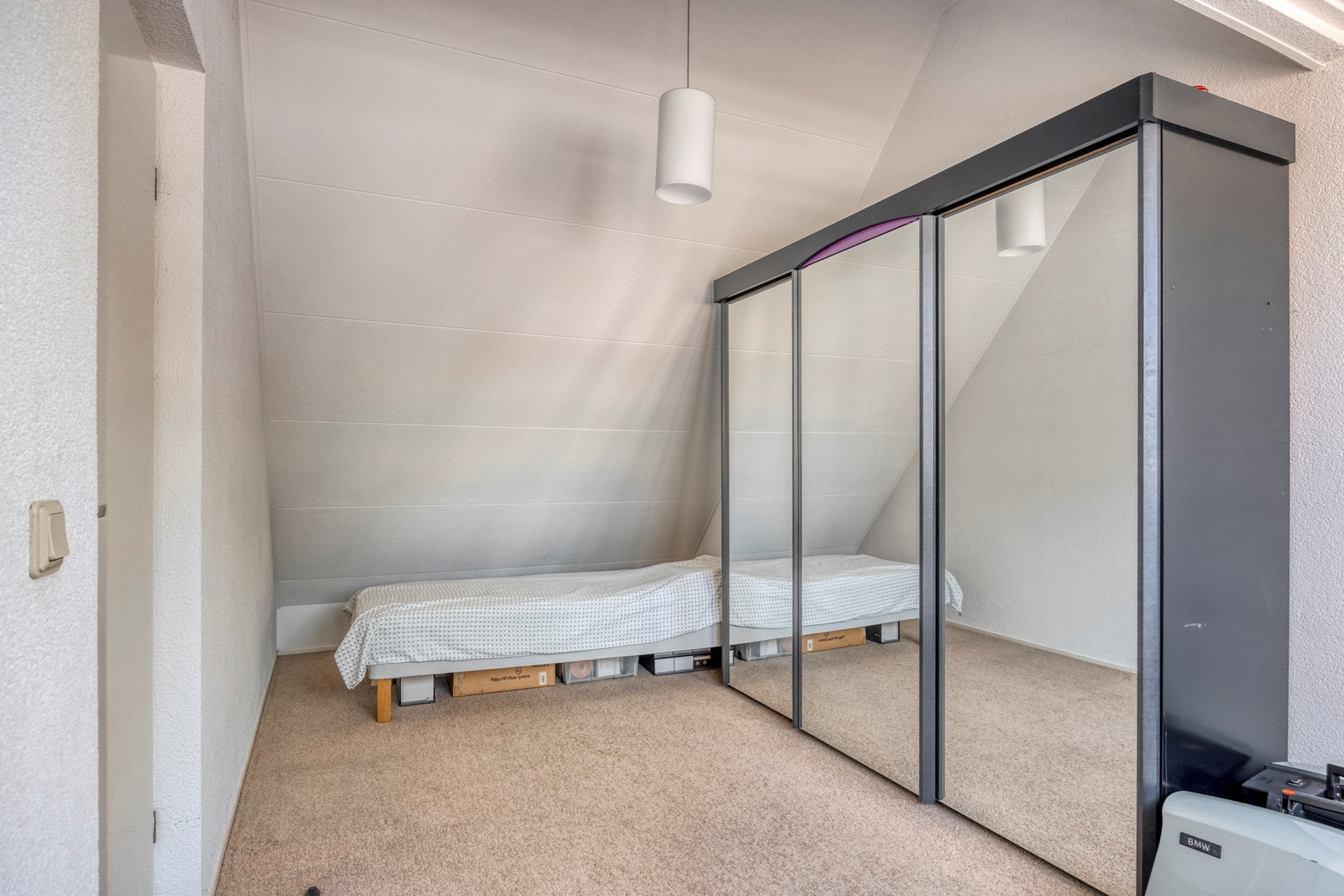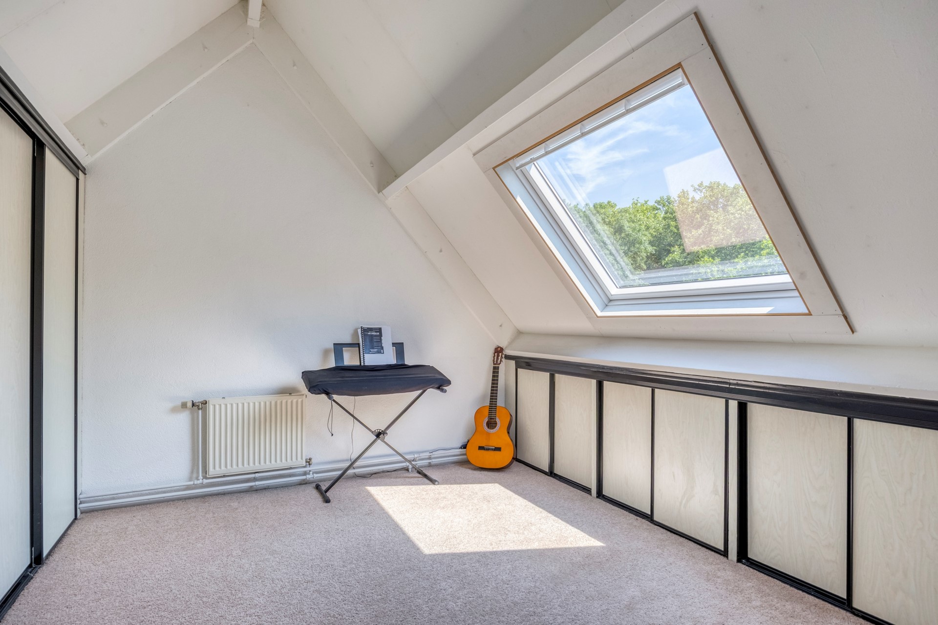 Ruime 4e slaapkamer aan de achterzijde van de woning met groot dakraam en kast- en bergruimte voorzijde.