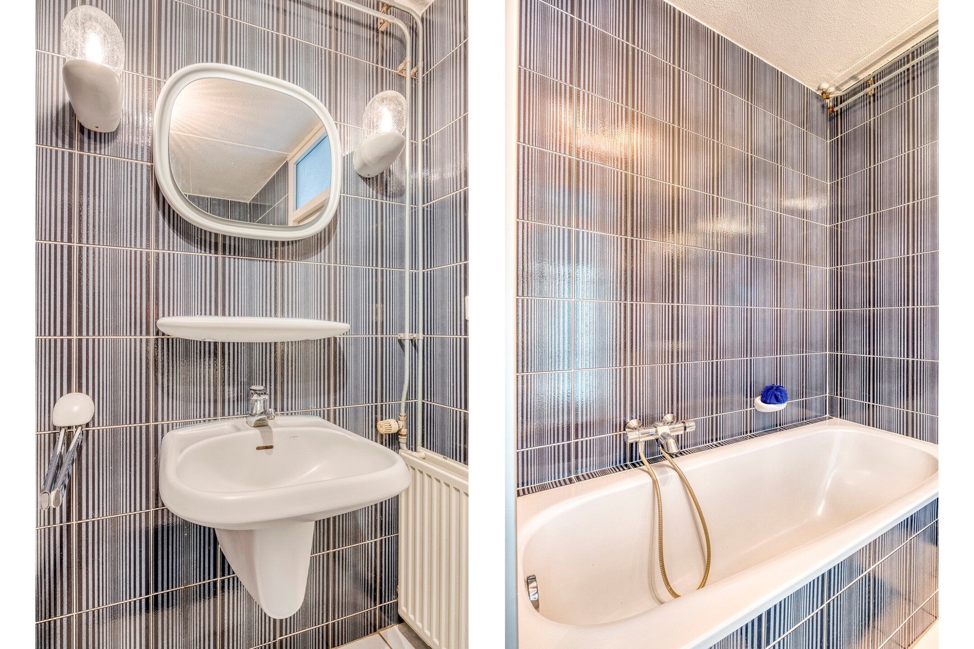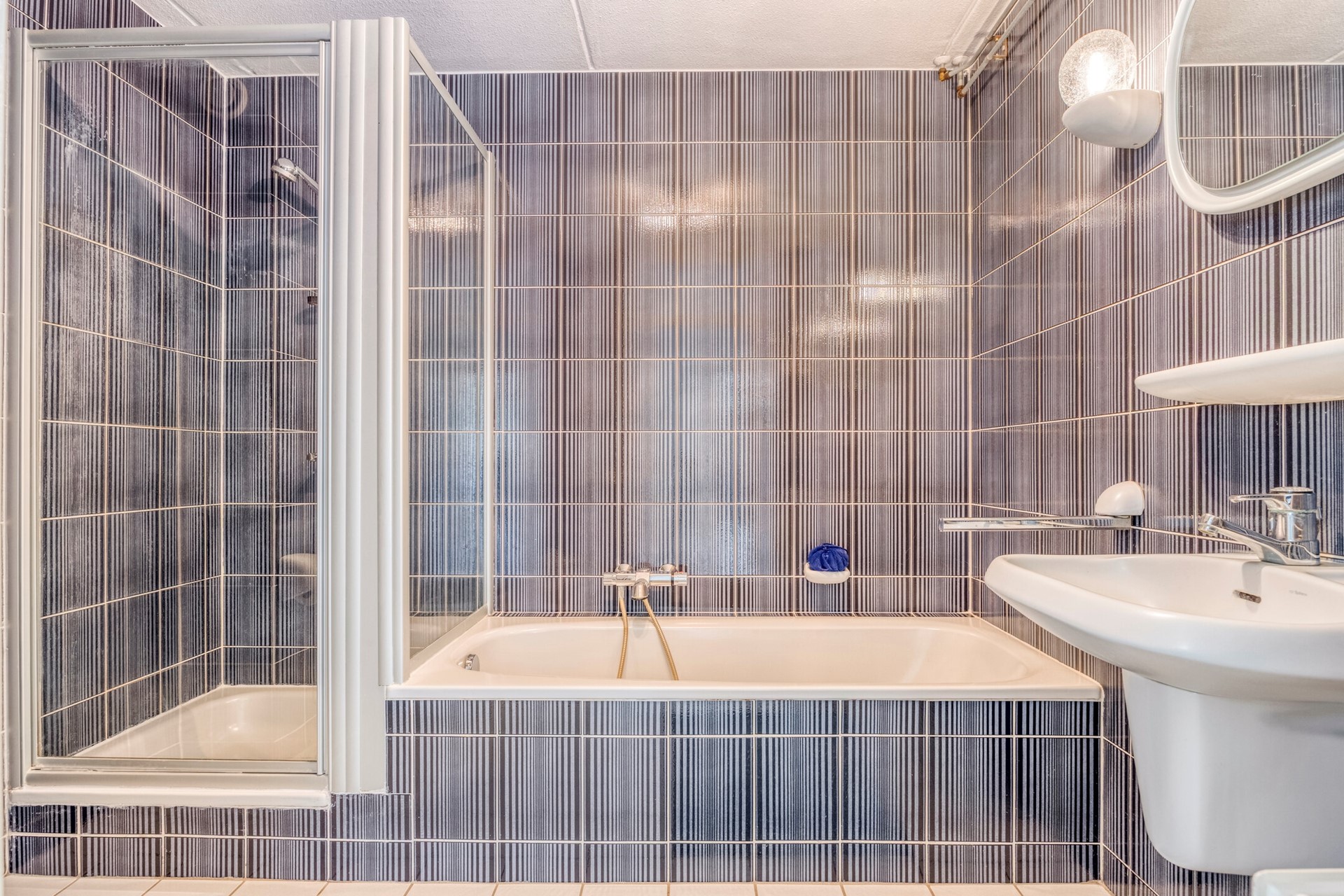 De tussengelegen betegelde badkamer is voorzien van een ligbad, separate douchecabine, vaste wastafel en