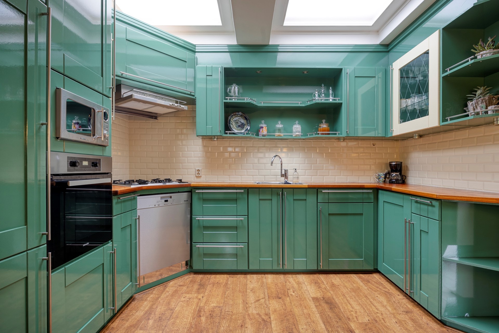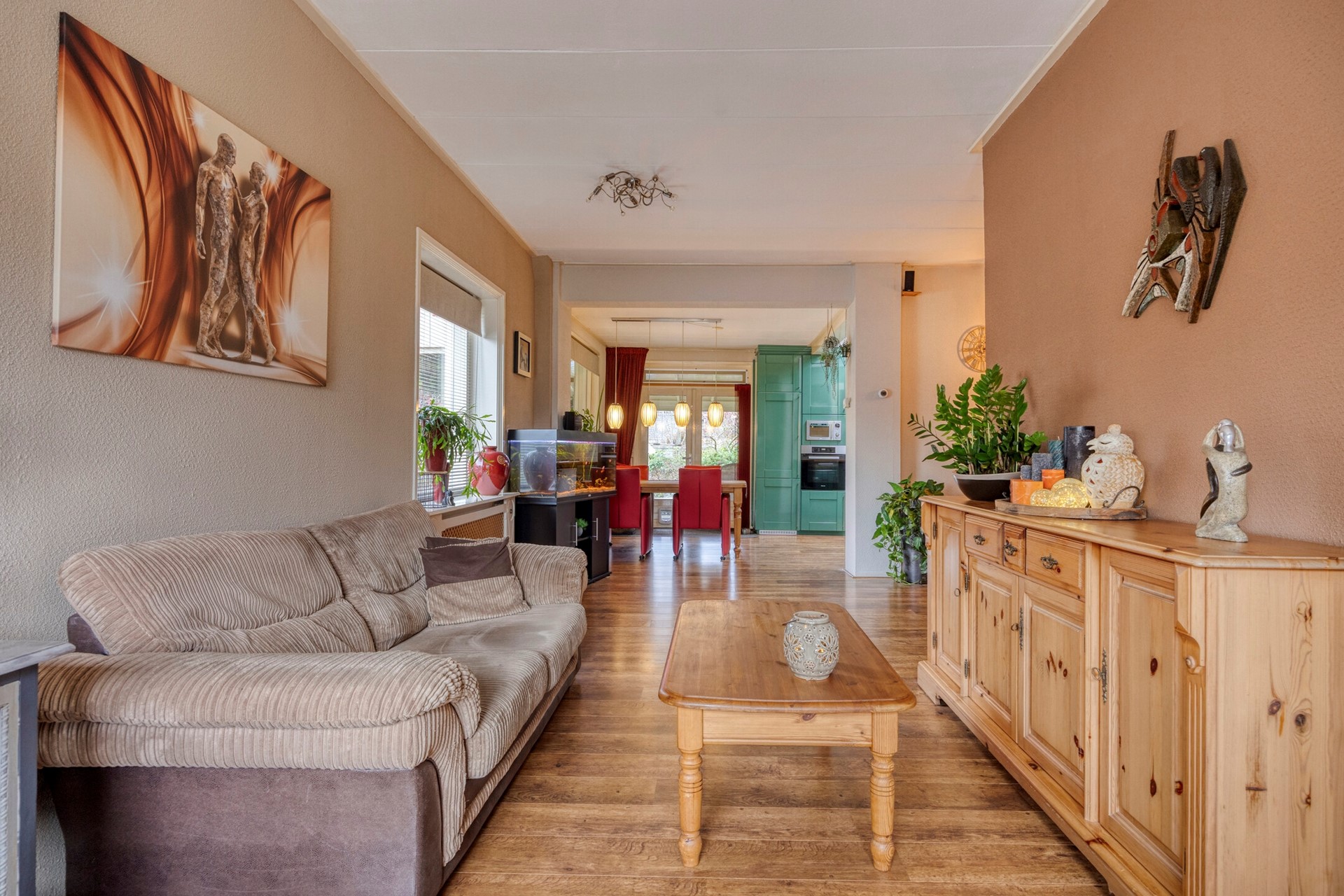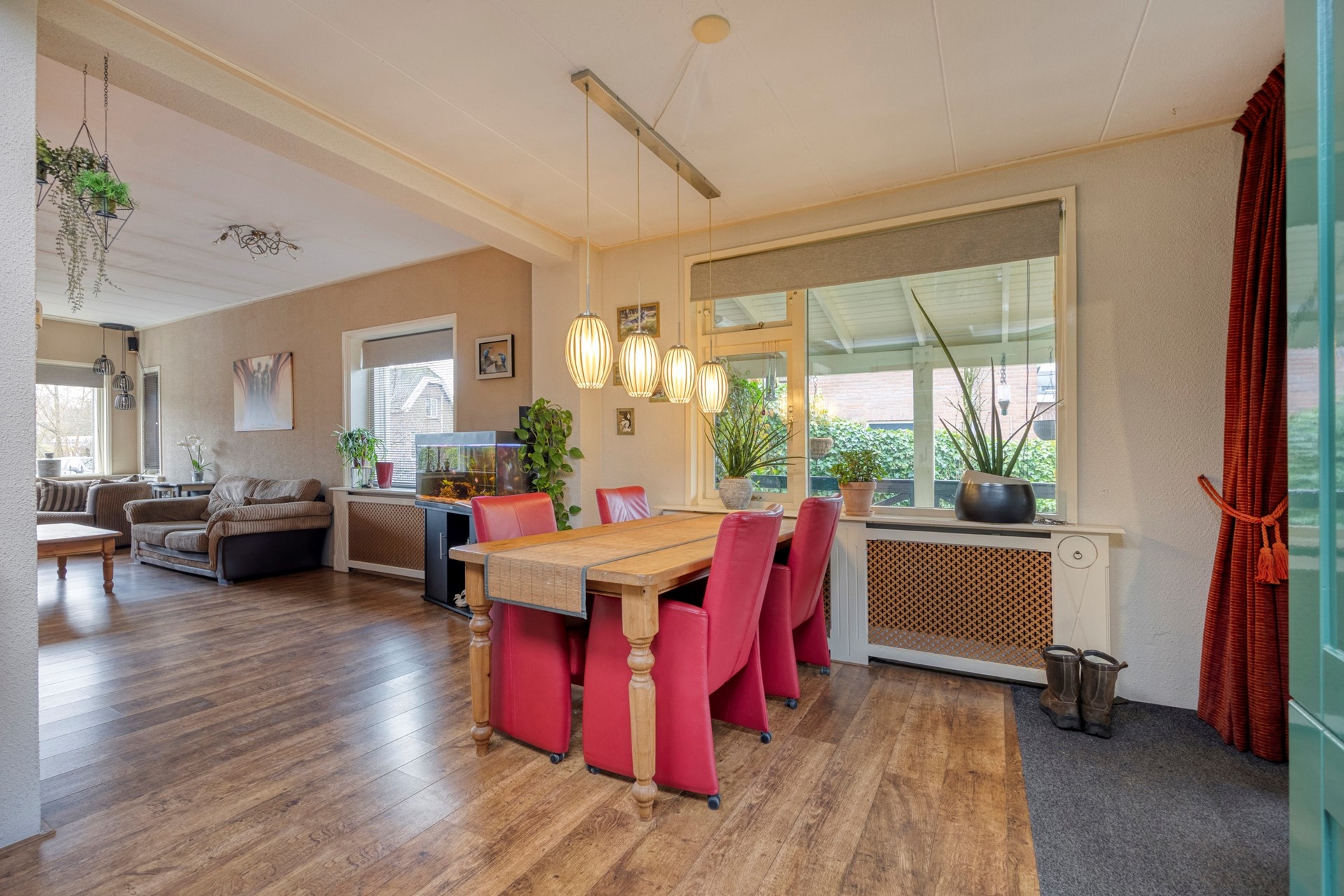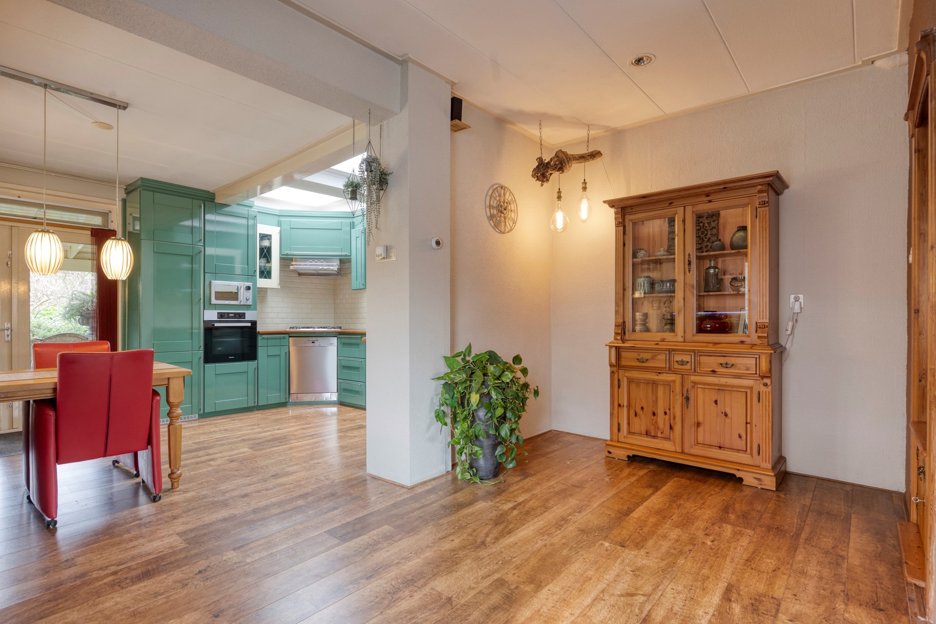 Flinke woonkamer met uitgebouwde (woon) keuken, 2 lichtkoepels in de keuken.