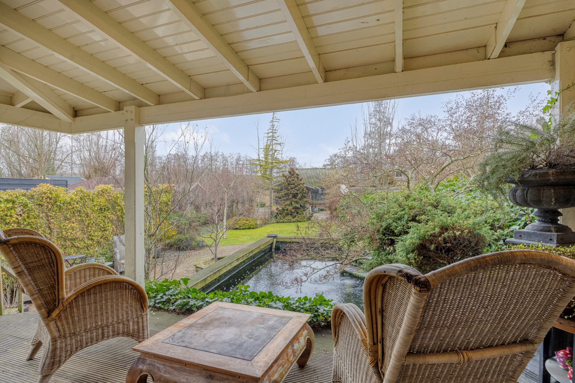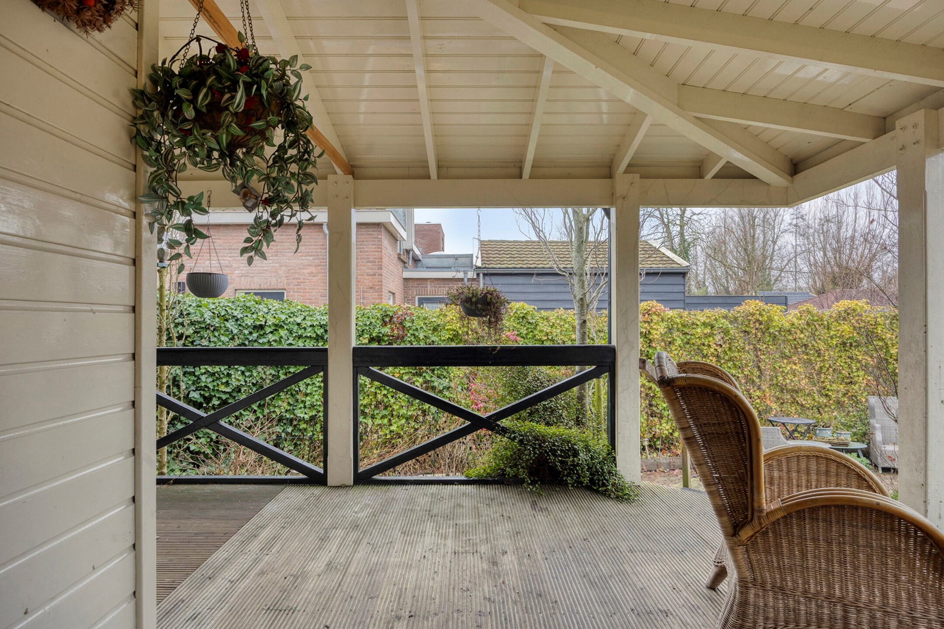 De riante overkapping/veranda geeft u de mogelijkheid om in alle rust van het uitzicht over uw tuin te genieten.