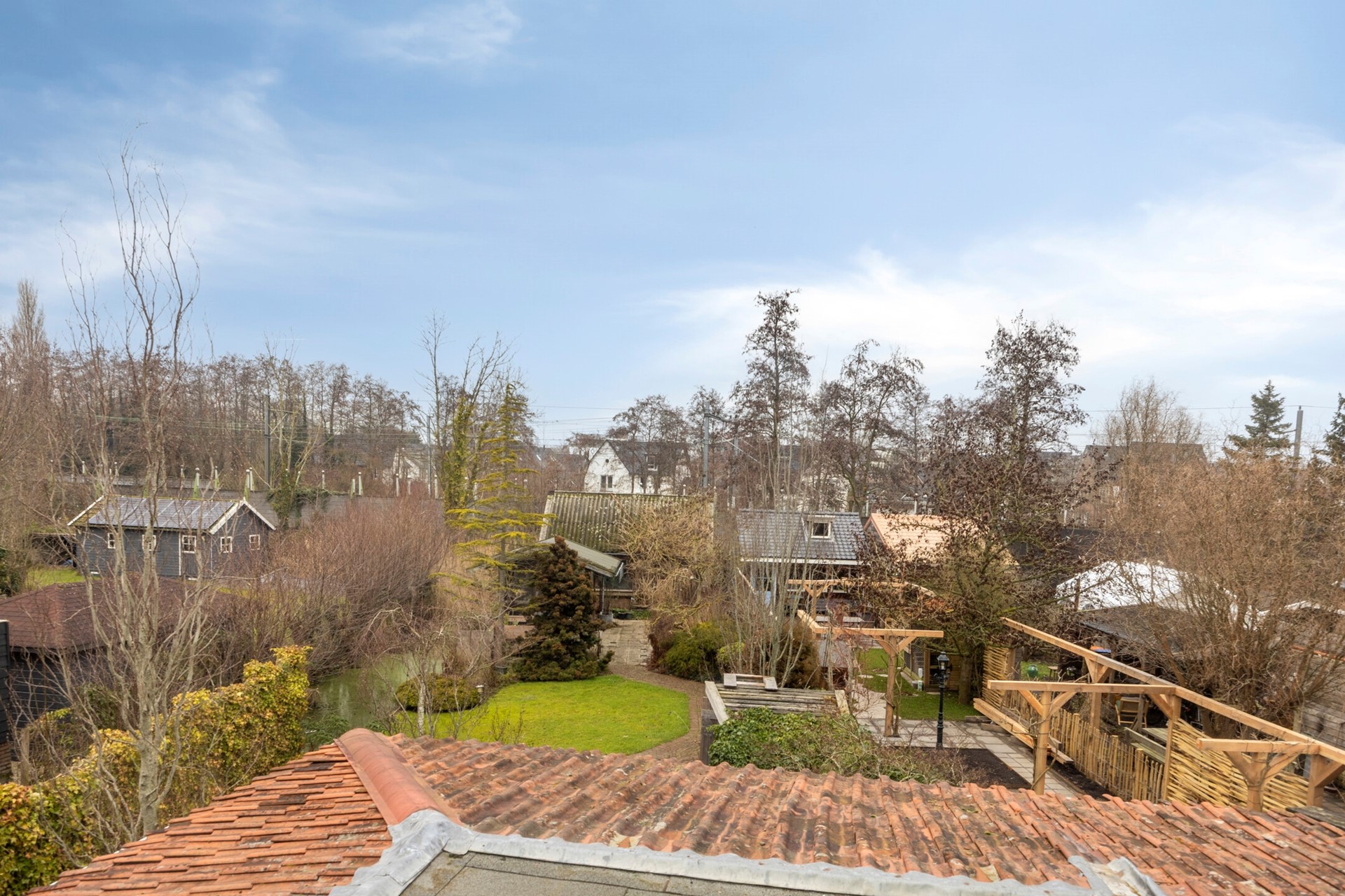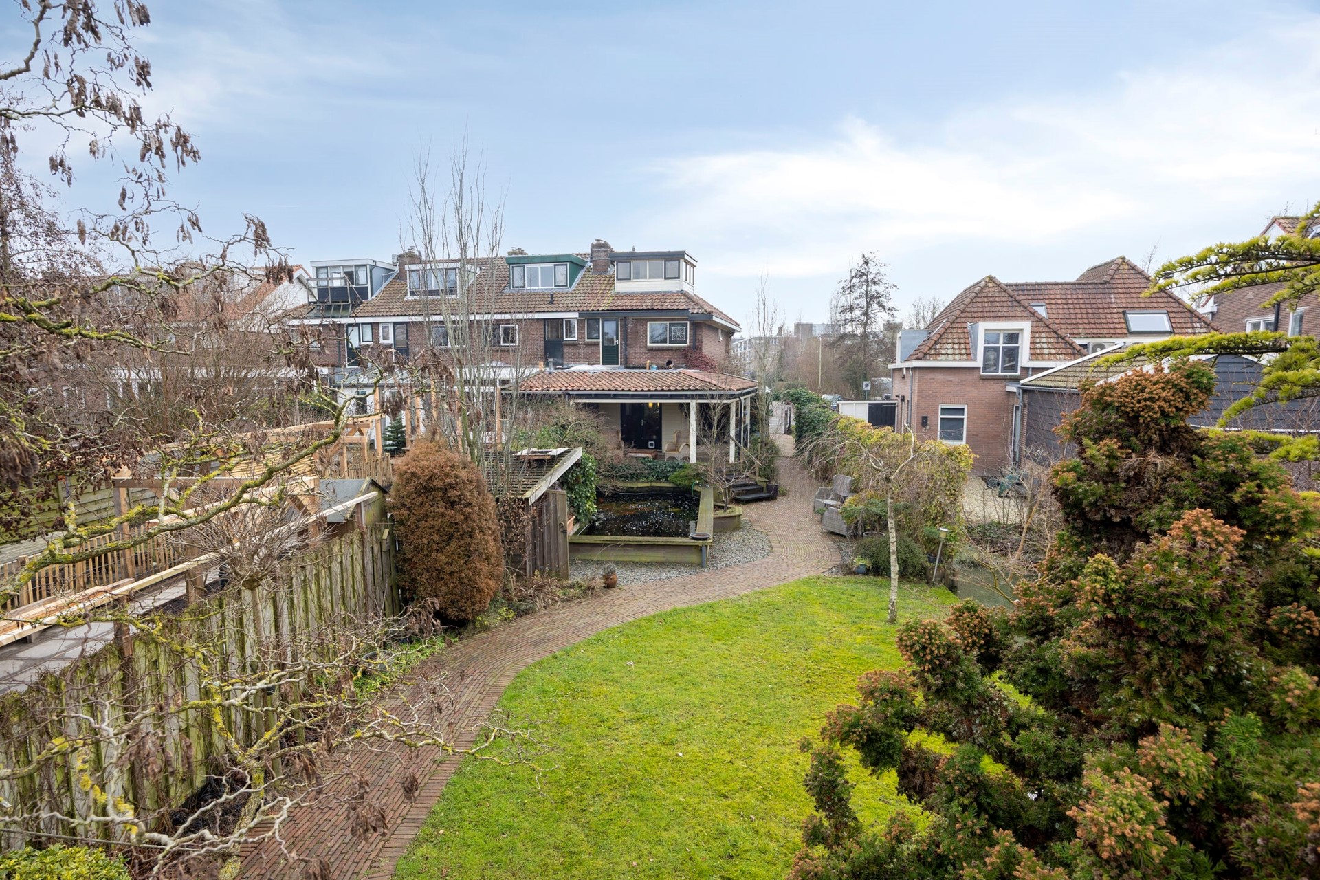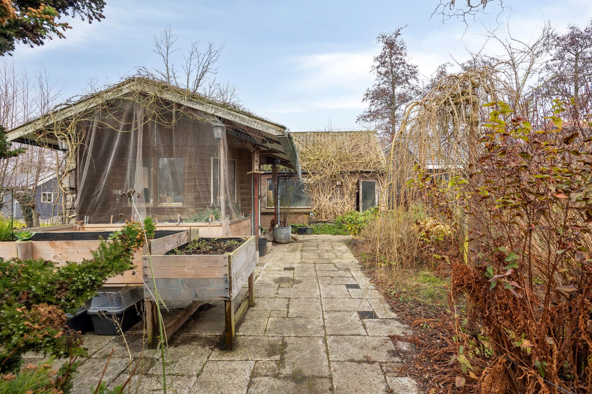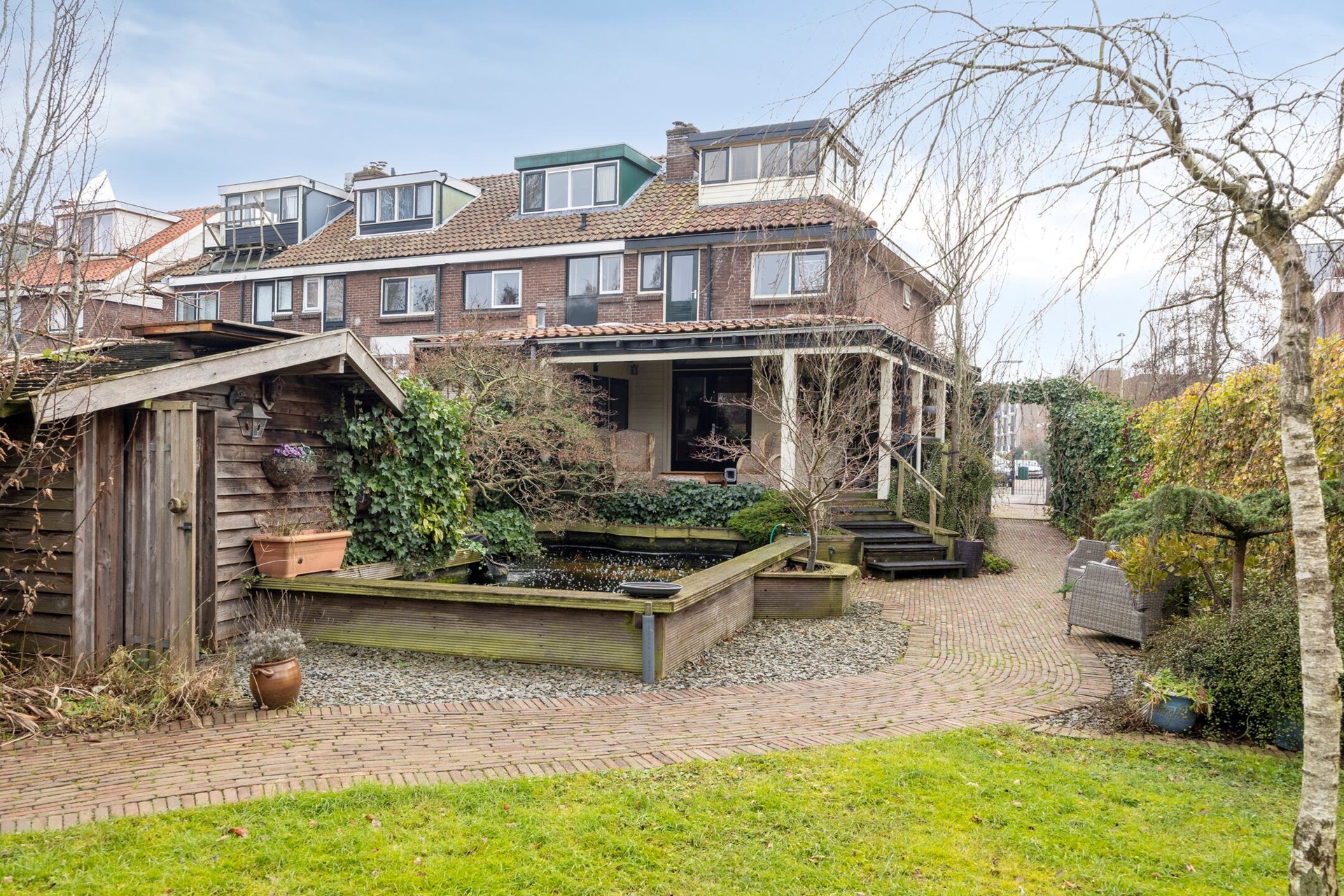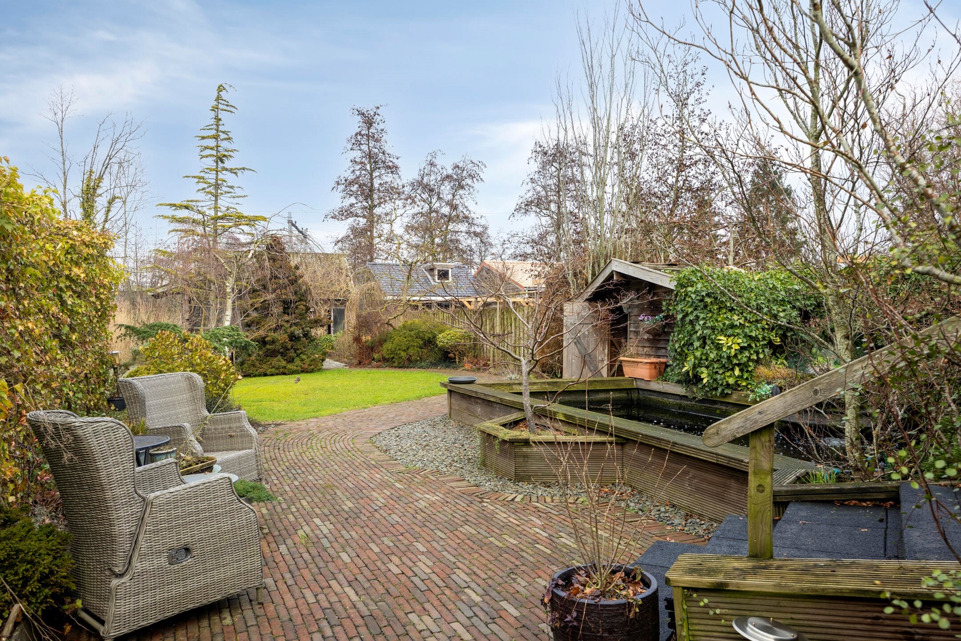 Achtertuin met op dit moment meerdere houten bergingen, kruidentuin en visvijver.