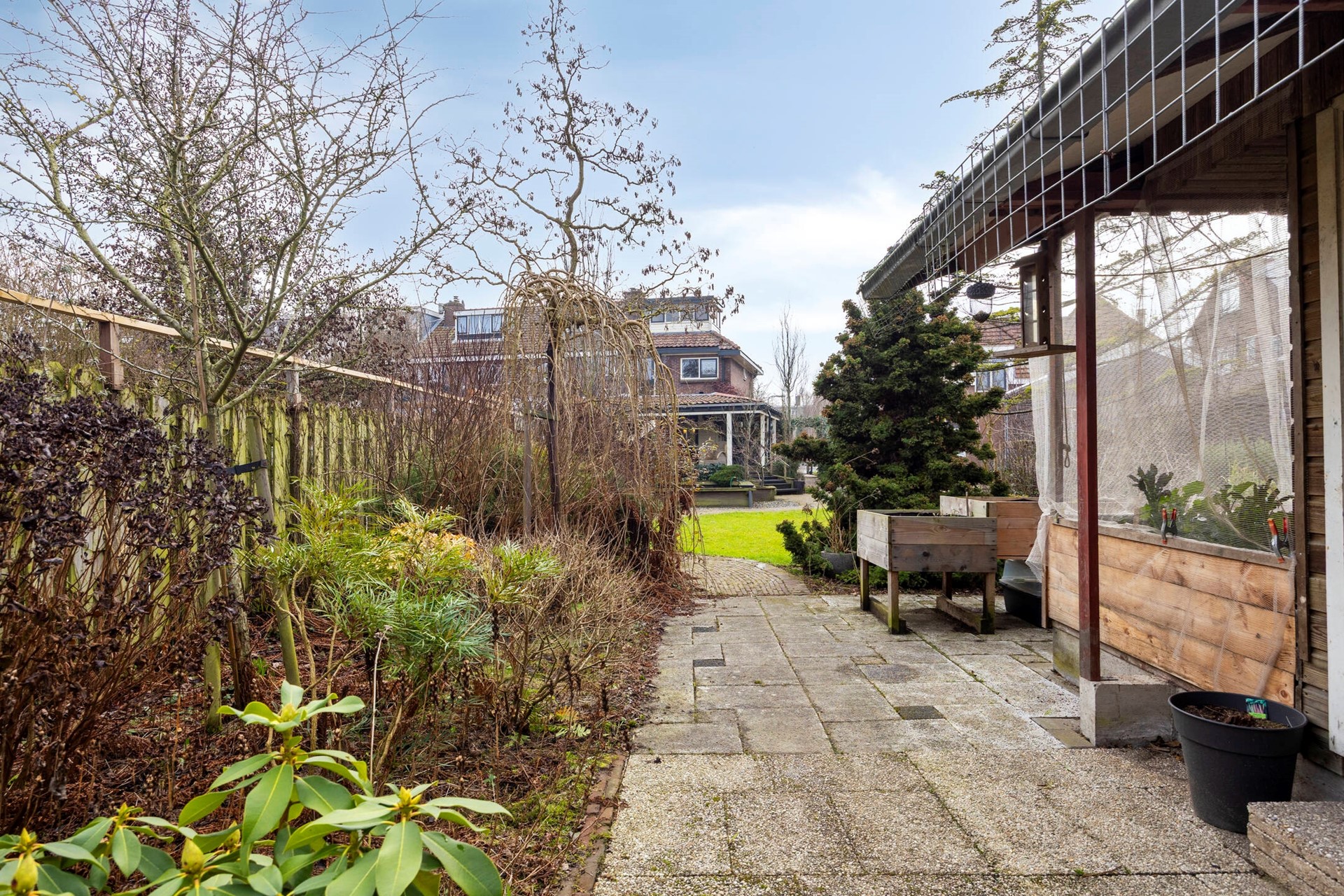 Diepe en brede achtertuin, meerdere schuren en veel privacy.