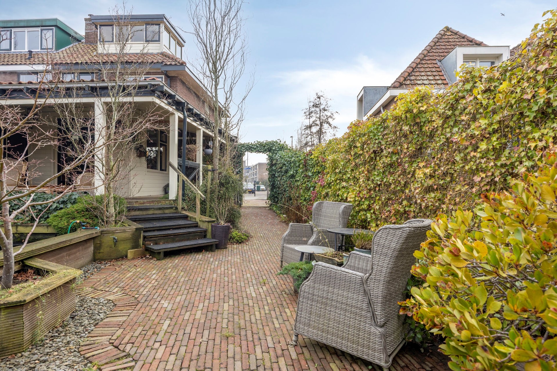 Als u de entree aan de voorzijde niet wilt gebruiken, loopt u langs de woning en via de overkapping/veranda heeft u toegang tot de woning.
