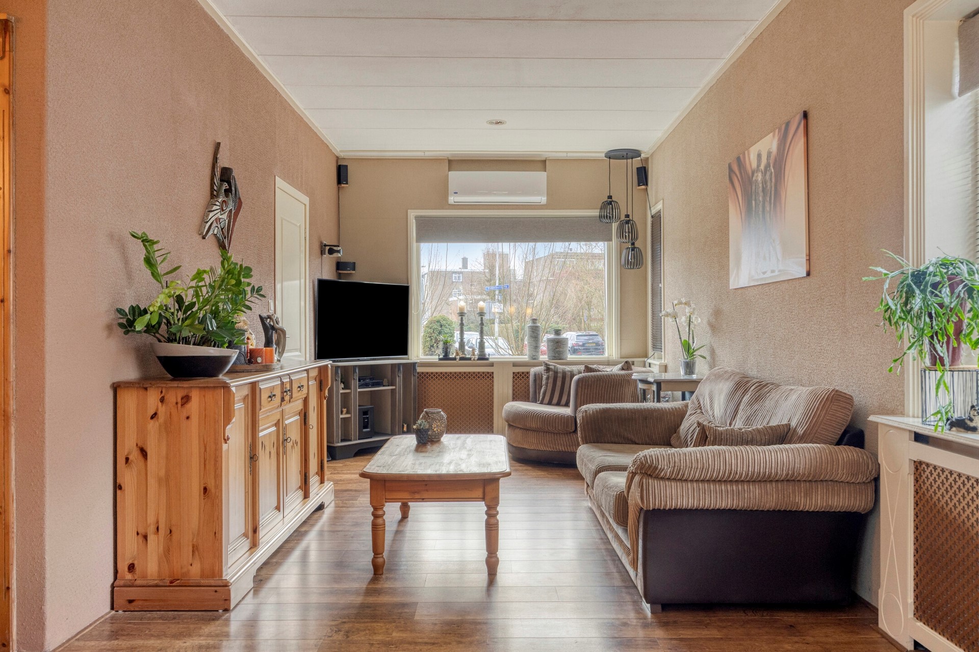 Een airco die verwarmt en koelt op de begane grond en slaapkamers op eerste verdieping.