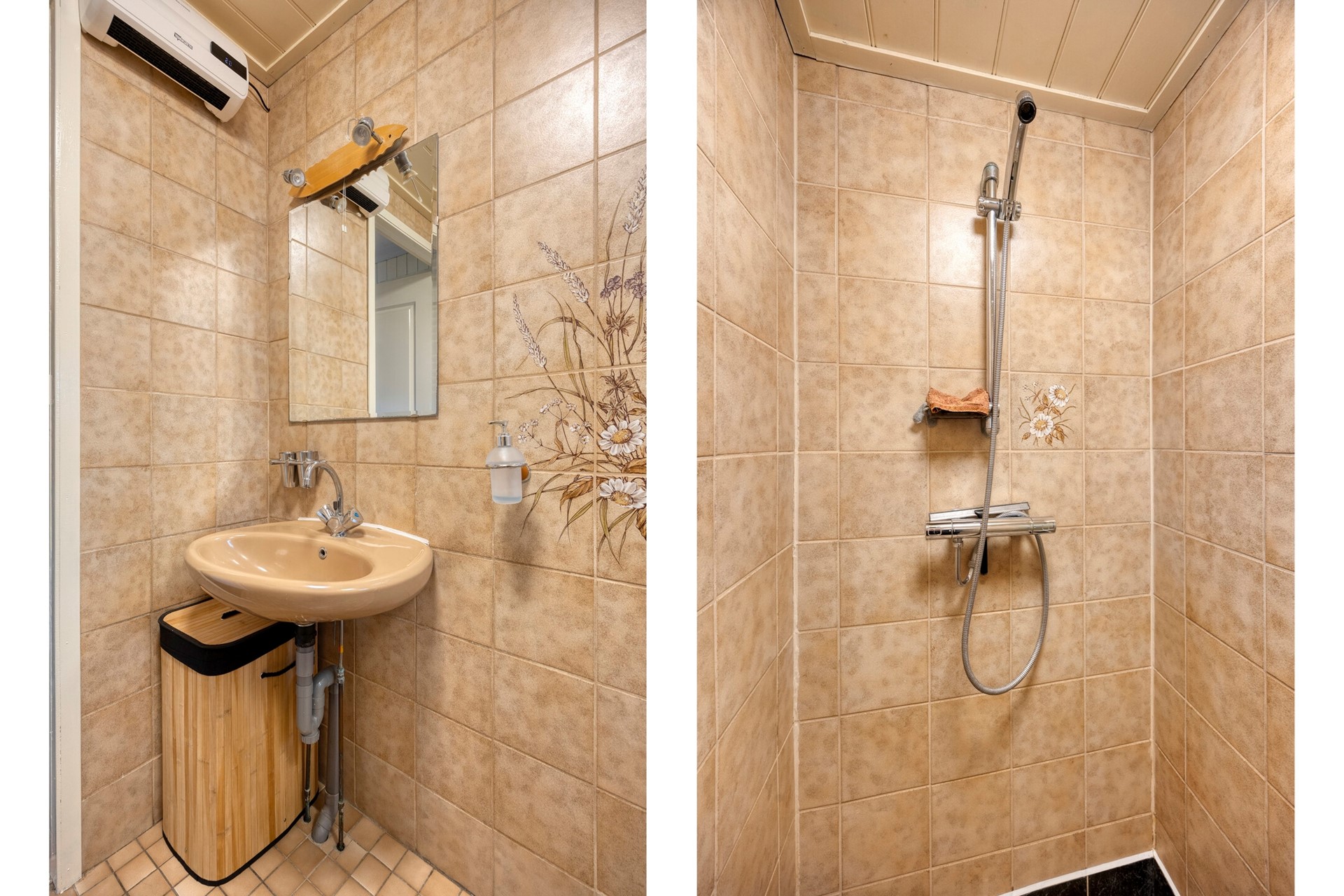 Eenvoudige badkamer, betegeld, met douchecabine, wastafel, toilet.